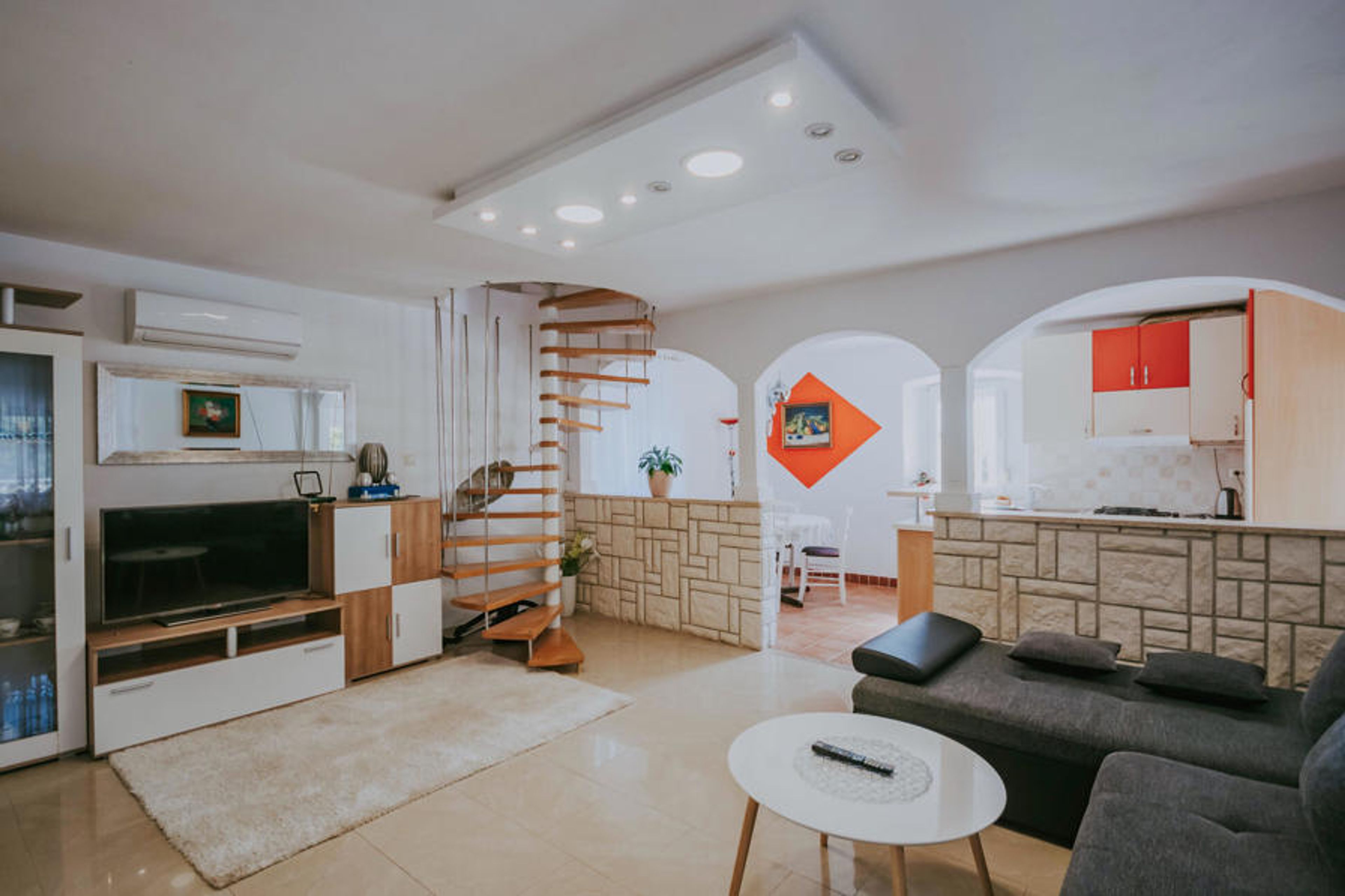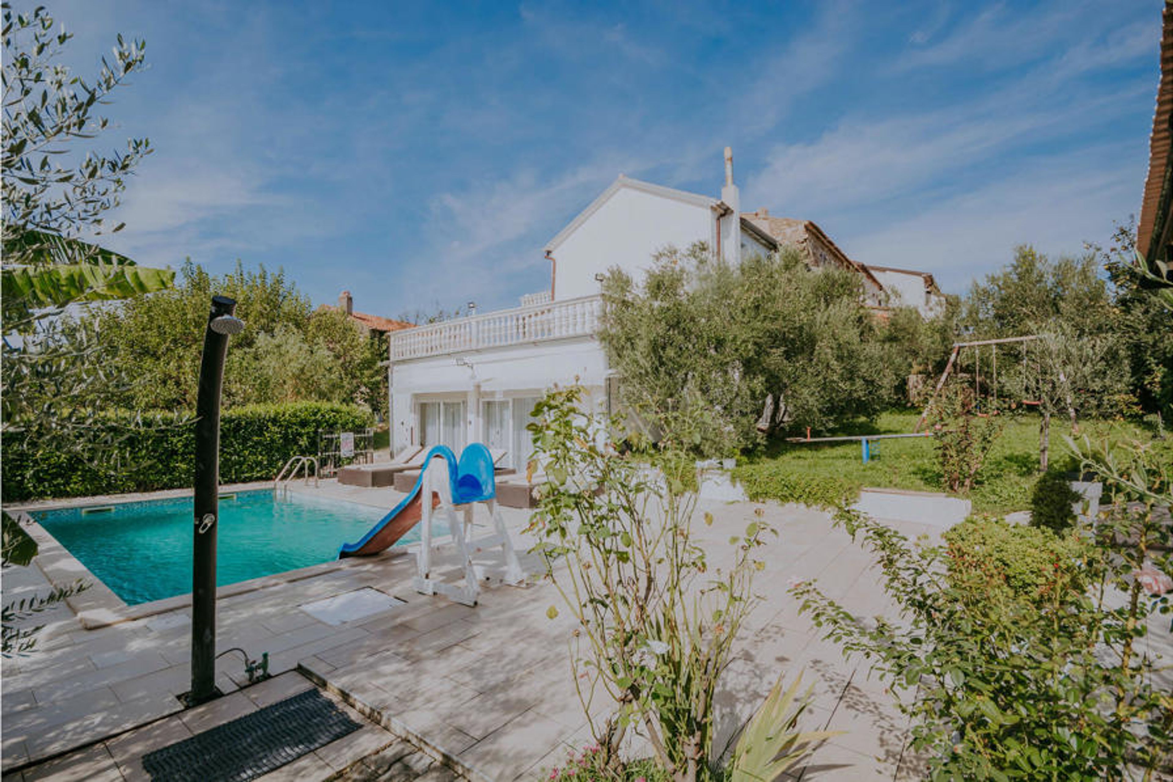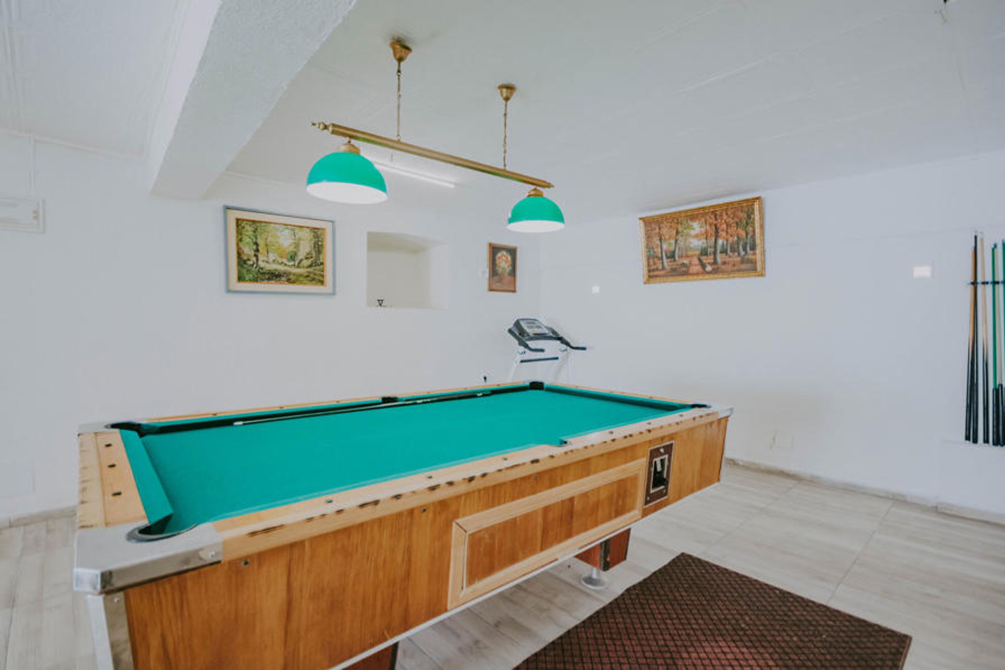 On a hill above the picturesque village of Brtonigla, surrounded by vineyards and olive groves, lies this beautiful semi-detached house with pool. Its two separate units have their own entrances. The main part of the accommodation is on the 1st and 2nd floor with spiral staircase. On the first floor there is also a small kitchen with living area from where you have direct access to the pool. In the basement you can play darts and billiards in the recreation room. Explore the interior of Istria, enjoy the gastronomic offer of local restaurants and visit the aquapark Istralandia.