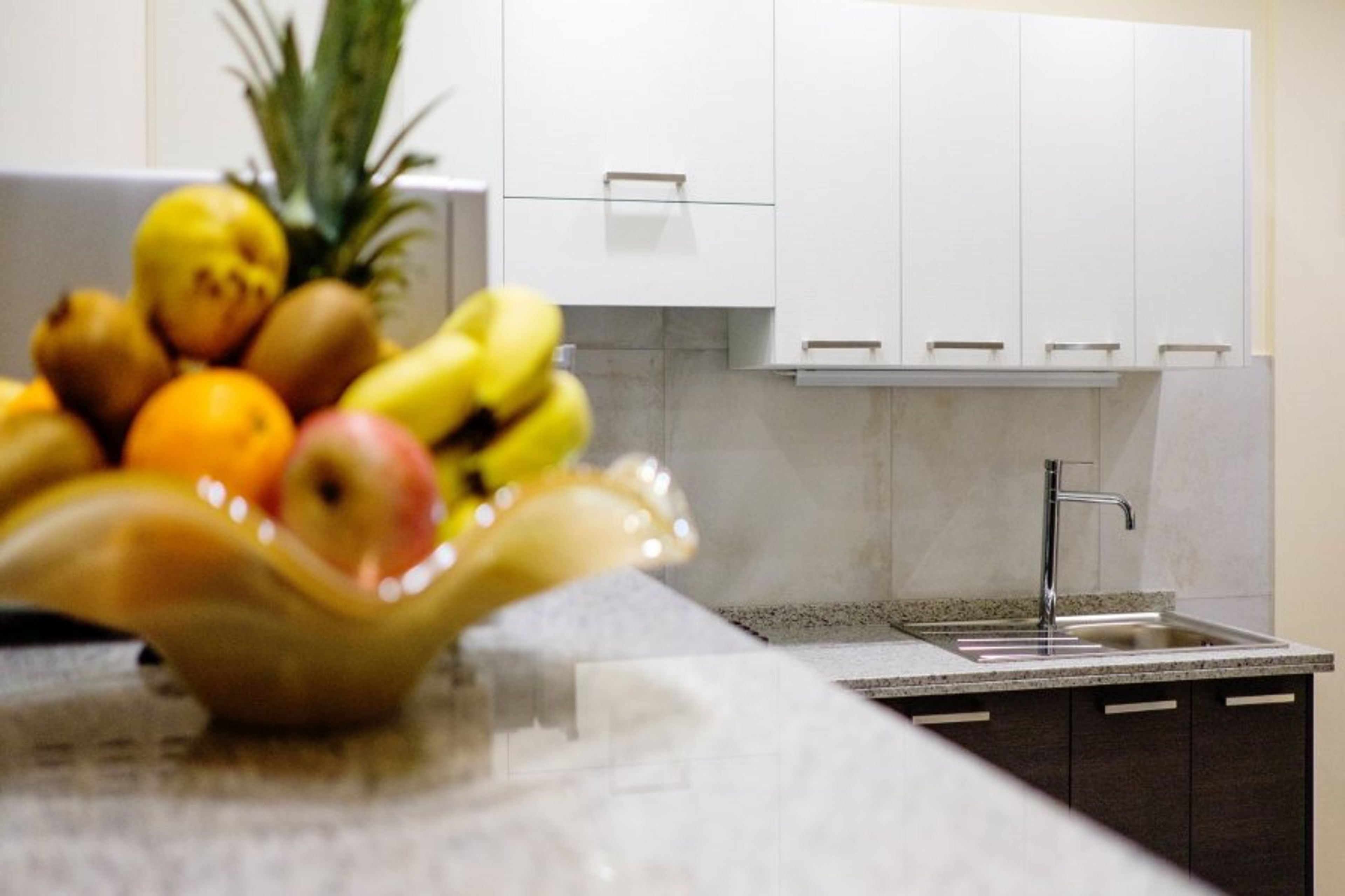 As you enter the apartment from the side entrance, there is a small corridor which leads to the open plan kitchen/diner. Here, there is a sofa, a dining table with 6 chairs, a TV, air conditioning and the fully equipped kitchen. The kitchen has an oven, 4 hobs, a dishwasher, fridge/freezer, a kettle, a coffee machine, a microwave and a toaster. There is also a cupboard with an iron and ironing board.