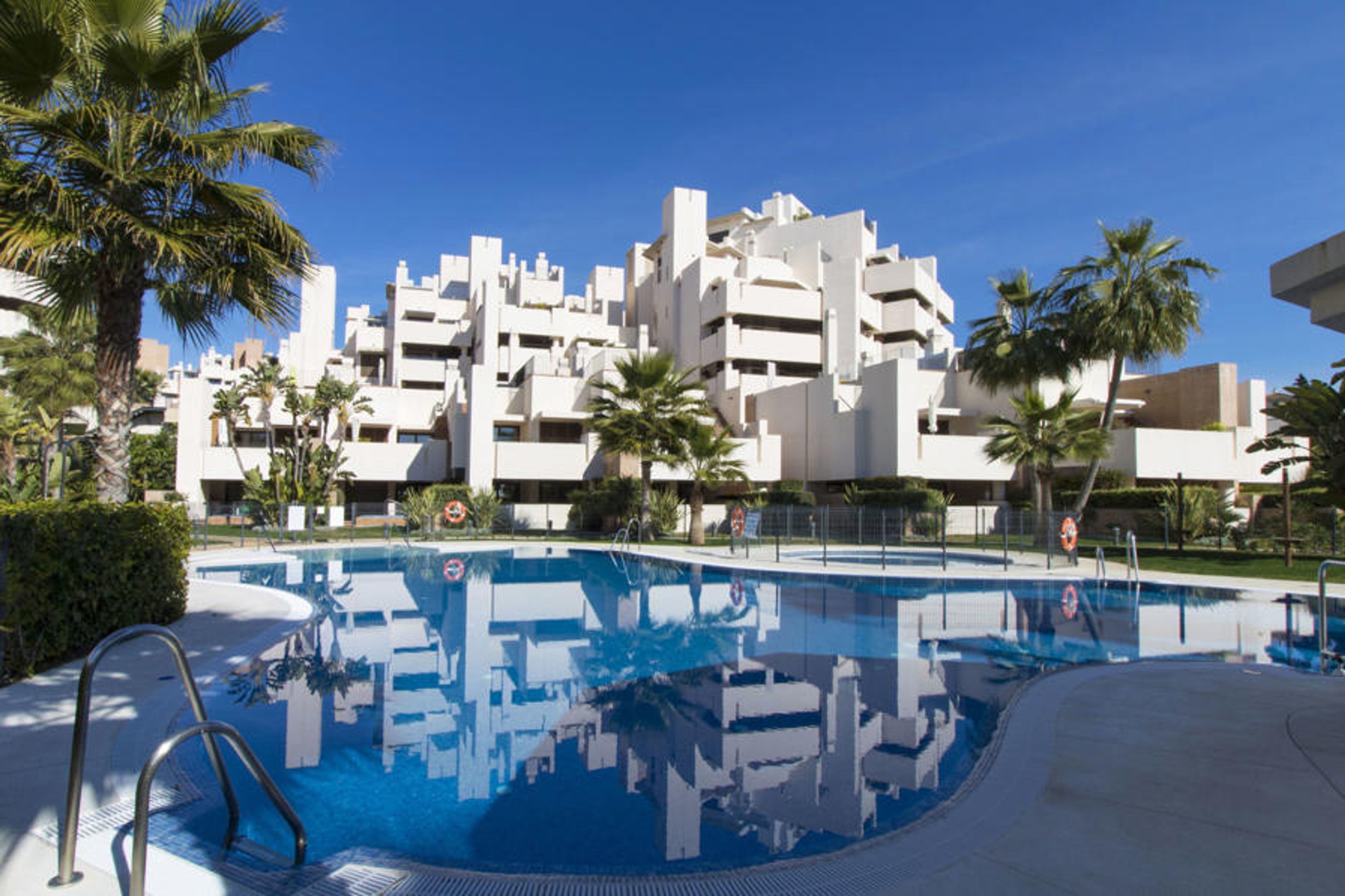 Very modern, beautiful apartment block "Bahia de la Plata". In the district Estepona, in a quiet, sunny position, 150 m from the sea, direct access to the beach, south facing position. For shared use: terraced garden, 2 swimming pools (seasonal availability: 01.Jun. - 31.Sep.). Children's pool, outdoor shower, hot tub. In the complex: fitness room. Parking. Shop 1 km, supermarket 1 km, shopping centre 10 km, restaurant 1 km, bar 1 km, bakery 1 km, pedestrian zone 100 m, bus stop "El Padron" 350 m. Golf course (18 hole) 4 km. Object suitable for 4 adults. Please note: airfield 65 km from the property.