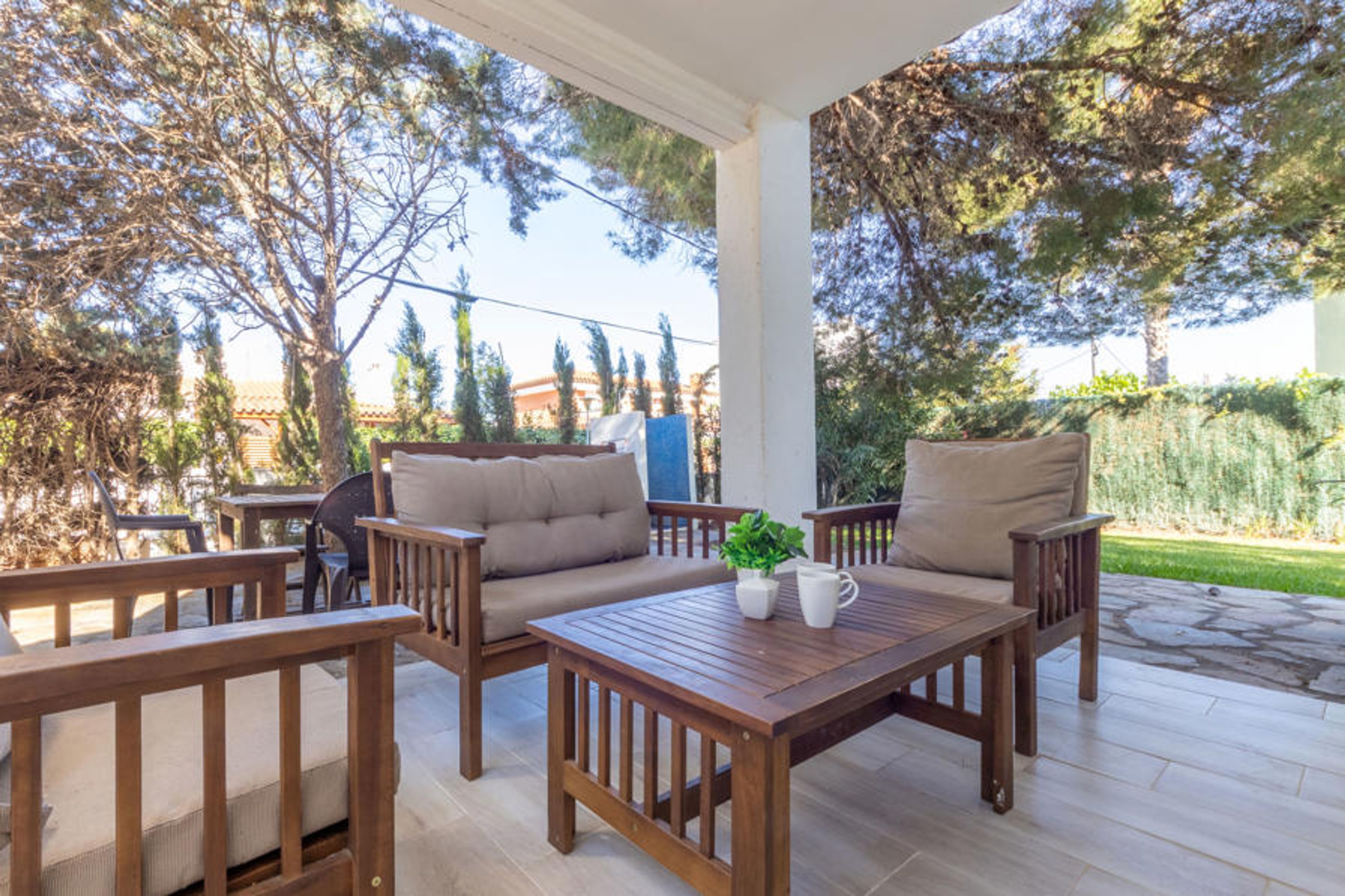 4-room house 62 m2, on the ground floor. Practical furnishings: living/dining room 18 m2 with satellite TV, digital TV, international TV channels, flat screen, CD-player, hi-fi system and DVD. Exit to the patio. 1 room 11 m2 with 1 french bed (135 cm). 1 room 7 m2 with 1 bed (80 cm). 1 room 9 m2 with 2 beds (80 cm). Kitchen (4 hot plates, oven, kettle, microwave, electric coffee machine) with dining table. Bath/bidet/WC. No heating option. Terrace furniture, barbecue. View of the garden. Facilities: washing machine. Parking (fenced), garage on the property. Maximum 2 pets/ dogs allowed. HUTT-006365 // Reg. Nr.: ESFCTU00004303100001593500000000000000000HUTT-0063652
