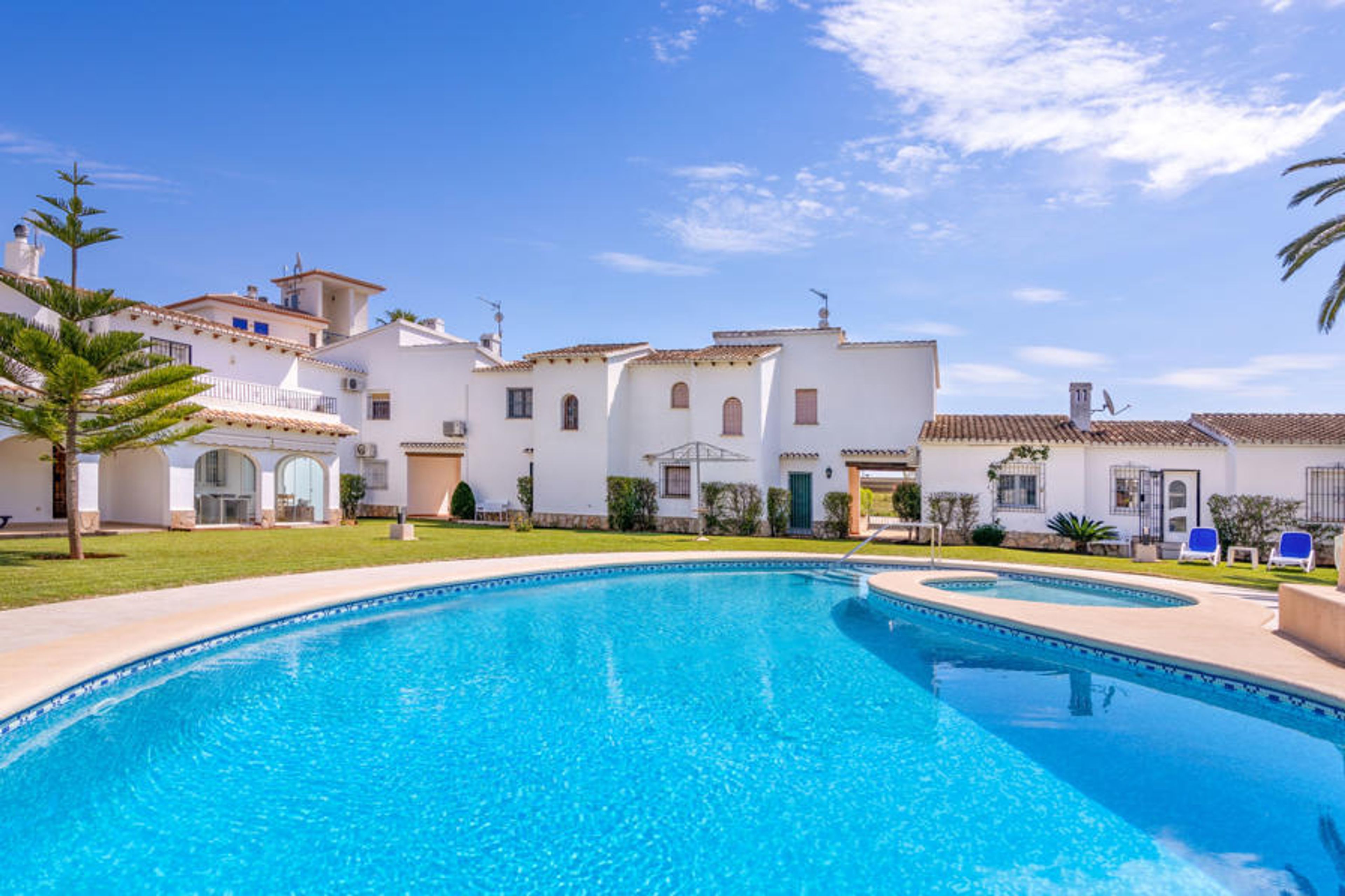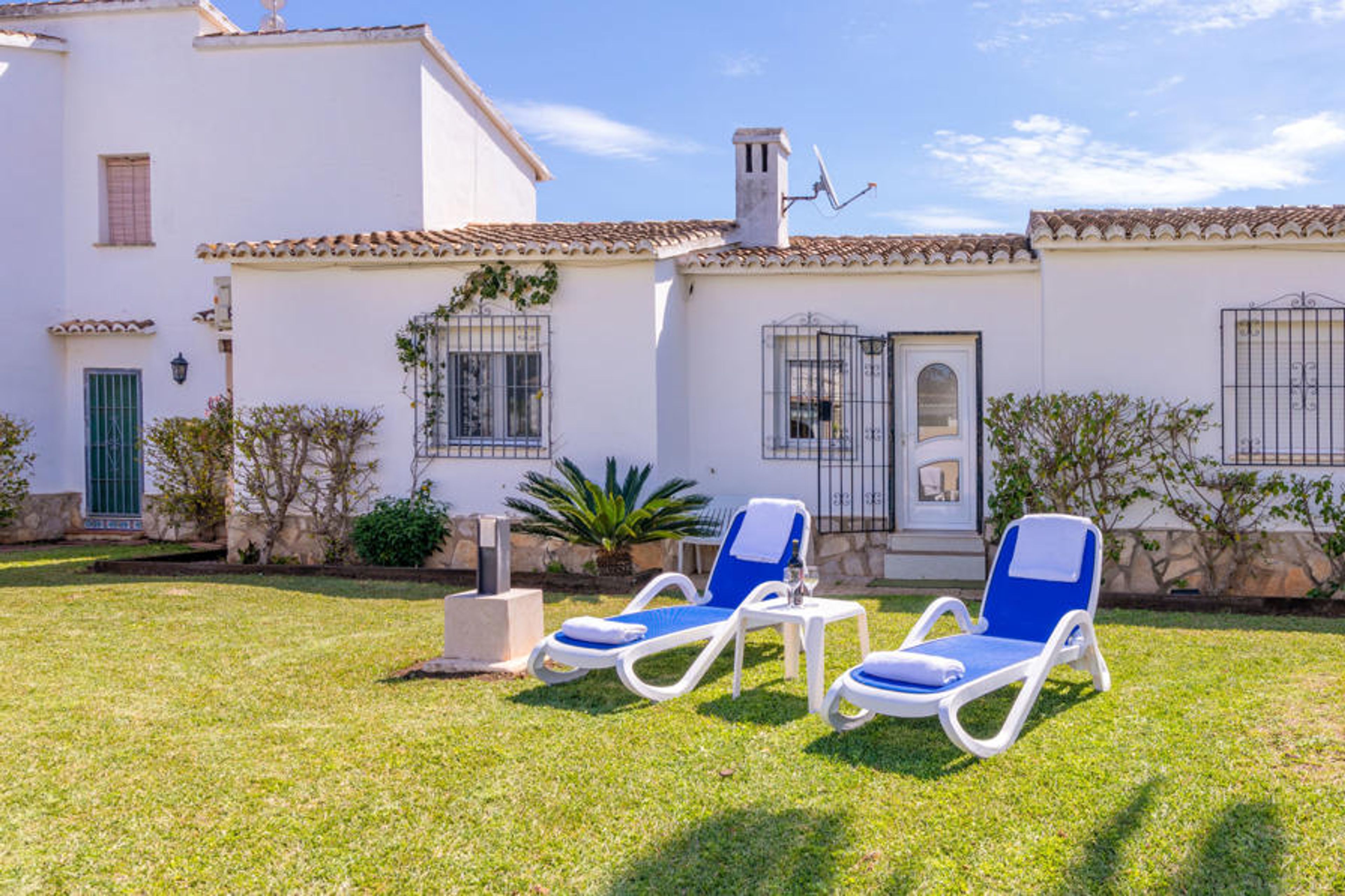 Small, beautiful, cosy terraced house "Pueblo Andaluz". 10 km from the centre of Dénia, in a quiet position, 300 m from the sea, road to cross. For shared use: large, well-kept garden with lawn and plants, swimming pool (depth 80 - 220 cm, seasonal availability: 01.Jan. - 31.Dec.). Children's pool, outdoor shower, public car park. Supermarket 900 m, restaurant 600 m, bar, café 600 m, bus stop 100 m, sandy beach 300 m, shingle beach 800 m. Golf course (18 hole) 8 km. The owner does not accept any youth groups.
