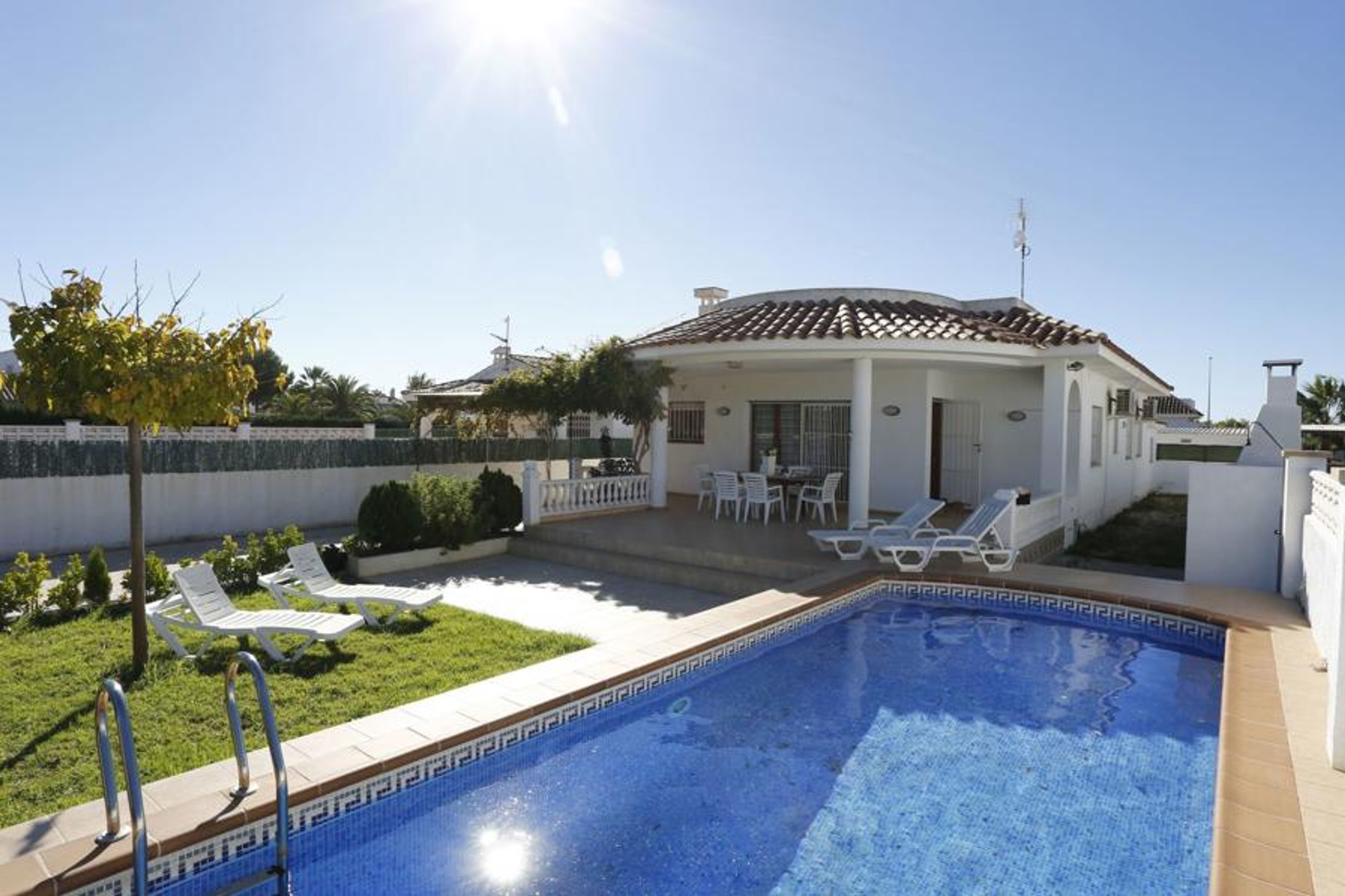 Riumar 10 km from Deltebre: Cosy, comfortable house "Sandra". In a quiet, sunny position, 500 m from the sea, 500 m from the beach. Private: property (fenced), natural garden, swimming pool angular (7 x 4 m, depth 160 cm, seasonal availability: 01.Jan. - 31.Dec.) with internal staircase. Outdoor shower, pergola, terrace, garden furniture, barbecue. In the house: WiFi, air conditioning, washing machine. Parking (for 2 cars). Supermarket 500 m, restaurant, bar 300 m, bakery 600 m, café 800 m, bus stop "Riumar" 650 m, railway station "Aldea- Amposta" 25 km, sandy beach "Riumar" 500 m. Sports harbour 1 km. Nearby attractions: Port Aventura 75 km, Tortosa 35 km, Playa el Trabucador 29 km, Barcelona 190 km. Hiking paths: Parque natural Puerto Tortosa Beseit 52 km, GR 92 15 km. Please note: car recommended. Groups of teenagers on request only.