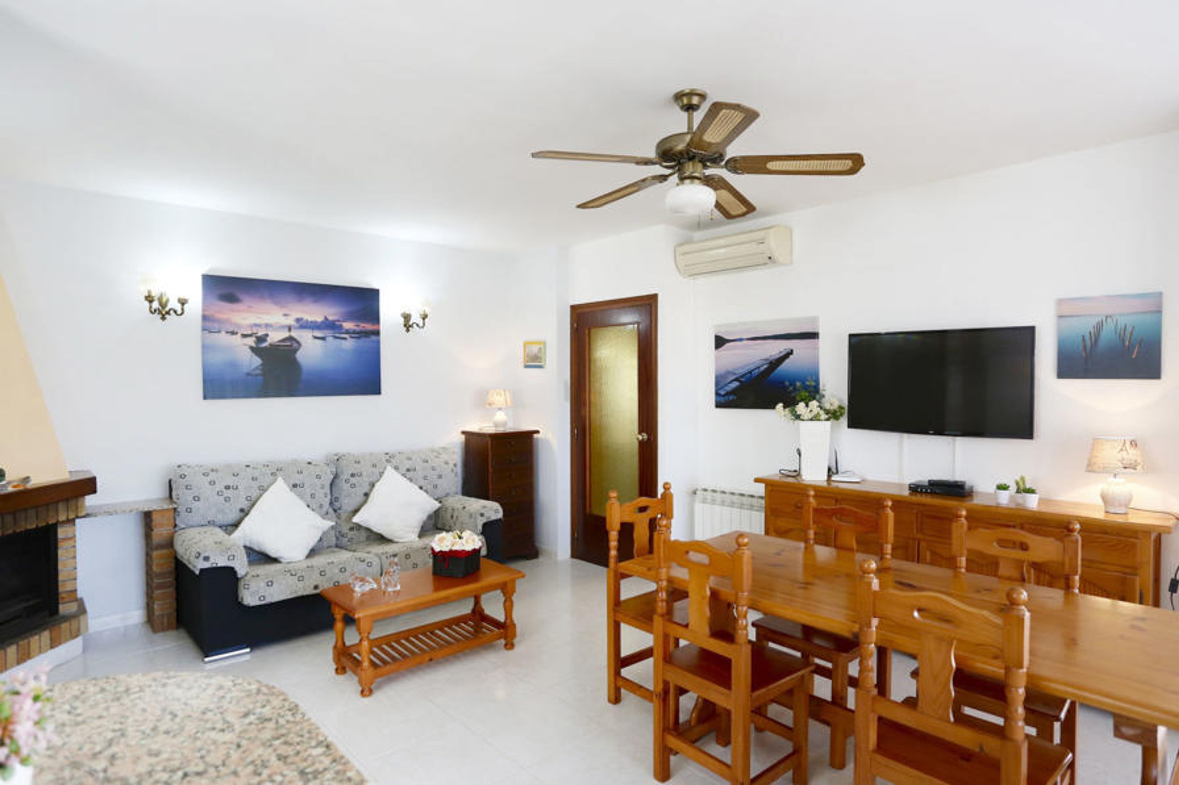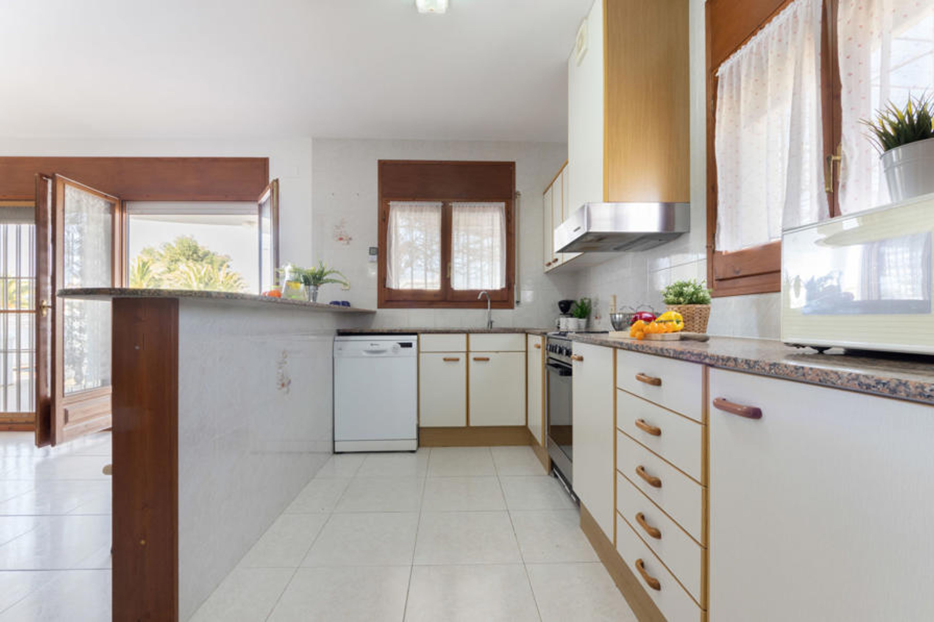 5-room house 100 m2, lower ground floor. Spacious, comfortable and cosy furnishings: living/dining room with dining table, digital TV, international TV channels, air conditioning and forced-air heating. Exit to the patio. 2 double bedrooms, each room with 1 french bed (135 cm, length 190 cm). 2 rooms, each room with 2 beds (90 cm, length 190 cm). Open kitchen (4 hot plates, oven, dishwasher, toaster, microwave, freezer, electric coffee machine) with bar. Bath/bidet/WC, shower/WC. Air-conditioning, forced-air heating. Large patio. Terrace furniture, barbecue, deck chairs, covered balcony. Facilities: washing machine, iron, mosquito net. Internet (WiFi, free). Parking (fenced 2 cars). Suitable for families. Maximum 2 pets/ dogs allowed. HUTTE000338 // Reg. Nr.: ESFCTU0000430190002188600000000000000000HUTTE-0003389