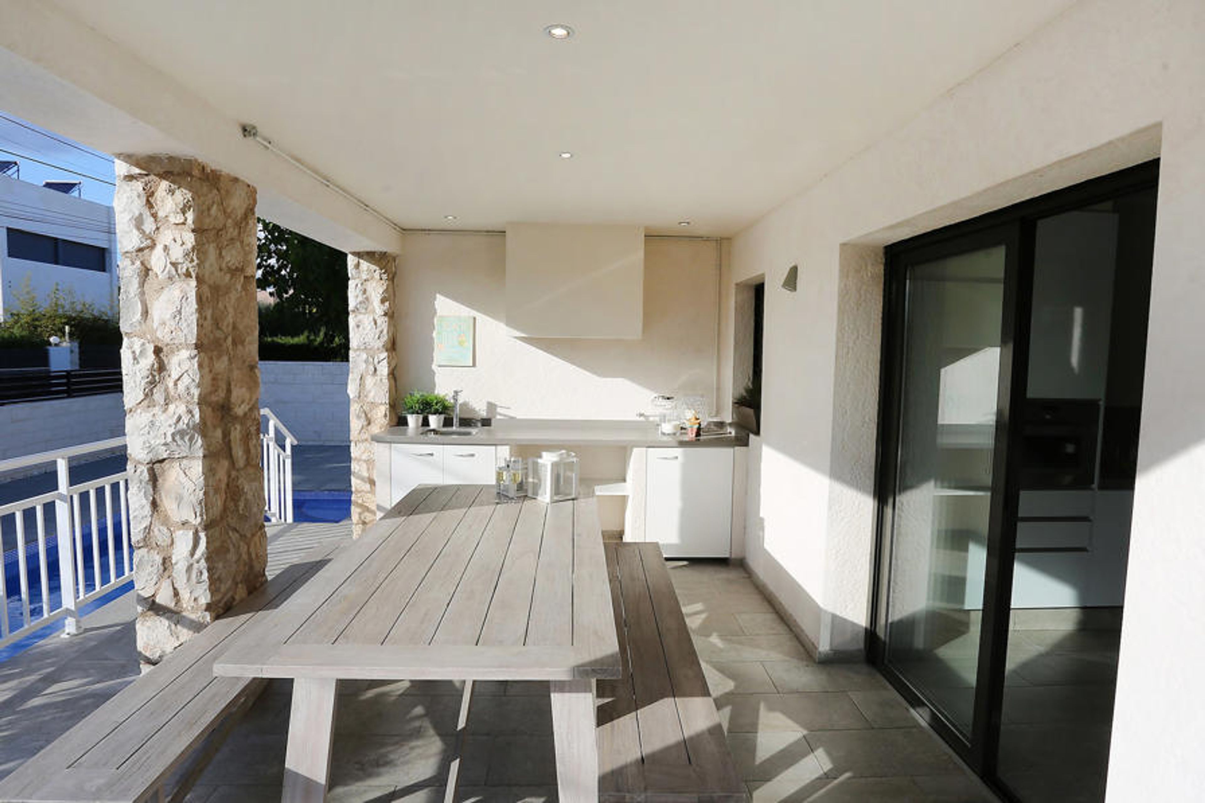 Cambrils Badia 1 km from Cambrils: Very modern, beautiful house "Gunella", detached, renovated in 2014. Outside the resort Cambrils, 300 m from the sea, 300 m from the beach. Private: property (fenced), garden with lawn, swimming pool (7 x 3 m, seasonal availability: 01.Jan. - 31.Dec.) with internal staircase. Shower/WC in the pool area, terrace, garden furniture, barbecue, pool maintenance by the owner/gardener. Parking at the house, public parking on the road. Shop 1 km, grocery 200 m, supermarket 600 m, restaurant 1 km, bus stop 400 m, railway station 3 km. Sports harbour 1 km. Nearby attractions: Port Aventura 3 km, Aquopolis 6 km. Please note: baby equipment (included). Groups of teenagers on request only.