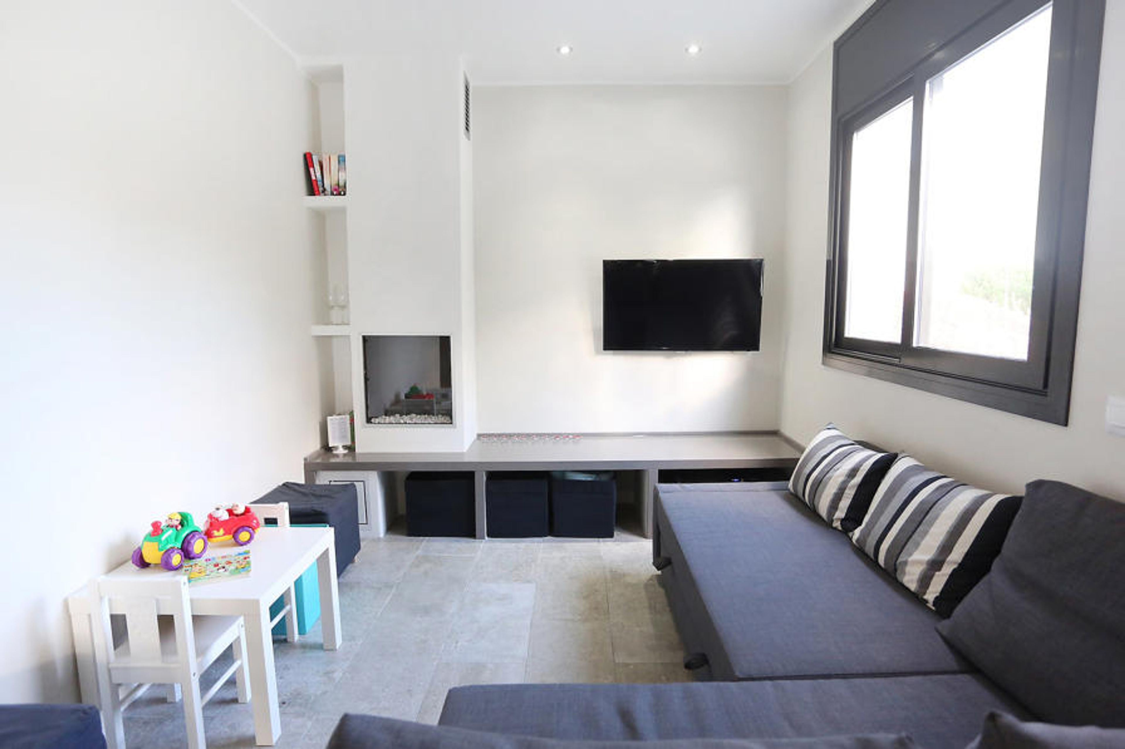 4-room house 120 m2, on the upper ground floor. Fully renovated in 2014, modern and tasteful furnishings: open living/dining room with digital TV, radio and electric shutters. Exit to the terrace. 1 room with 1 french bed (140 cm, length 190 cm), shower/WC. 1 room with 1 french bed (160 cm, length 190 cm). 1 room with 1 french bed (140 cm, length 190 cm). Open kitchen (oven, dishwasher, 4 ceramic glass hob hotplates, microwave) with dining table. Exit to the patio. Sep. WC, bath/shower/WC. Air-conditioning. No heating option. Large patio. Terrace furniture, barbecue, deck chairs (4). Facilities: washing machine, children's high chair, baby cot for up to 3 year olds. Suitable for families. HUTT-011884 // Reg. Nr.: ESFCTU00004303100004750900000000000000000HUTT-0118842