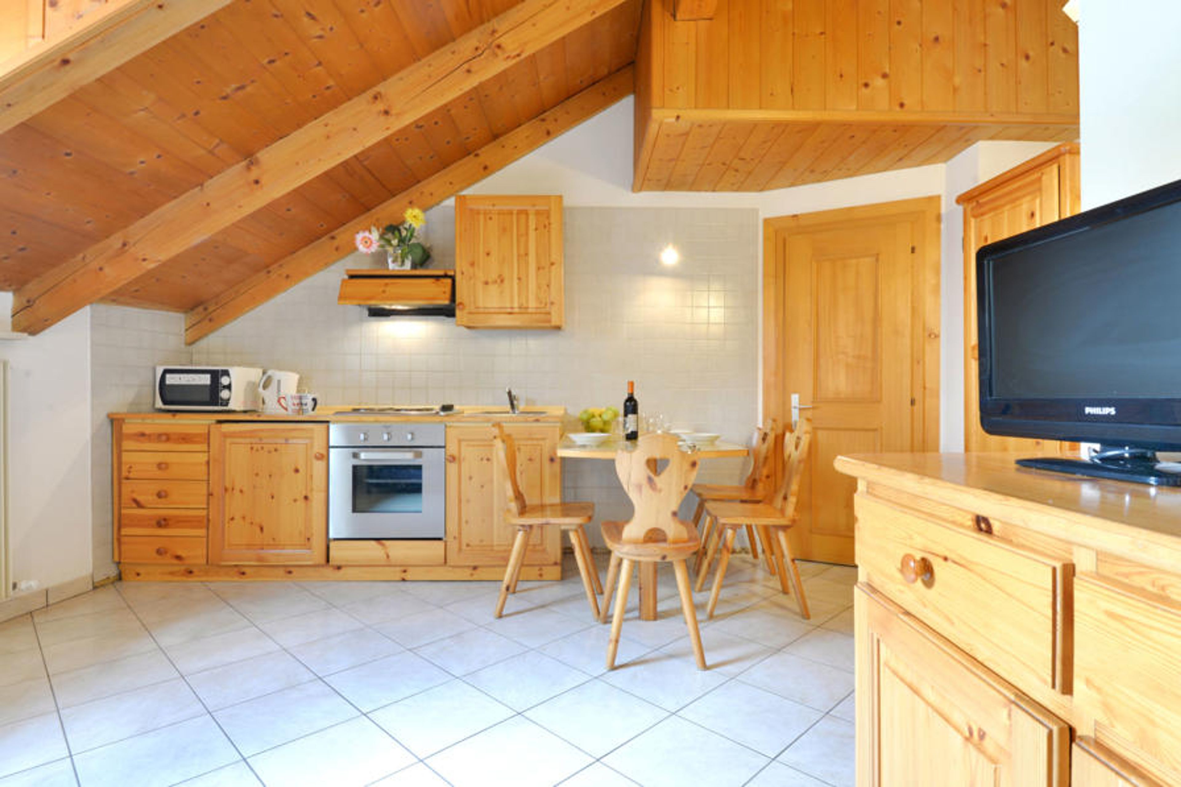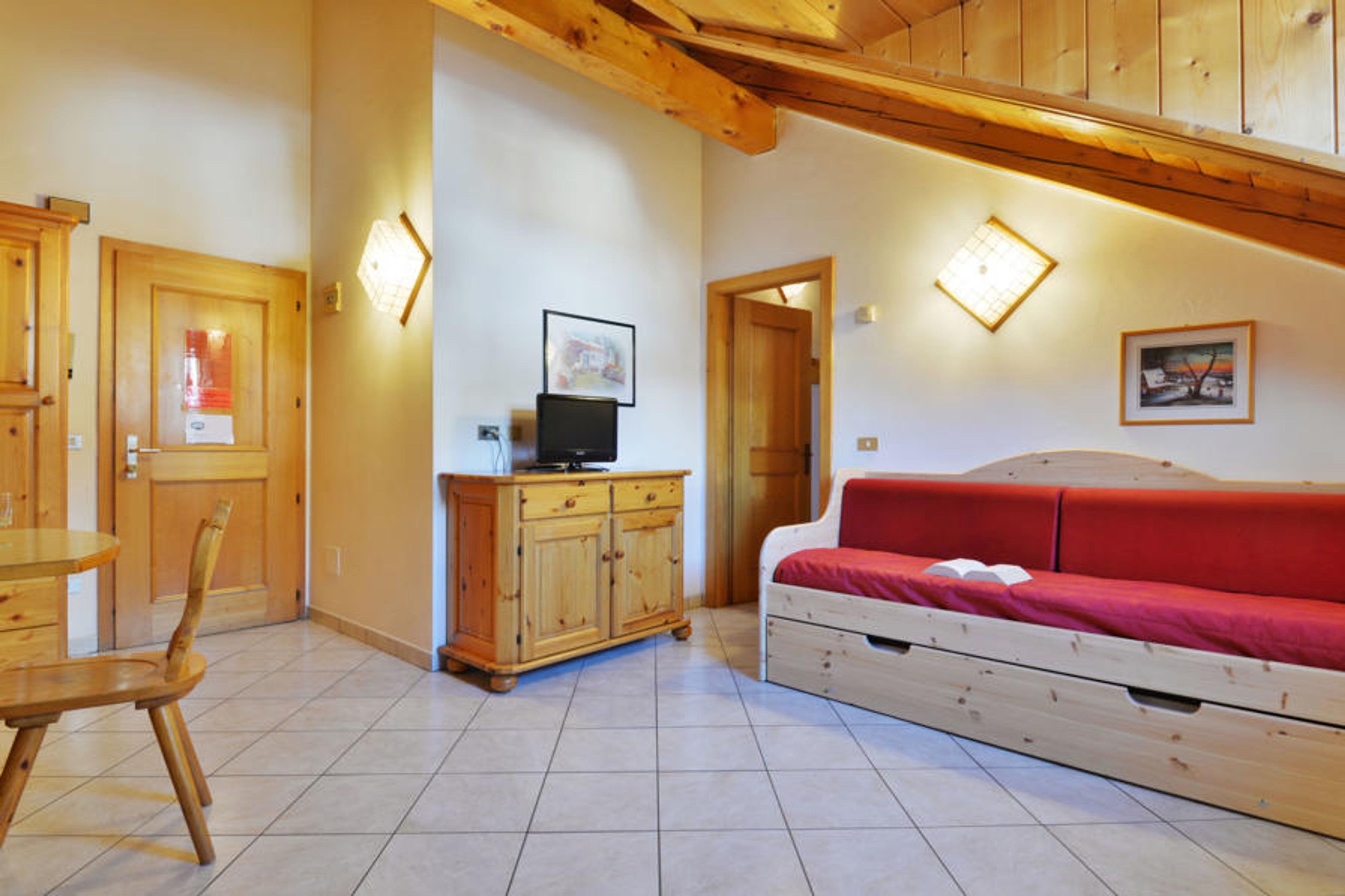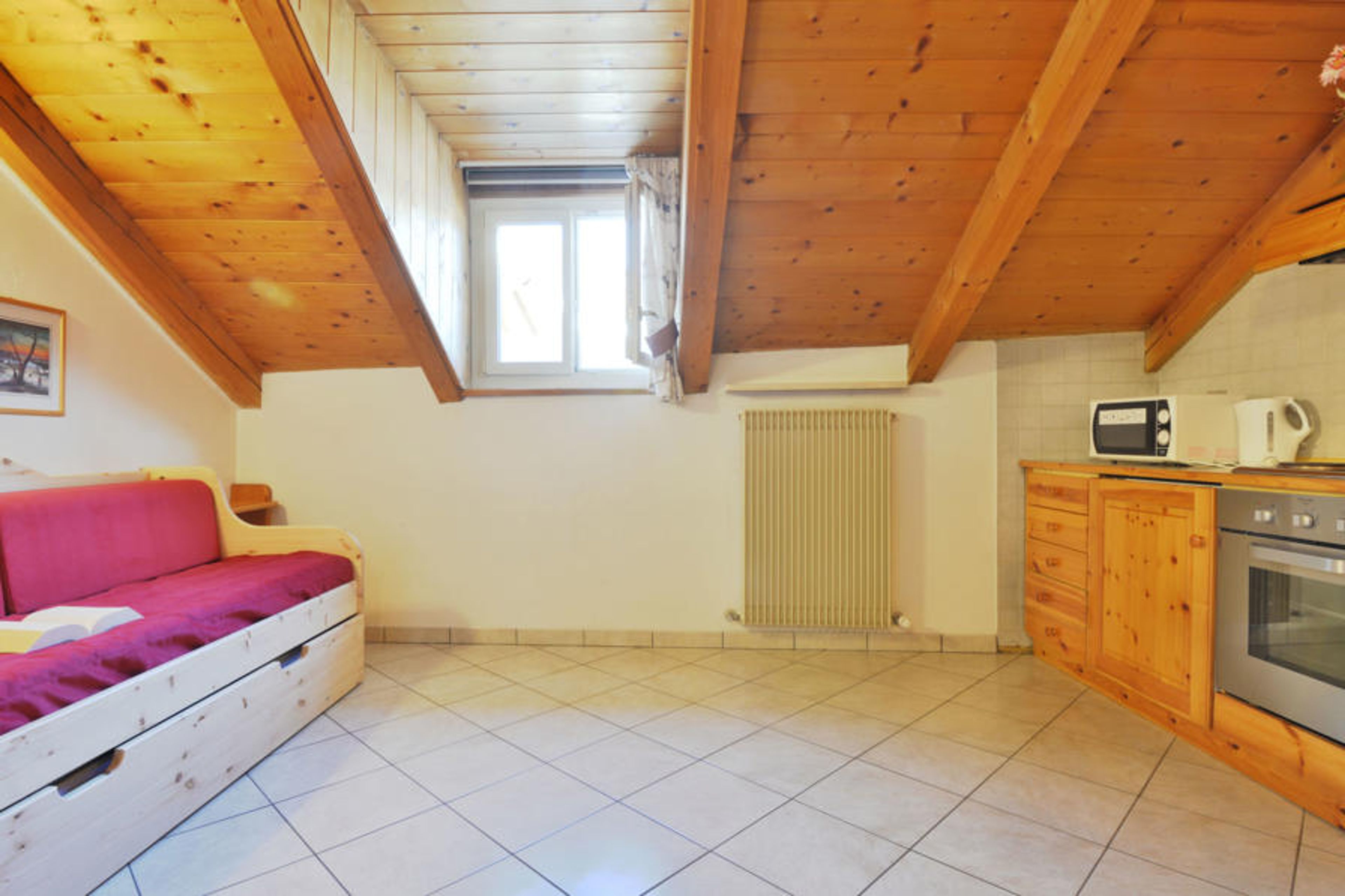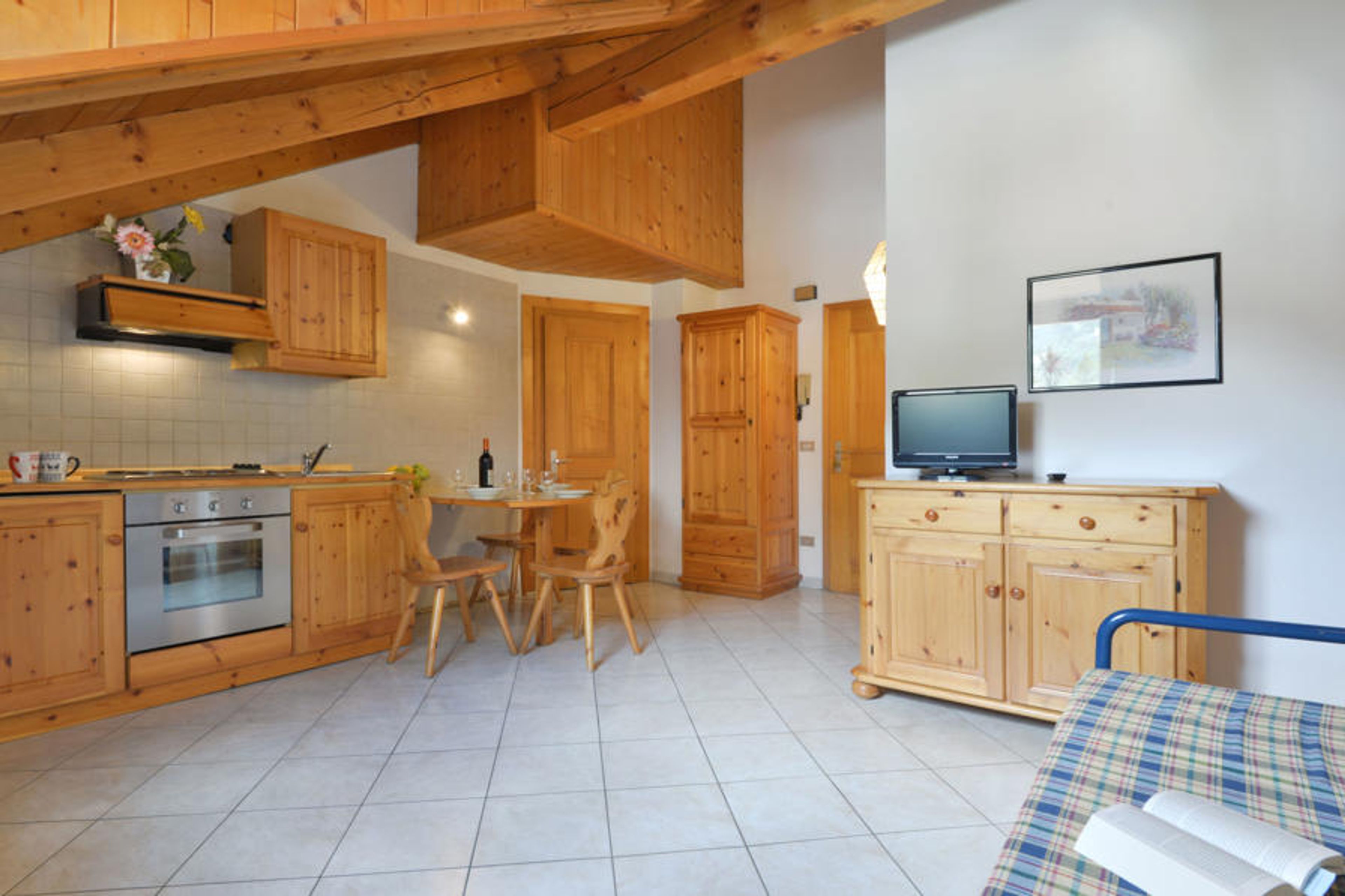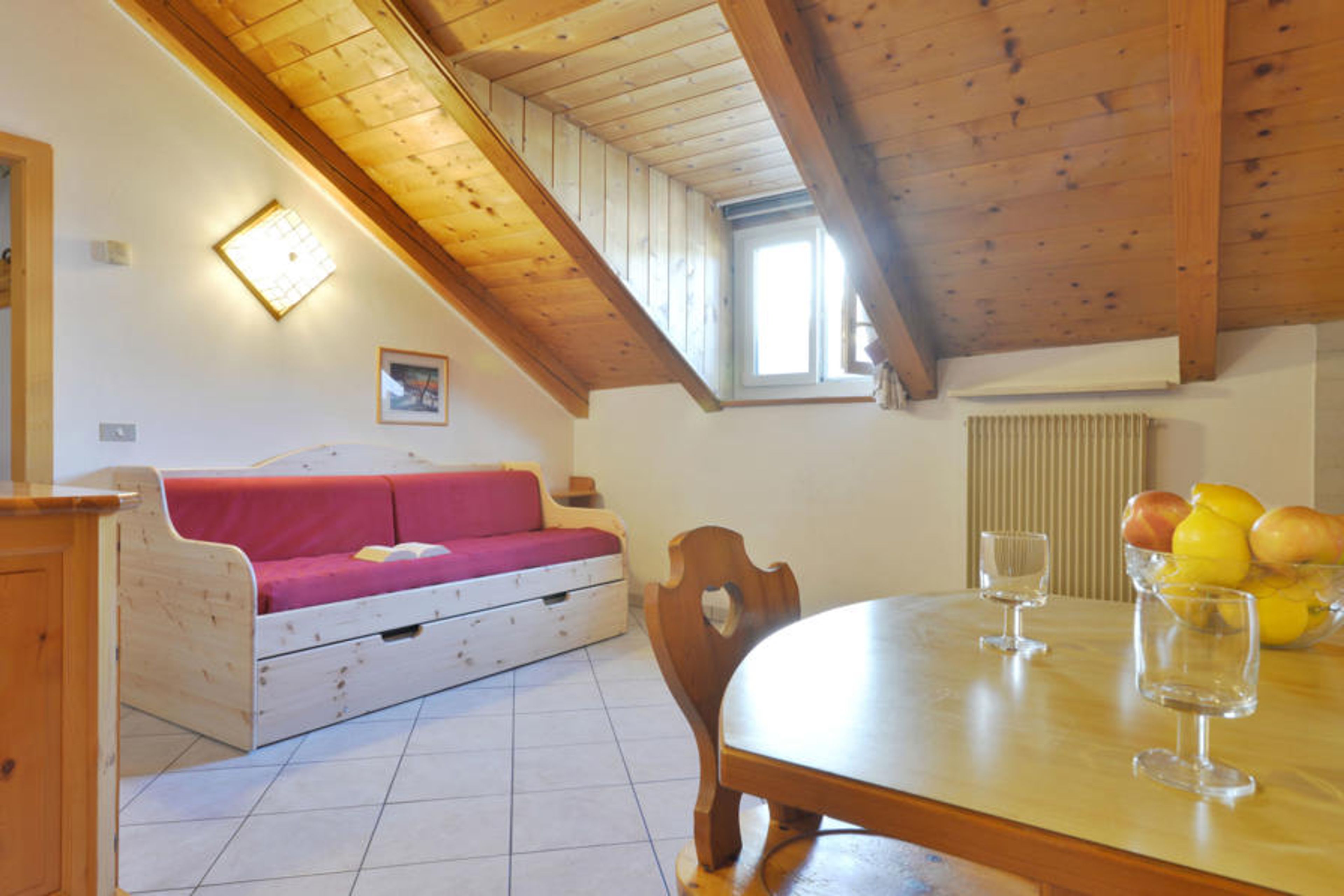 "Villa Placidia Apt 34", 2-room apartment 45 m2 on 3rd floor. Partly with sloping ceilings, comfortable and wooden furniture furnishings: living/dining room with 1 sofabed, 1 pull-out bed, dining table and TV (flat screen). 1 double bedroom with rooflight. Kitchenette (4 hot plates, oven). Shower/bidet/WC. View of the mountains and the valley. Facilities: washing machine, safe, hair dryer. Internet (WiFi, free). Please note: suitable for families. Non-smokers only, no parking. Maximum 1 pet/ dog allowed. Fire extinguisher, no lift. IT022036B4ZV6XWWJH