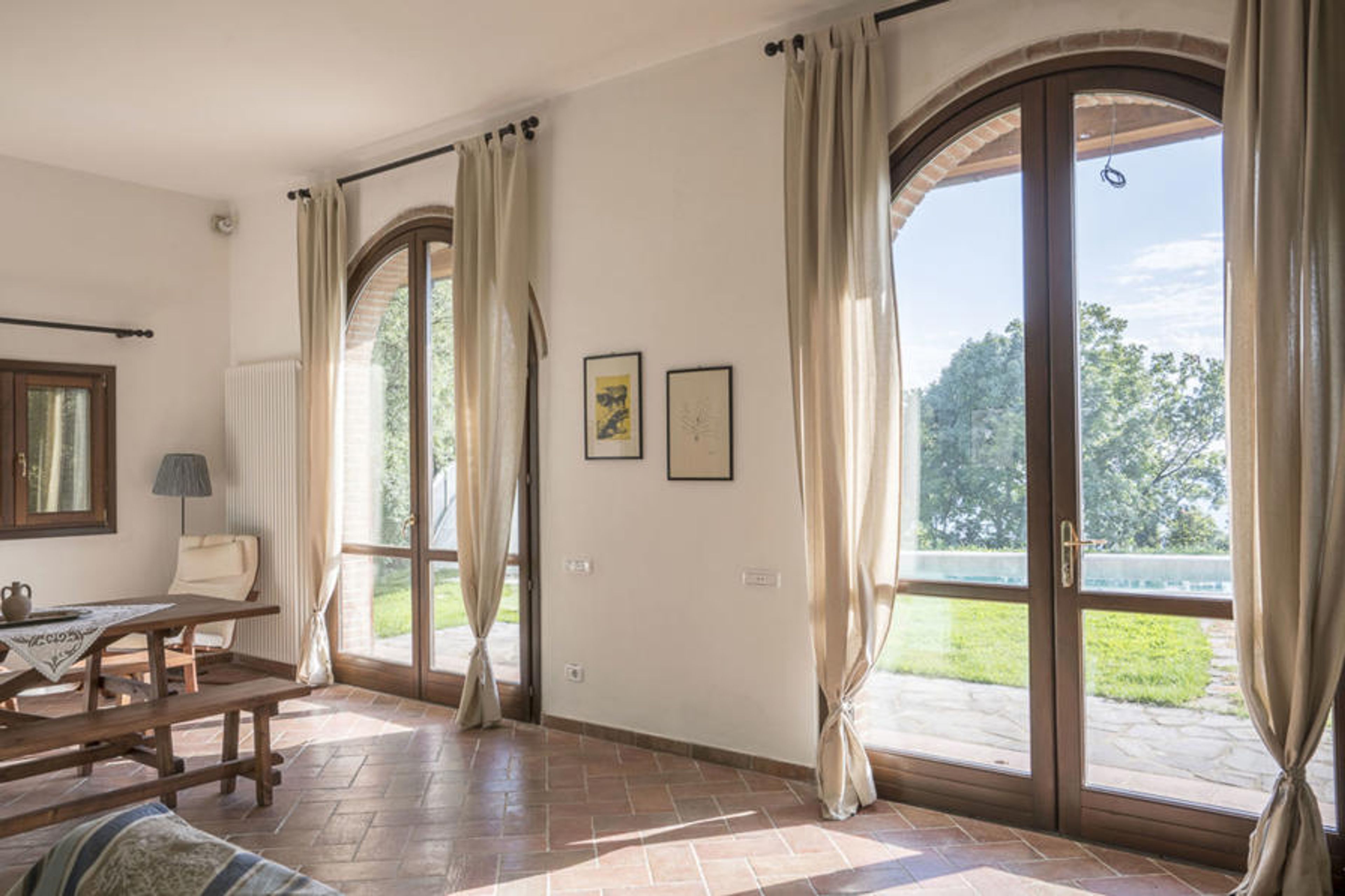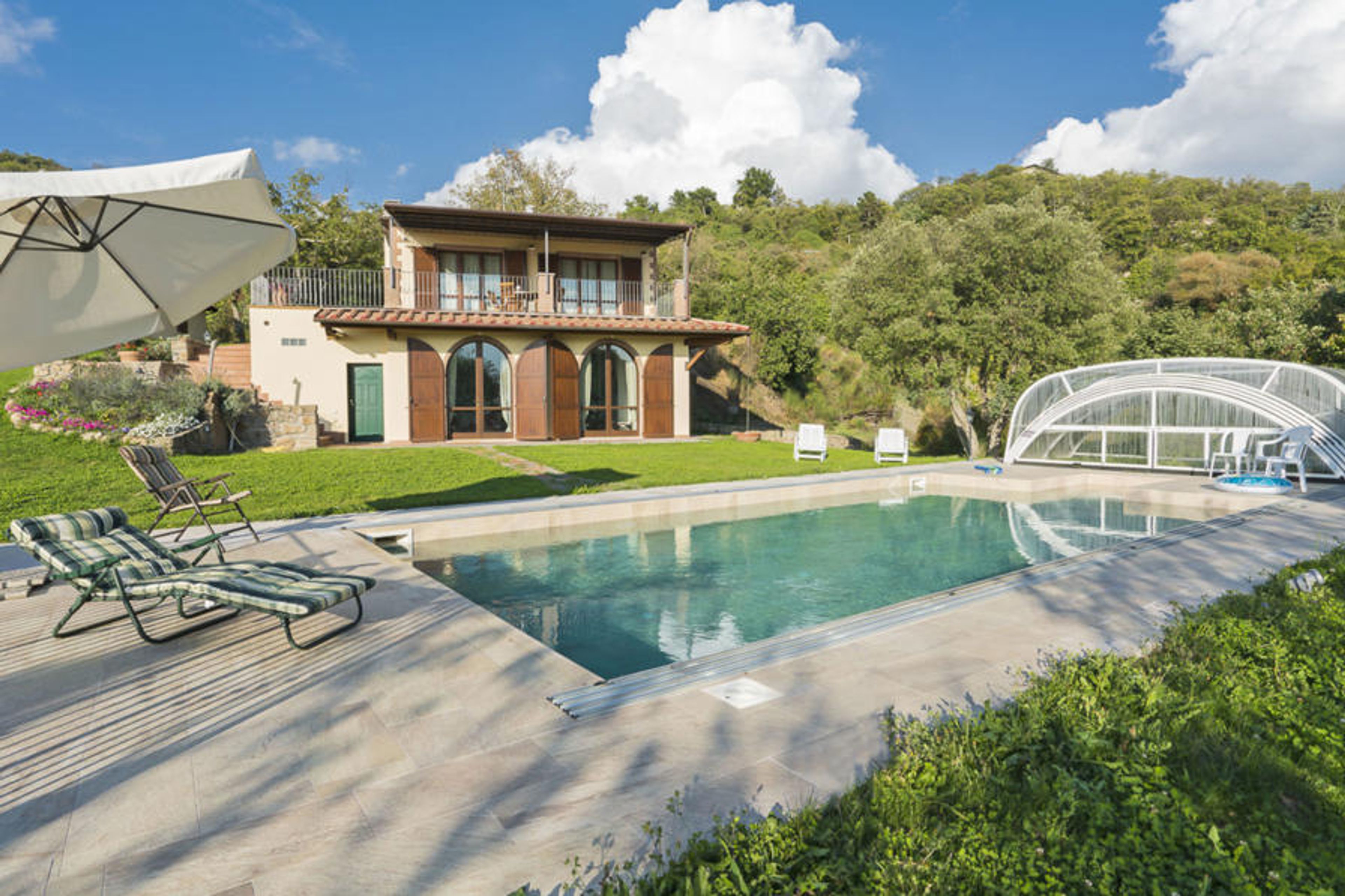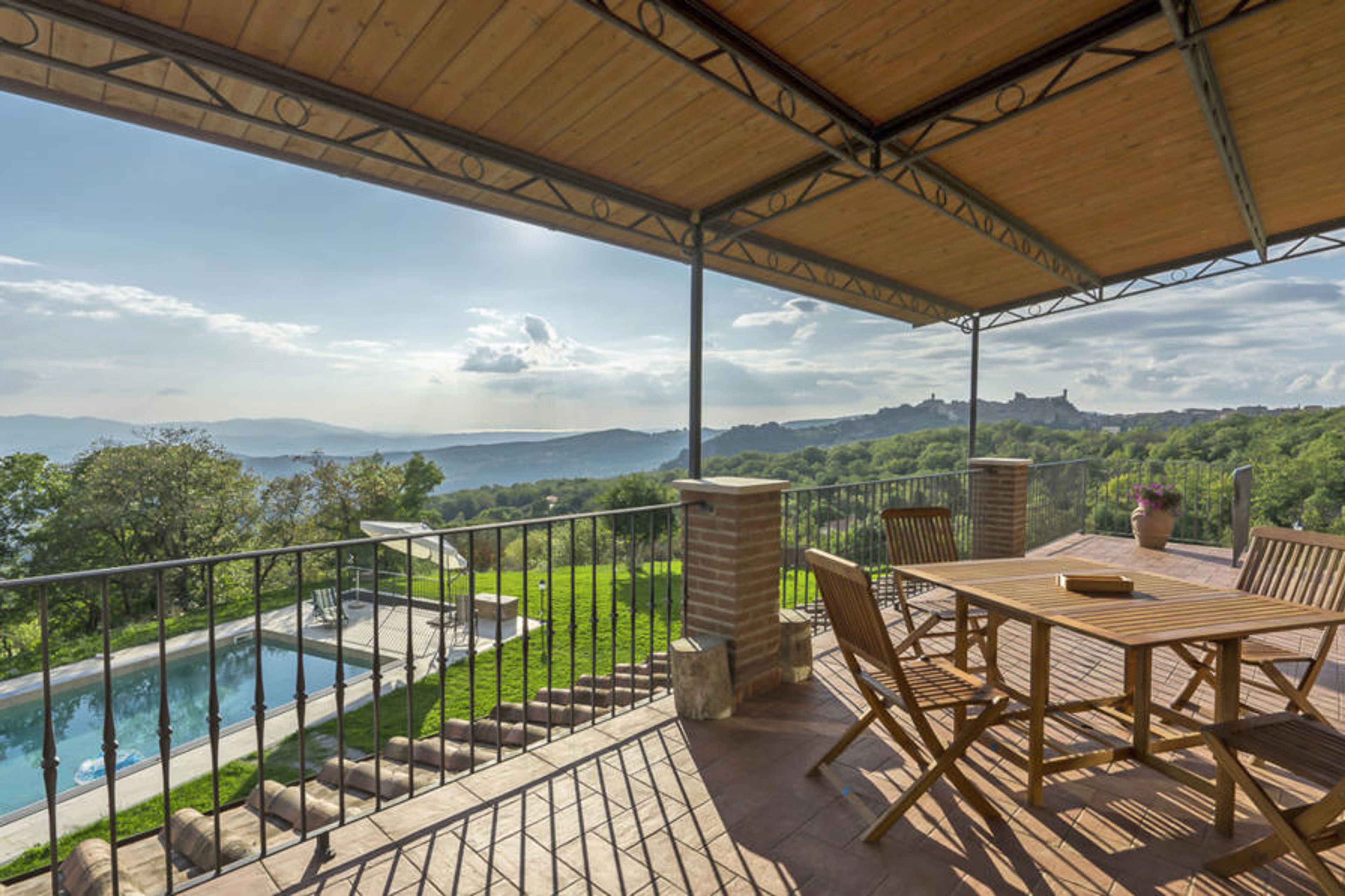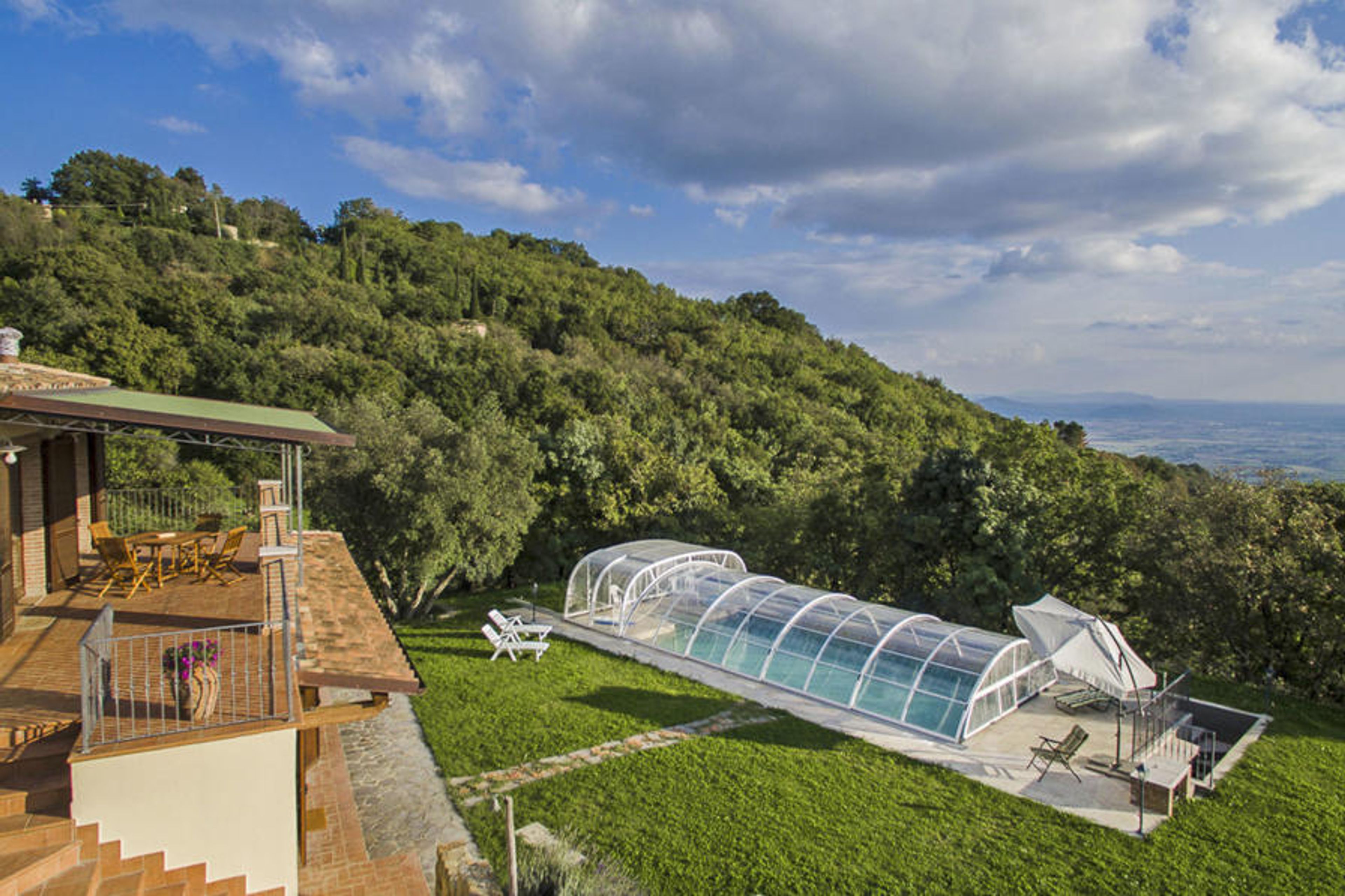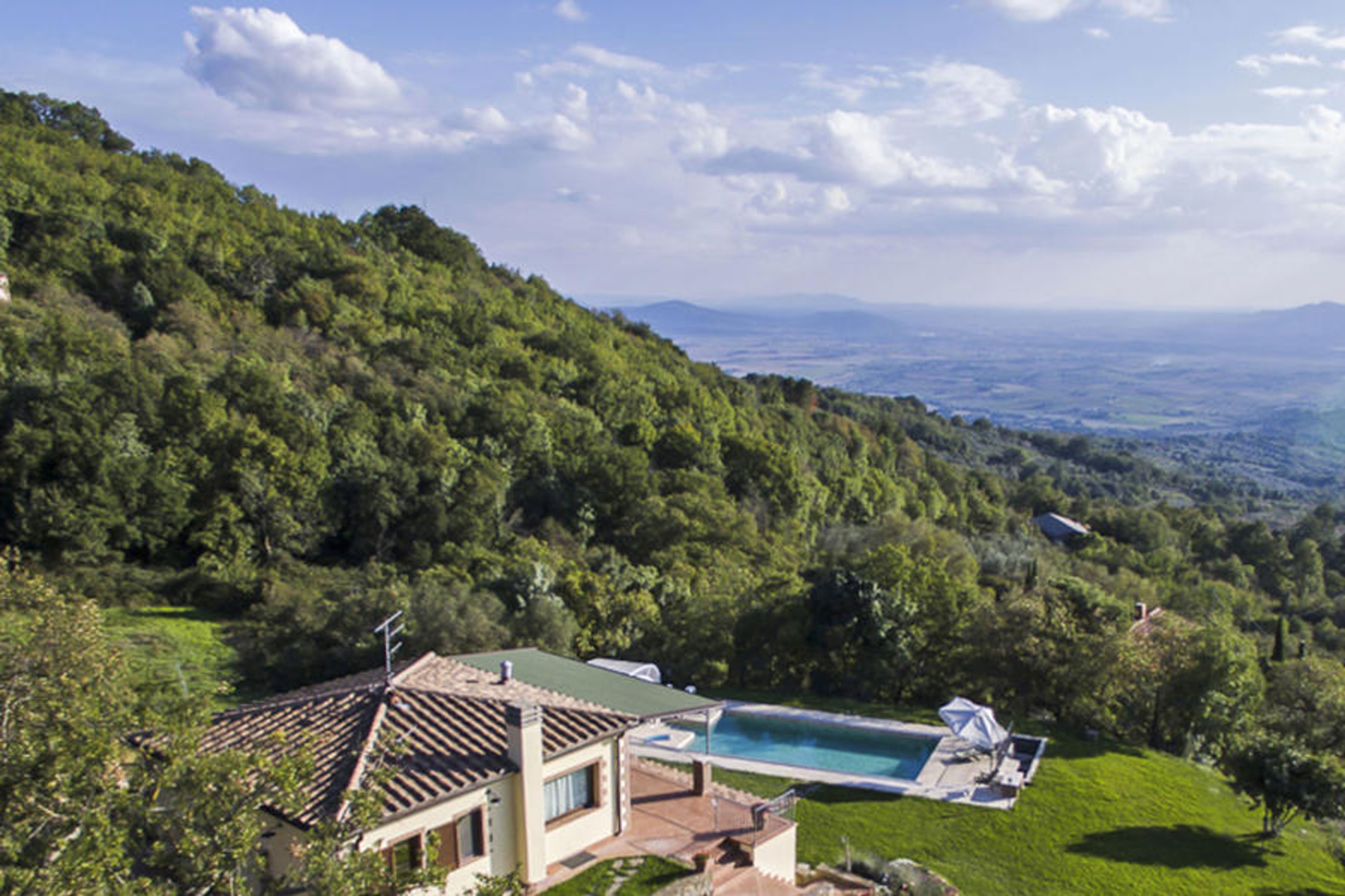 This truly unique property is located in the enchanting Maremma countryside, completely fenced off. Entirely renovated with luxury standards, while maintaining the Tuscan character of the area, they make it a modern villa with every comfort. In particular, customers can enjoy the splendid swimming pool all year round thanks to the sliding telescopic cover, which keeps the water in the pool and the surrounding environment at a pleasant temperature. Beautiful single-family house "Villa la Vena", detached, renovated. In the hamlet Roccatederighi 3.5 km from the centre of Sassofortino, in a sunny, elevated position, 40 km from the sea, in the countryside. Private: property 17'000 m2 (fenced), beautiful garden to relax, swimming pool (10 x 5 m, depth 160 cm, seasonal availability: 01.May. - 31.Oct.) with shutter cover. Garden furniture, barbecue. In the house: internet access. Motor access (100 m via unmade road, mountain road). Parking at the house. Supermarket 3 km, restaurant 2 km, railway station "Grosseto" 30 km, sandy beach "Castiglione della Pescaia" 30 km, thermal baths "Petriolo" 30 km. Golf course (18 hole) 30 km, riding stable 15 km. Nearby attractions: Roccastrada 10 km, Sito Archeologico Roselle 25 km, Marina di Grosseto 35 km, Punta Ala 50 km, Siena 60 km. Thanks to the dominant position, you can admire a view of the sea and the islands of the Tuscan archipelago.