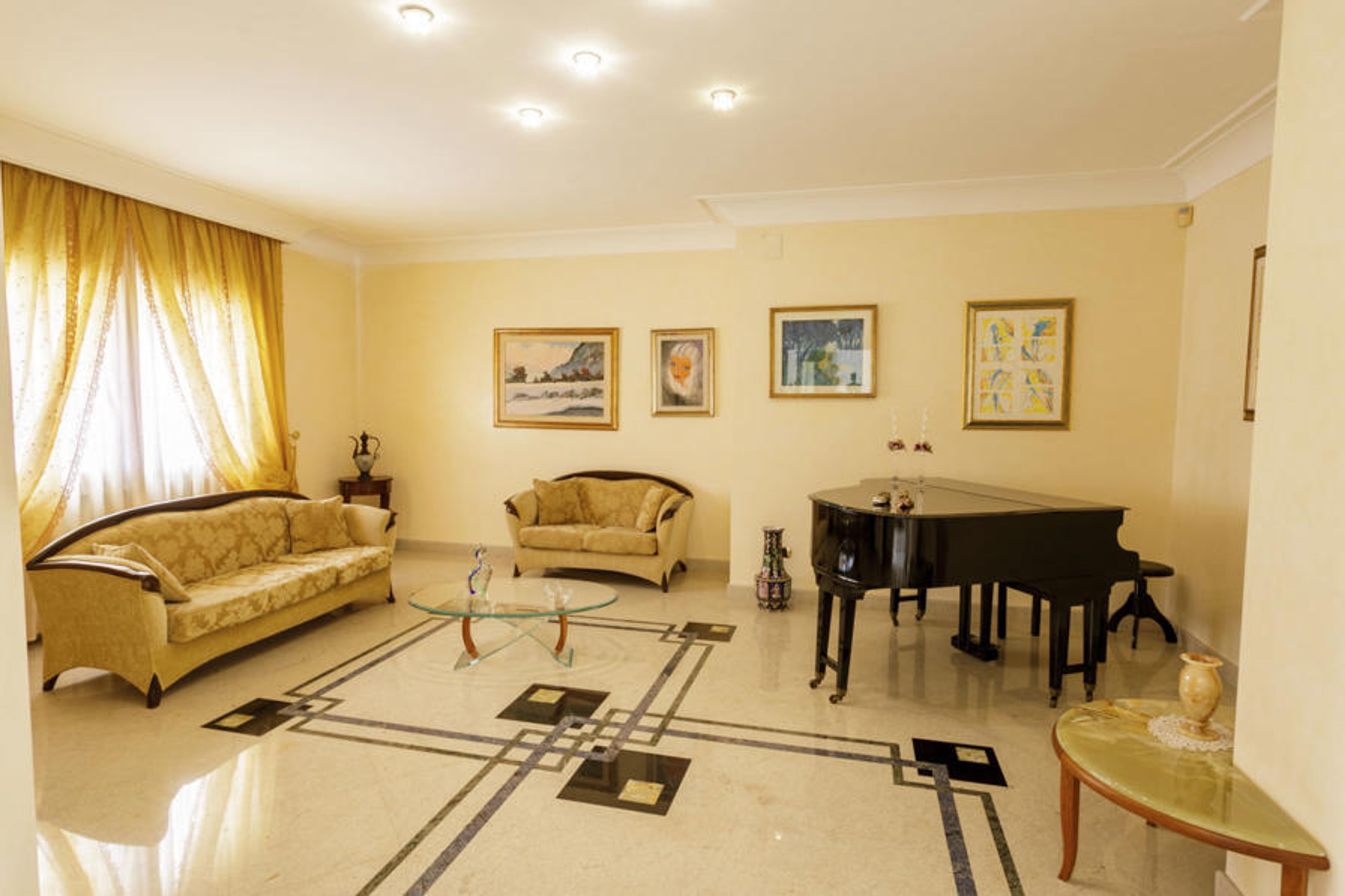 6-room villa 240 m2, on the ground floor. Very stylish and cosy furnishings: entrance hall. Lounge. Dining room with international TV channels, air conditioning and forced-air heating. Exit to the terrace. 1 double bedroom with Dressing room with shower/bidet/WC, international TV channels, air conditioning and forced-air heating. 1 double bedroom with international TV channels, air conditioning and forced-air heating. 1 double bedroom with 1 bed, air conditioning and forced-air heating. 1 double bedroom with 1 bed, air conditioning and forced-air heating. Exit to the garden. Kitchen 12 m2 (mini-oven, dishwasher, Gas stove, 4 gas rings, toaster, kettle, microwave, electric coffee machine). Exit to the terrace. Bath/bidet/WC, shower/bidet/WC, hydro massage bath. Heating, air-conditioning, forced-air heating. Heating available only from 01.11. to 31.03, Heating not available in all rooms. Parquet floors. Large terrace 40 m2, roofed, 2 terraces 10 m2, roofed, patio, large garden, porch 35 m2. Terrace furniture, barbecue, deck chairs (10). View of the swimming pool and the garden. Facilities: washing machine, safe, iron, children's high chair, baby cot for up to 2 year olds, hair dryer. Internet (WiFi, free). Parking (6 cars). Please note: suitable for families. Maximum 1 small pet/ dog allowed. Smoke alarm, fire extinguisher. The villa must be left at 9 am on departure day, in case of arrival of new guests on the same day . IT075052C200037368