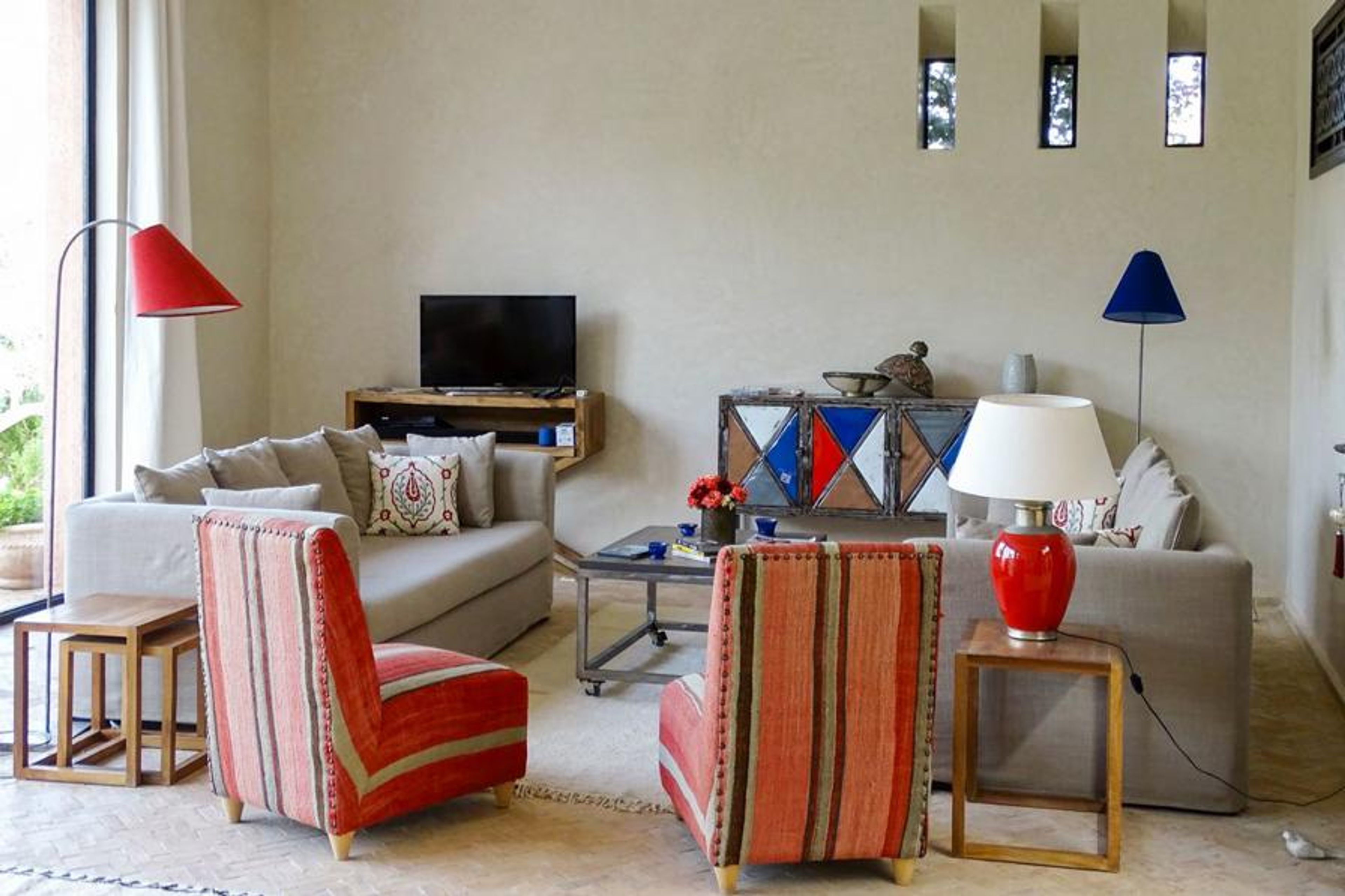 - Ample living room with comfortable seating, TV and access to the garden
