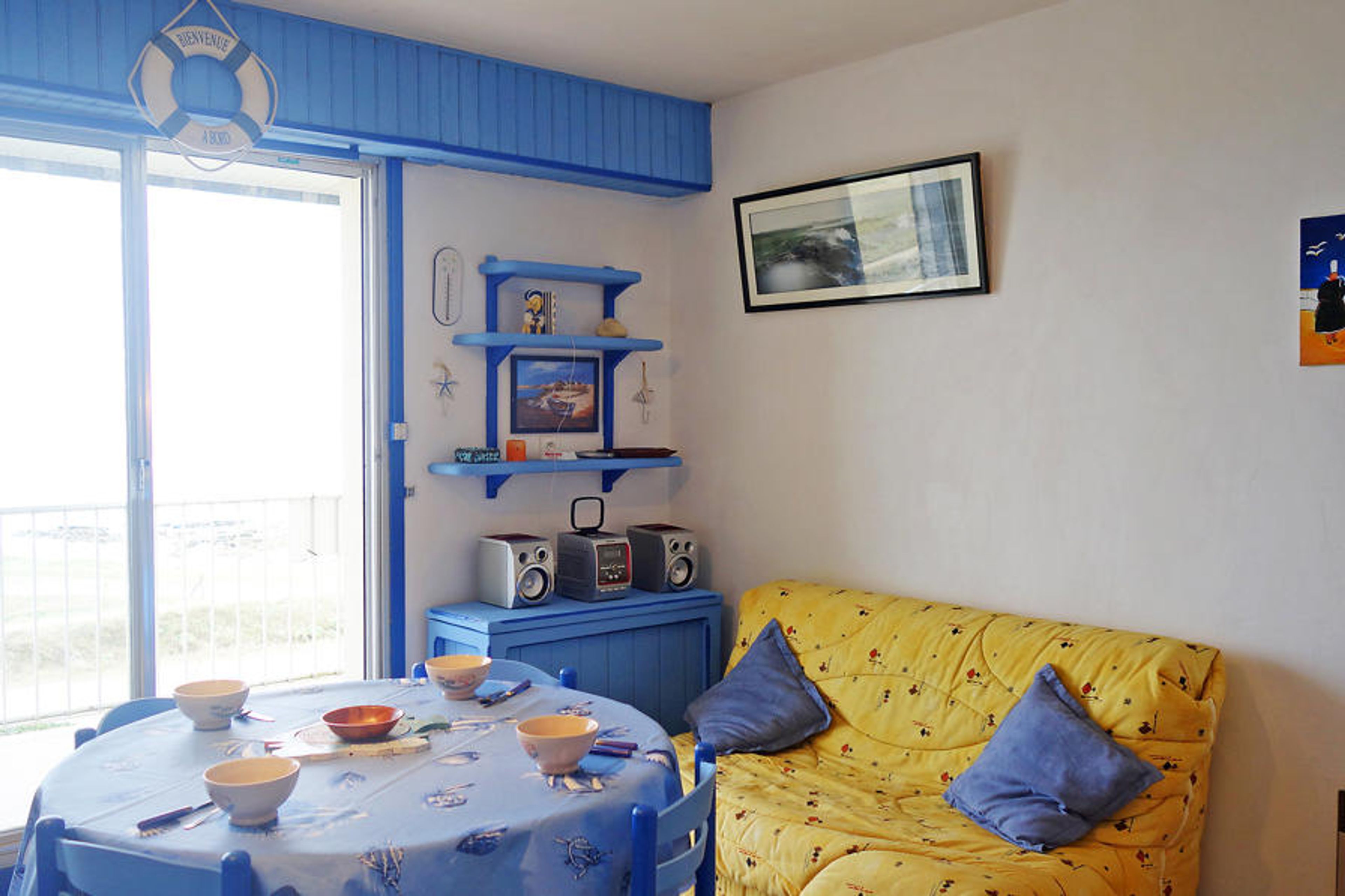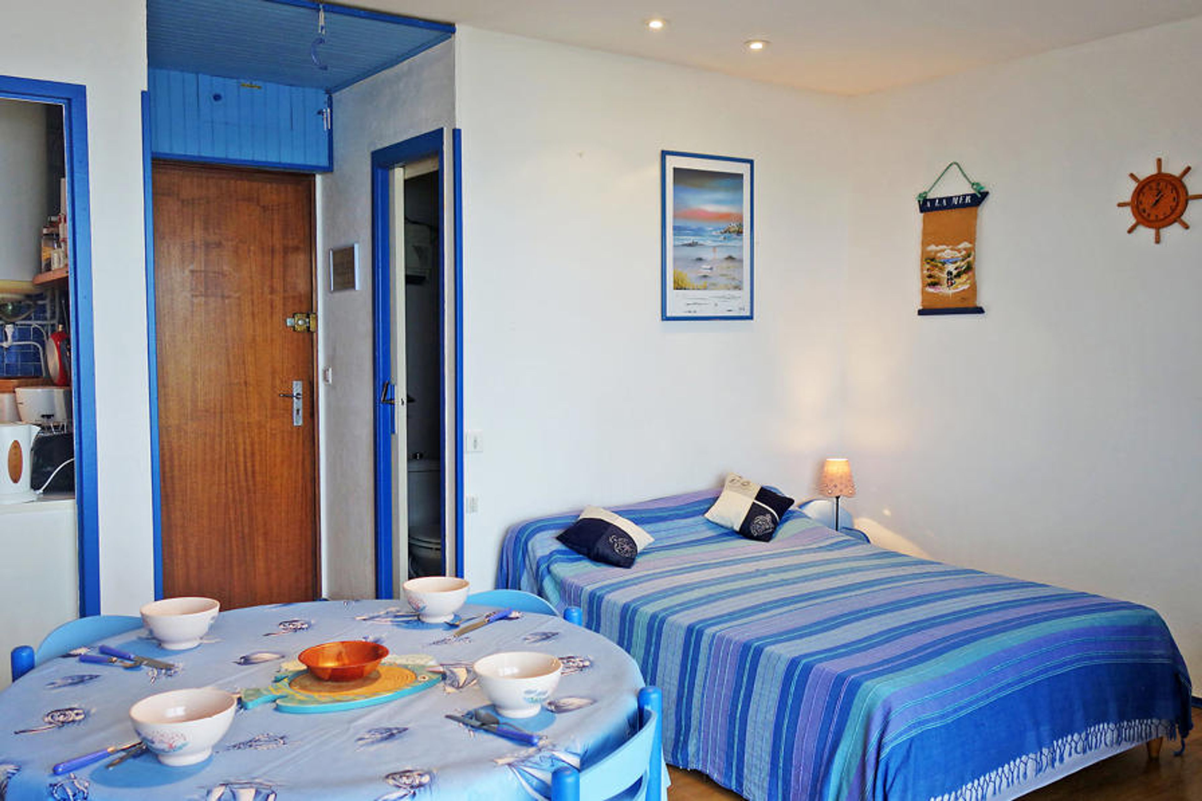 1-room studio 27 m2 on 2nd floor. Practical furnishings: living/dining room with 1 french bed (1 x 160 cm, length 200 cm), TV (flat screen). Exit to the balcony. Kitchenette (3 hot plates, oven, microwave, electric coffee machine). Shower/WC. Electric heating. Terrace. Balcony furniture. Very beautiful view of the ocean. Facilities: Internet (WiFi, extra). Parking space n 204. Please note: maximum 1 small pet/ dog allowed. Smoke alarm.