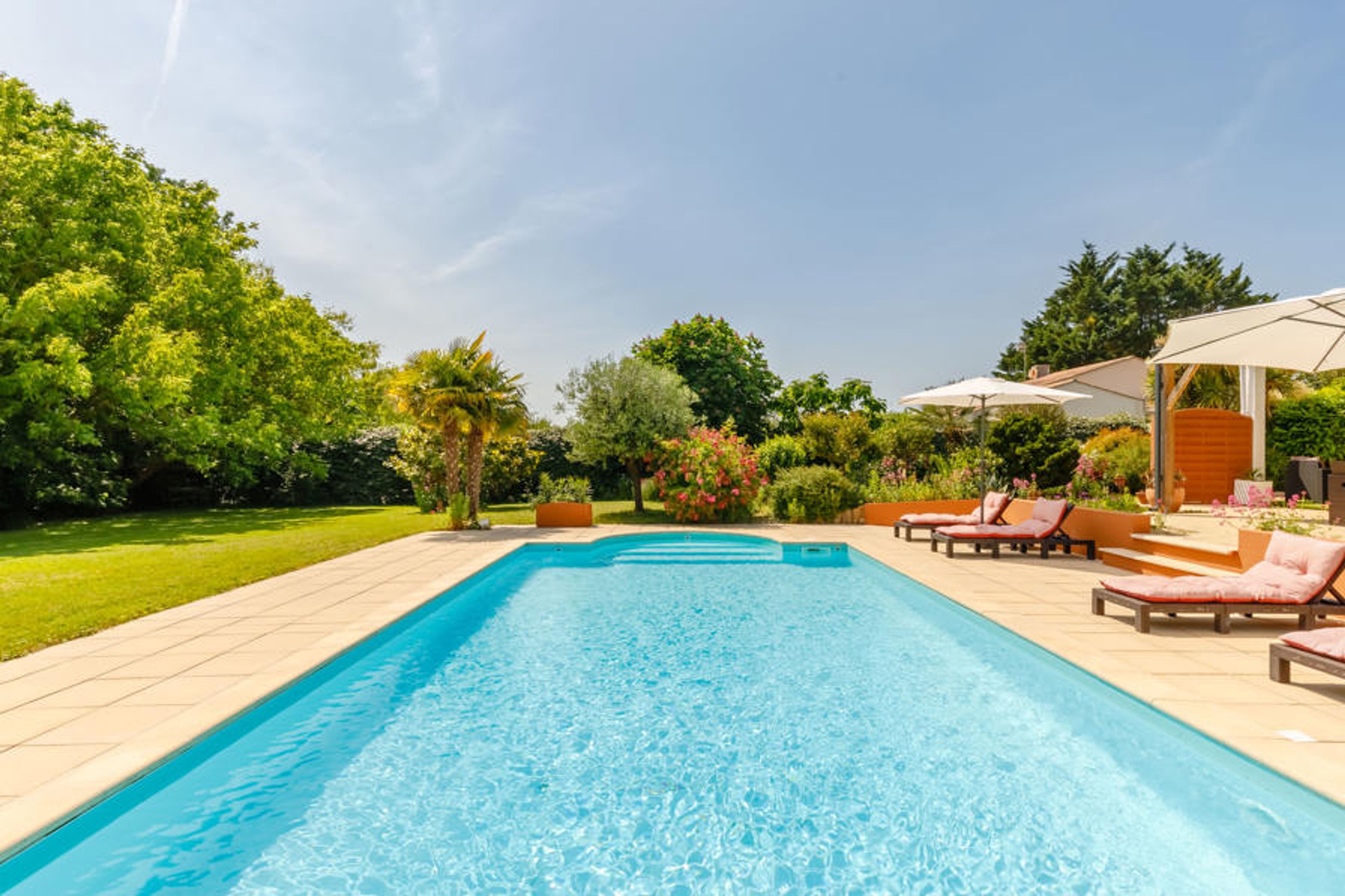 Olonne sur Mer 3 km from Les Sables d'Olonne: Beautiful, comfortable villa "Villa Les Cygnes", built in 1990, surrounded by trees. On the outskirts, 3 km from the centre of Olonne sur Mer, in a quiet position in the residential district, 2.5 km from the sea, 2.5 km from the beach. Private: large, beautiful, well-kept garden 2'000 m2 (fenced) with lawn and flowers, swimming pool heated (10 x 5 m, depth 50 - 200 cm, seasonal availability: 03.May. - 30.Sep.) with shutter cover. Table tennis, terrace, garden furniture. Storeroom available. Parking (for 4 cars) on the premises. Shop 1 km, supermarket 1 km, restaurant 1 km, bus stop 500 m, sandy beach 2.5 km. Tennis 3 km.