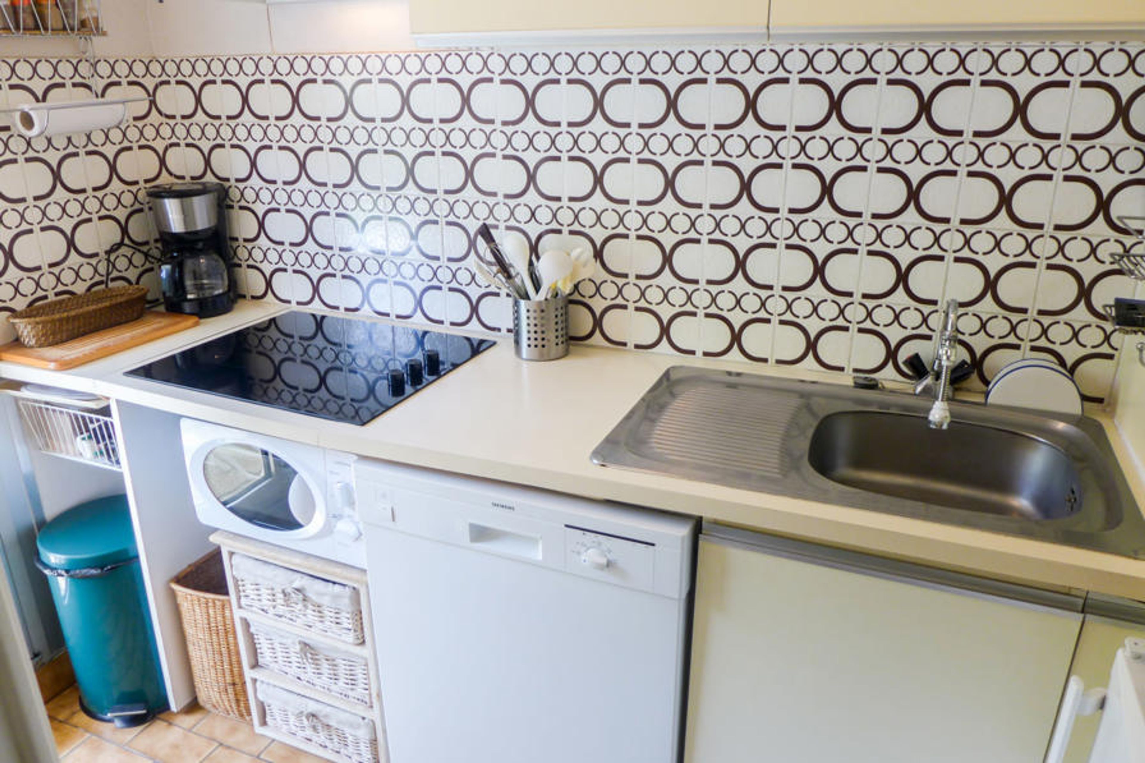 2-room apartment 35 m2, on the ground floor, south-west facing position. Living/dining room with 1 double sofabed (140 cm, length 190 cm), TV, flat screen and electric shutters. Exit to the terrace, to the patio. 1 room with 1 french bed (140 cm, length 200 cm), bathroom. Exit to the terrace, to the patio, south facing position and west facing position. Kitchen (oven, dishwasher, 3 ceramic glass hob hotplates, toaster, kettle, microwave, electric coffee machine). Sep. WC. Electric heating, boiler. Parquet floors. Terrace 15 m2, patio. Terrace furniture. Facilities: iron, hair dryer. Internet (WiFi, extra). Parking space n 69. Please note: non-smokers only. Smoke alarm. There is a fairly high step to access the terrace.