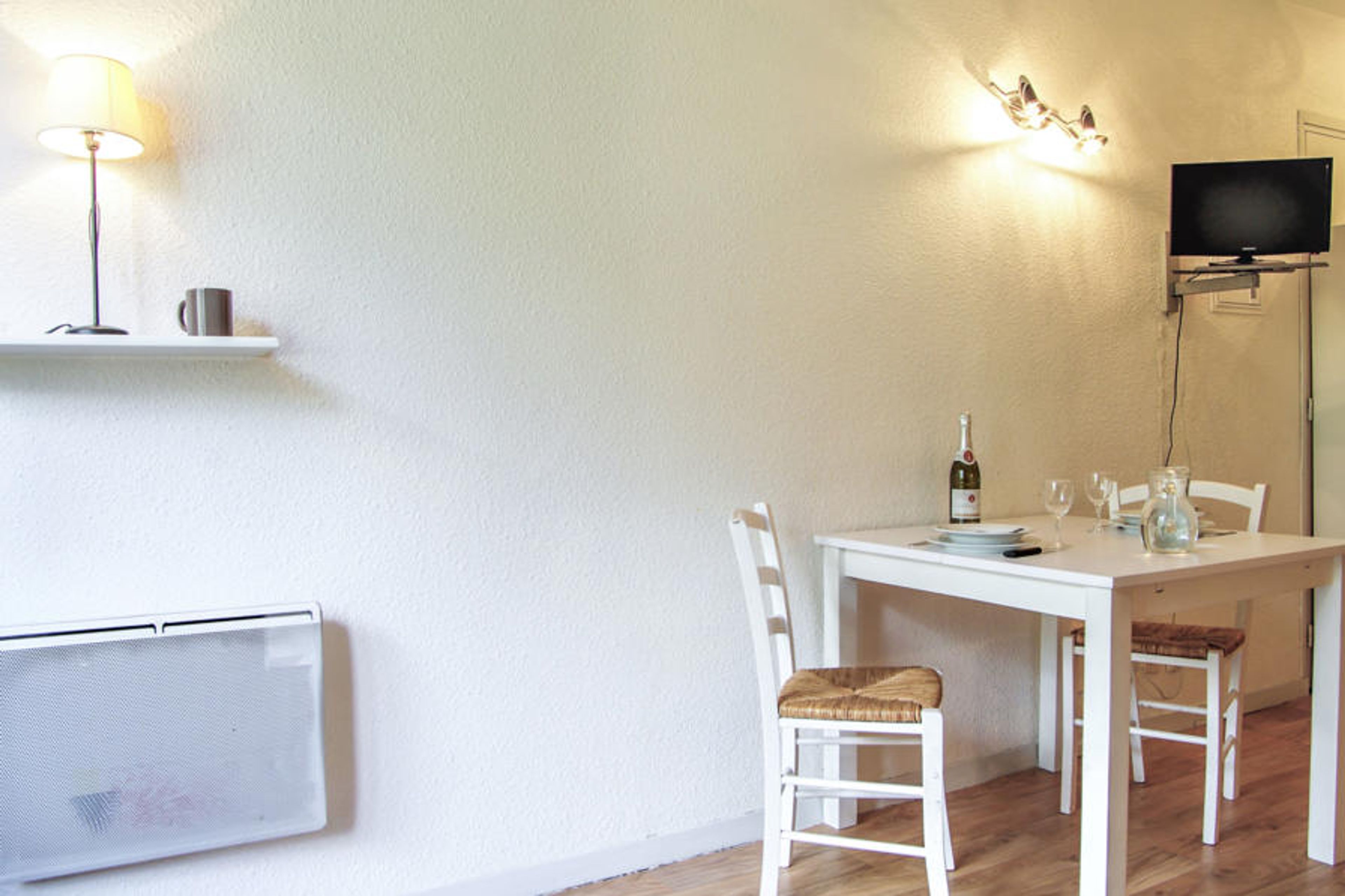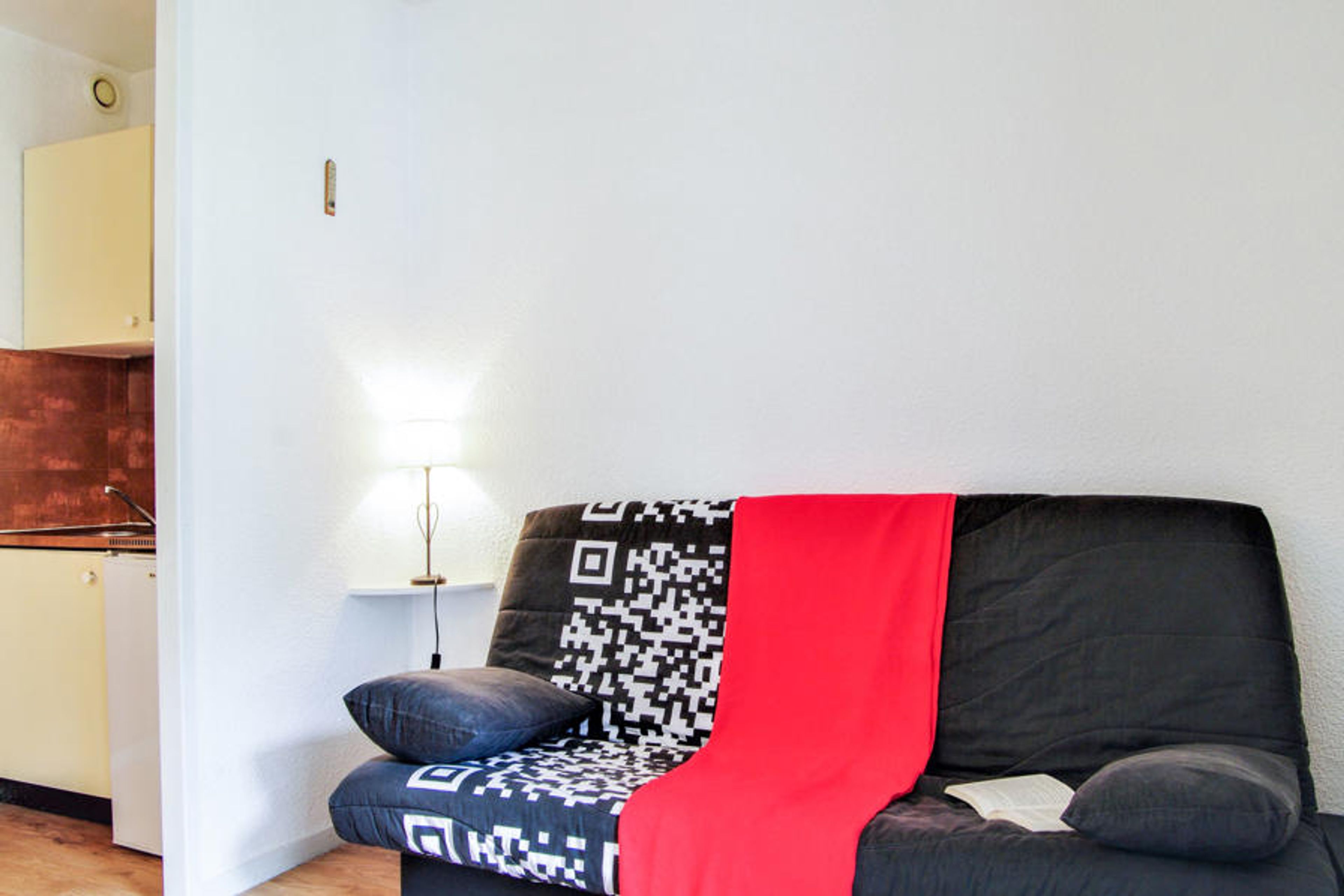 1-room studio 22 m2 on 2nd floor. Very simple furnishings: living/dining room with 1 double sofabed (140 cm, length 190 cm), TV. Kitchenette (2 hot plates, kettle, microwave, electric coffee machine). Bath/WC. Electric heating. Small balcony, north-east facing position. View of the mountains. Facilities: Internet (WiFi, extra). Please note: no parking. TV only FR. Smoke alarm. 74056002628UM