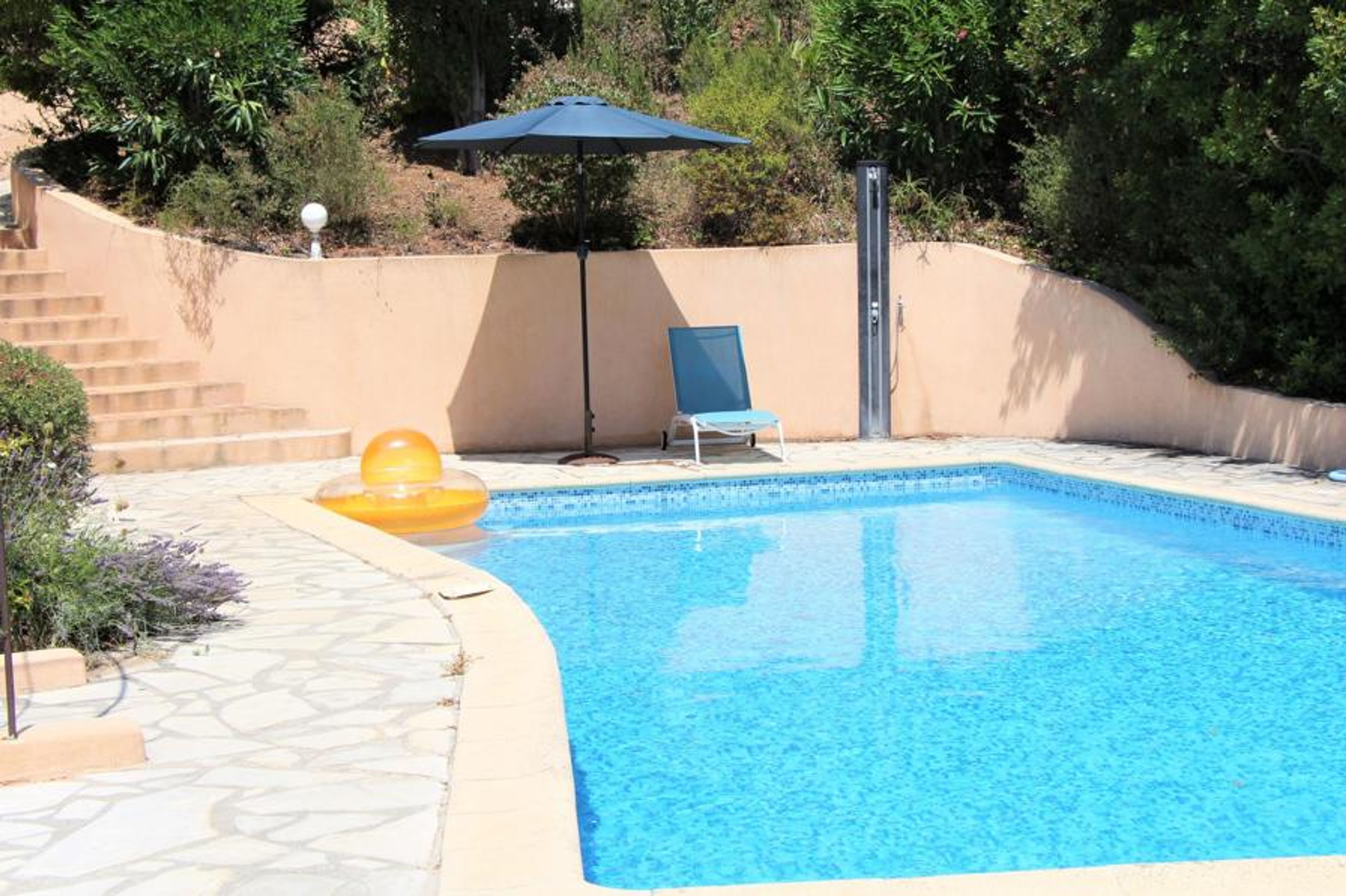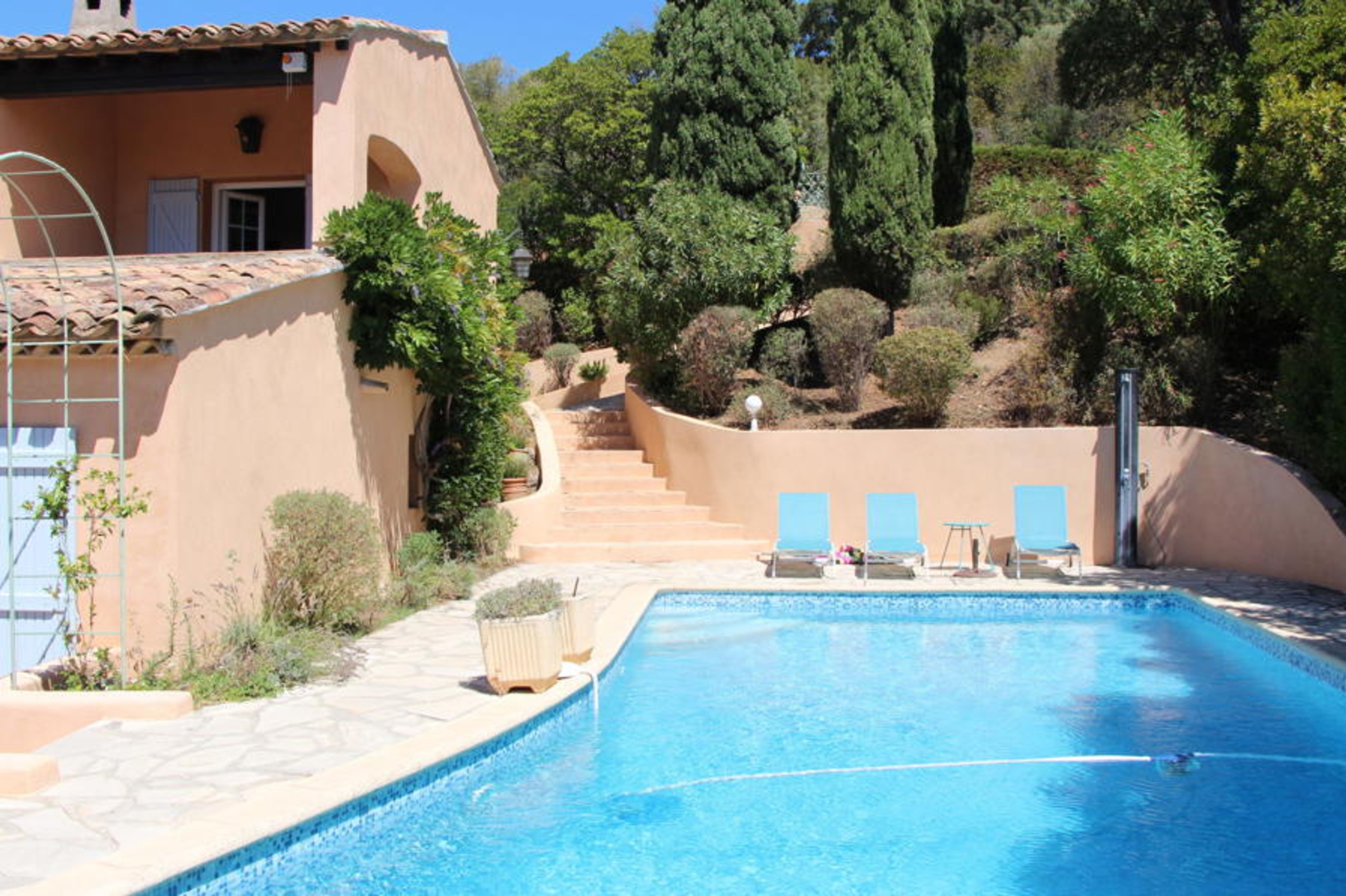 Beautiful villa "Mare E Sole". Outside the resort, 3.3 km from the centre of Cavalaire sur Mer, in a quiet position on a slope, in the residential district, 1.6 km from the sea. Private: property 1'800 m2 (fenced), well-kept garden, swimming pool (11 x 5 m, depth 120 - 210 cm, seasonal availability: 01.Jan. - 31.Dec.) with internal staircase and alarm system. Outdoor shower. In the house: air conditioning. Motor access to the house. Parking (for 2 cars) on the premises. Shop 2.5 km, grocery 2 km, supermarket 4.2 km, shopping centre 11 km, restaurant 2 km, bar 2 km, bakery 2 km, bus stop "PLACE DU PARC" 2.4 km, sandy beach "Terre de sable" 1.6 km, park "Aqualand" 23 km, diving center 3.5 km. Sports harbour 3.4 km, sailing school 3.2 km, tennis 500 m, minigolf 12 km, riding stable 3 km. Nearby attractions: Azur Park, Paint-ball 13 km, Bowling à Port-Grimaud 14 km, St-Tropez 18 km, Ste-Maxime 25 km. Hiking paths: Sentier du Fenouillet 5.6 km, Sentier Littoral 8 km, Toulon 62 km. Please note: car recommended.