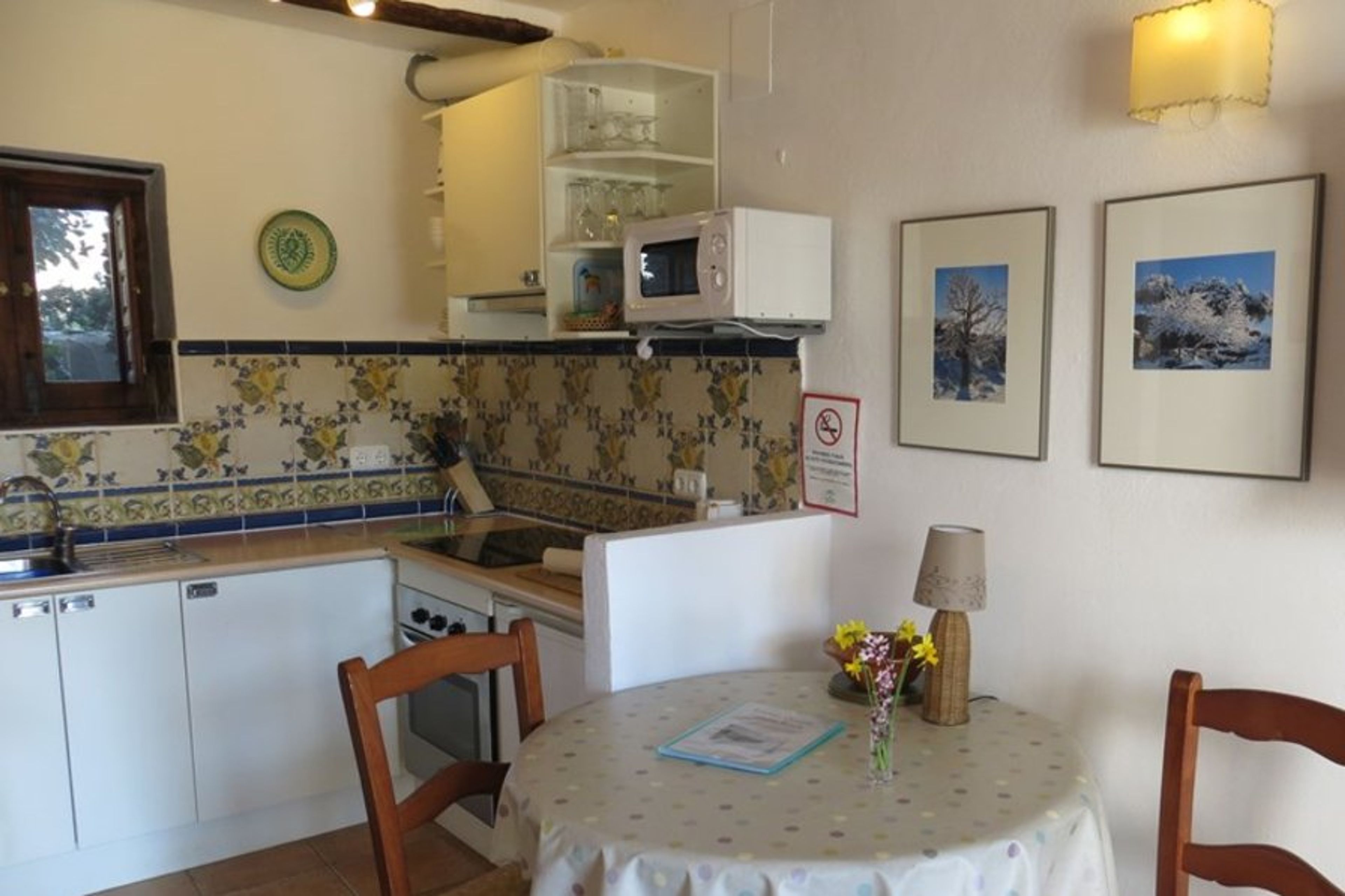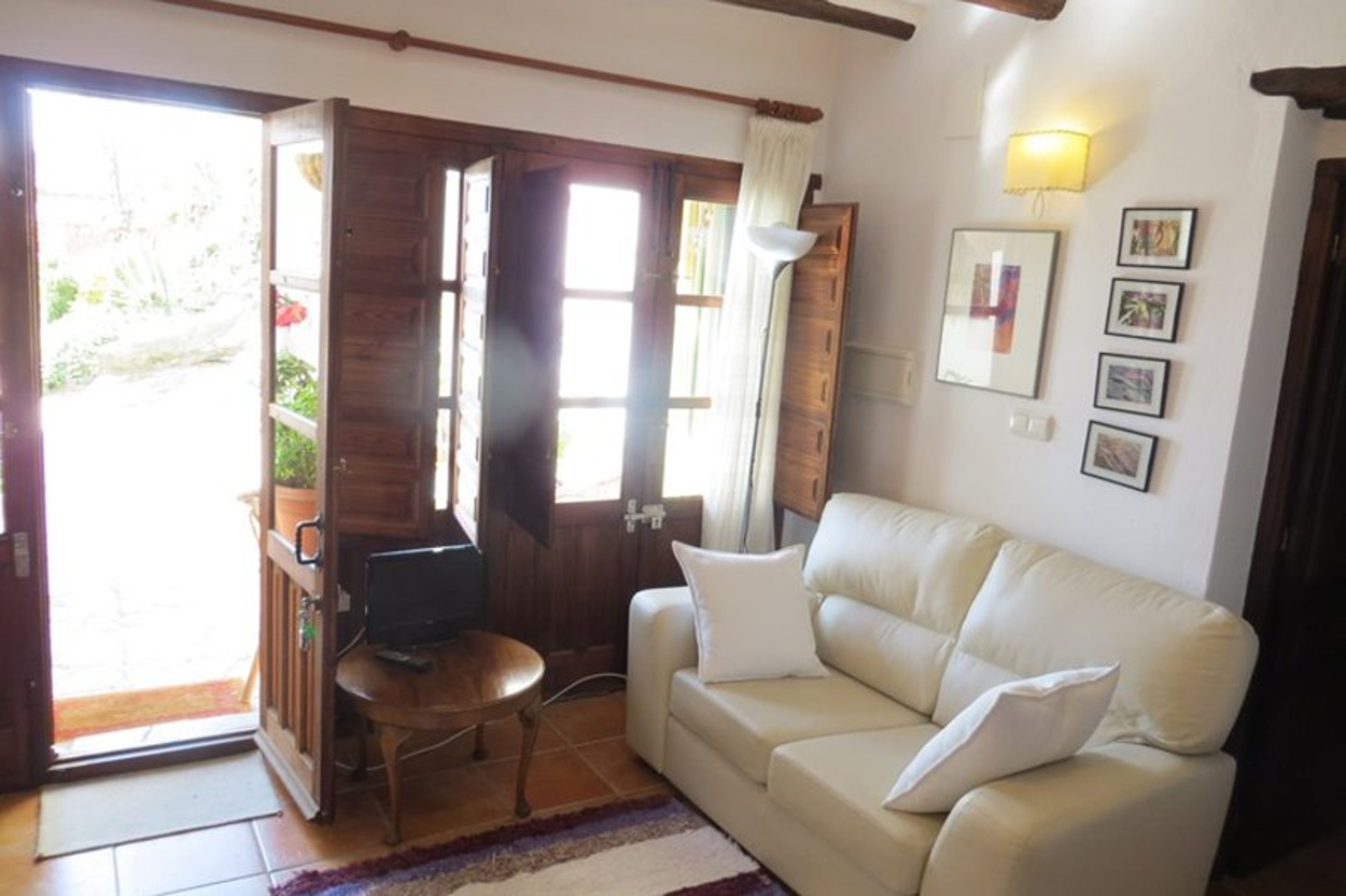 This well equipped apartment has two sets of french windows leading from a private courtyard patio into the light and airy open plan living area of Opazo Jardin. Here you will find a sofa, an armchair, dining table and chairs, coffee table and log burning stove. The kitchen is fitted with cupboards, full sized oven, glass ceramic hob with four rings, overhead extractor fan and full sized fridge. Plates, cutlery etc are provided for at least four people and there is an extensive range of cooking equipment. The kitchen is tiled with ceramics in traditional local designs, and is clean and modern. It has a window that faces east and allows the morning light to flood in.