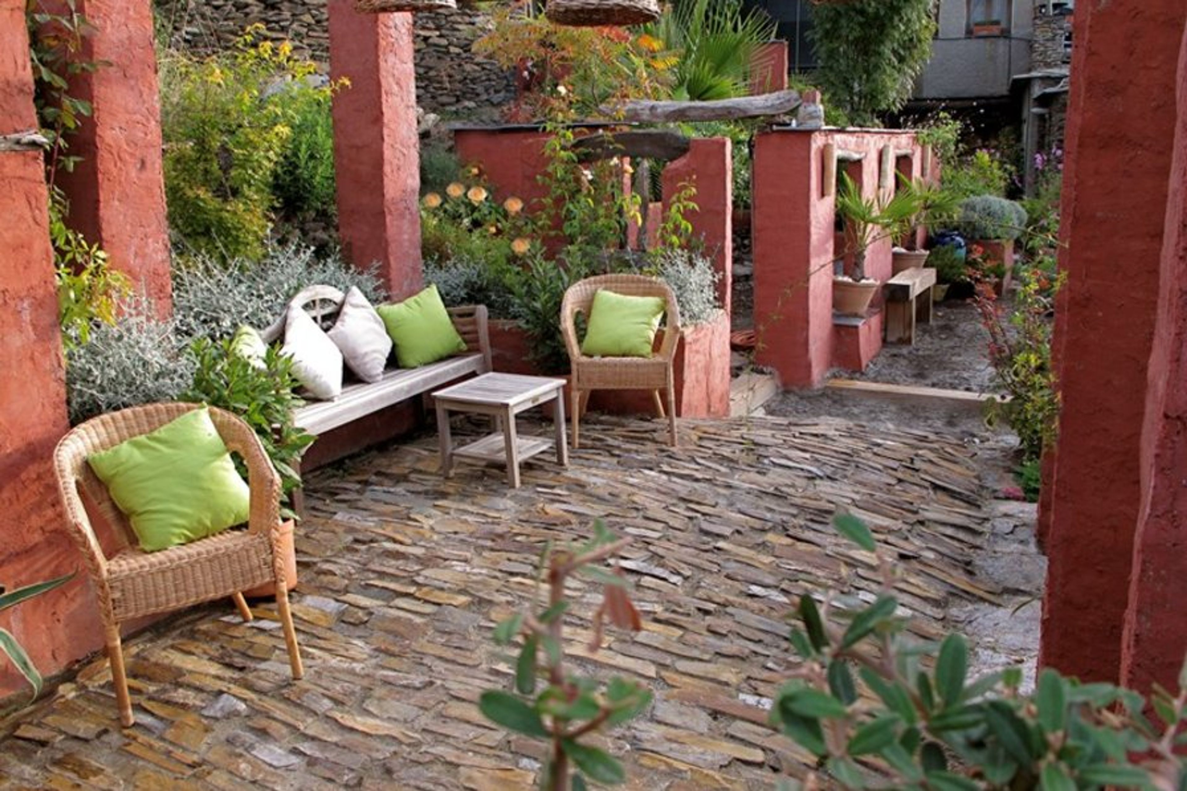 Opazo Jardin has its own private courtyard filled with flowering potted plants. This leads directly onto a patio, part covered by a pergola, which is for the exclusive use of guests staying in Opazo Jardin. The patio has open views across the Rio Bermejo to the village of Pitres and further to the high summit of El Lujar - on a clear day the Mediterranean sea can be glimpsed way down in the valley. The patio has full sun all day whilst the west facing courtyard offers a perfect location to enjoy the setting sun. The private outdoors spaces lead on to the large communal garden. Tables, chairs and sun loungers are provided to allow guests to take full advantage of the outdoor spaces.