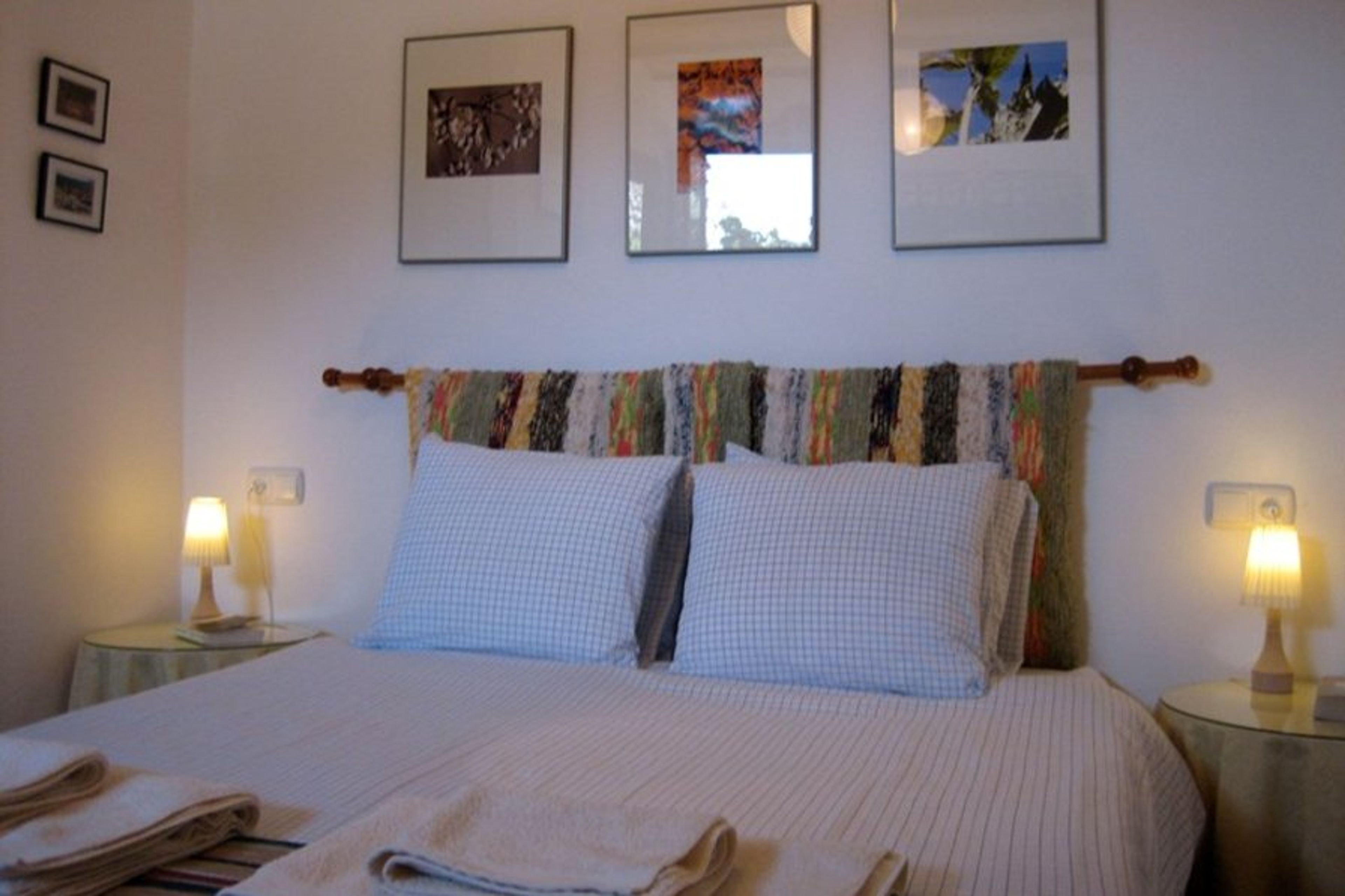 From the sitting room a door leads into a good sized bedroom with a double bed (200cms x 150cms), two side tables with lamps, a chest of drawers, a built in wardrobe, a well stocked bookshelf and an armchair. A window looks out onto the surrounding hills.