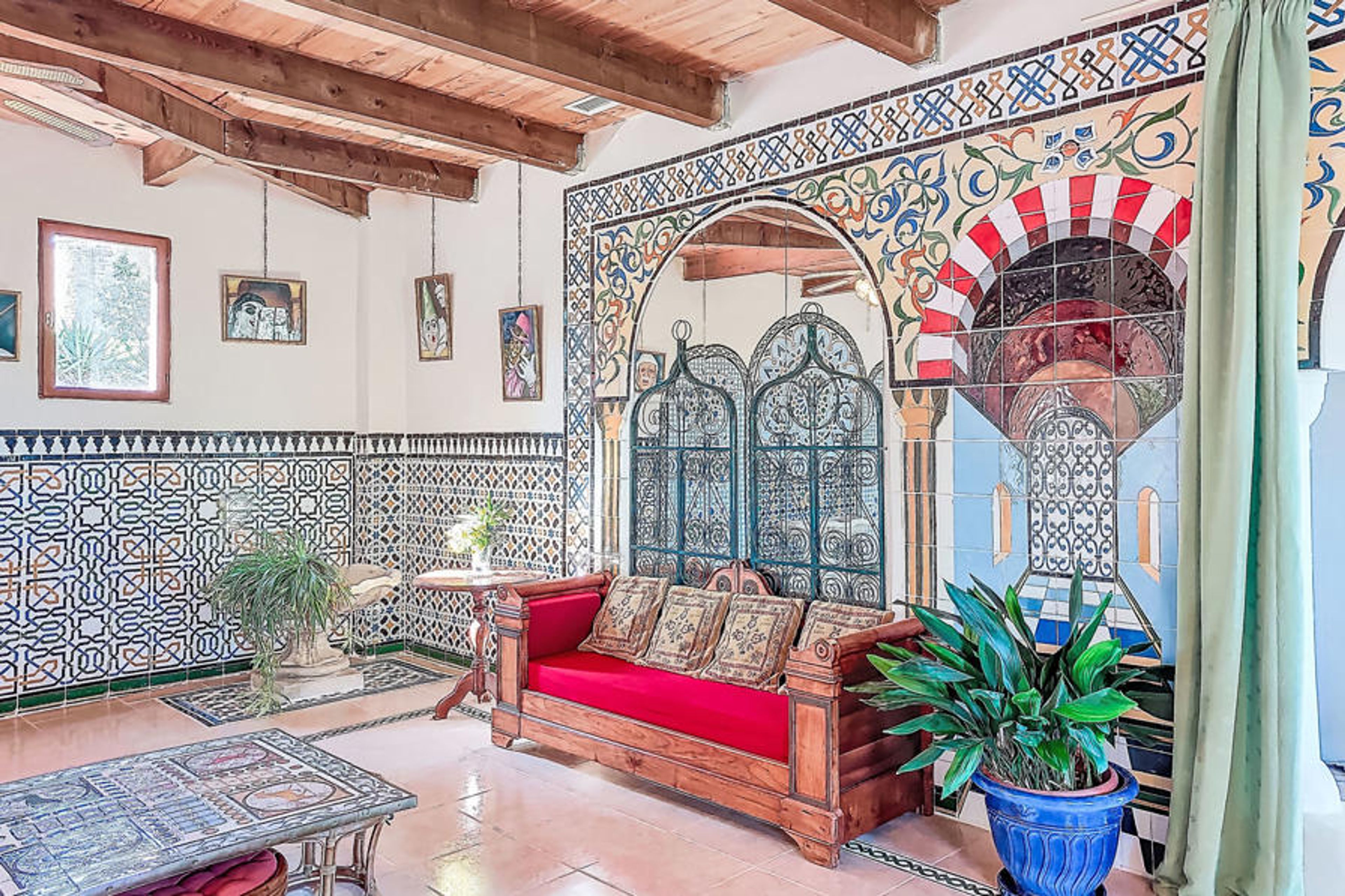 Le Hameau de Vendemies 3 km from Limoux: Former stables comprising a single-storey building and a 2-storey tower, in the oriental style (Alambra mosaics), in a very isolated position, on a hill overlooking meadows and fields. Single-family house "Les Ecuries". Outside the resort, in the countryside. For shared use: boccia. Private: natural garden 5'000 m2 (fenced), swimming pool angular (12 x 4 m, depth 150 - 150 cm, seasonal availability: 01.Jun. - 30.Sep.) with internal staircase. Terrace (120 m2), parking on the premises, single garage. Shop 3 km, grocery 3 km, restaurant 3 km, café 3 km, bus stop "Gare de Limoux" 6 km. Nearby attractions: Cité de Carcassonne 32 km. Please note: car recommended.