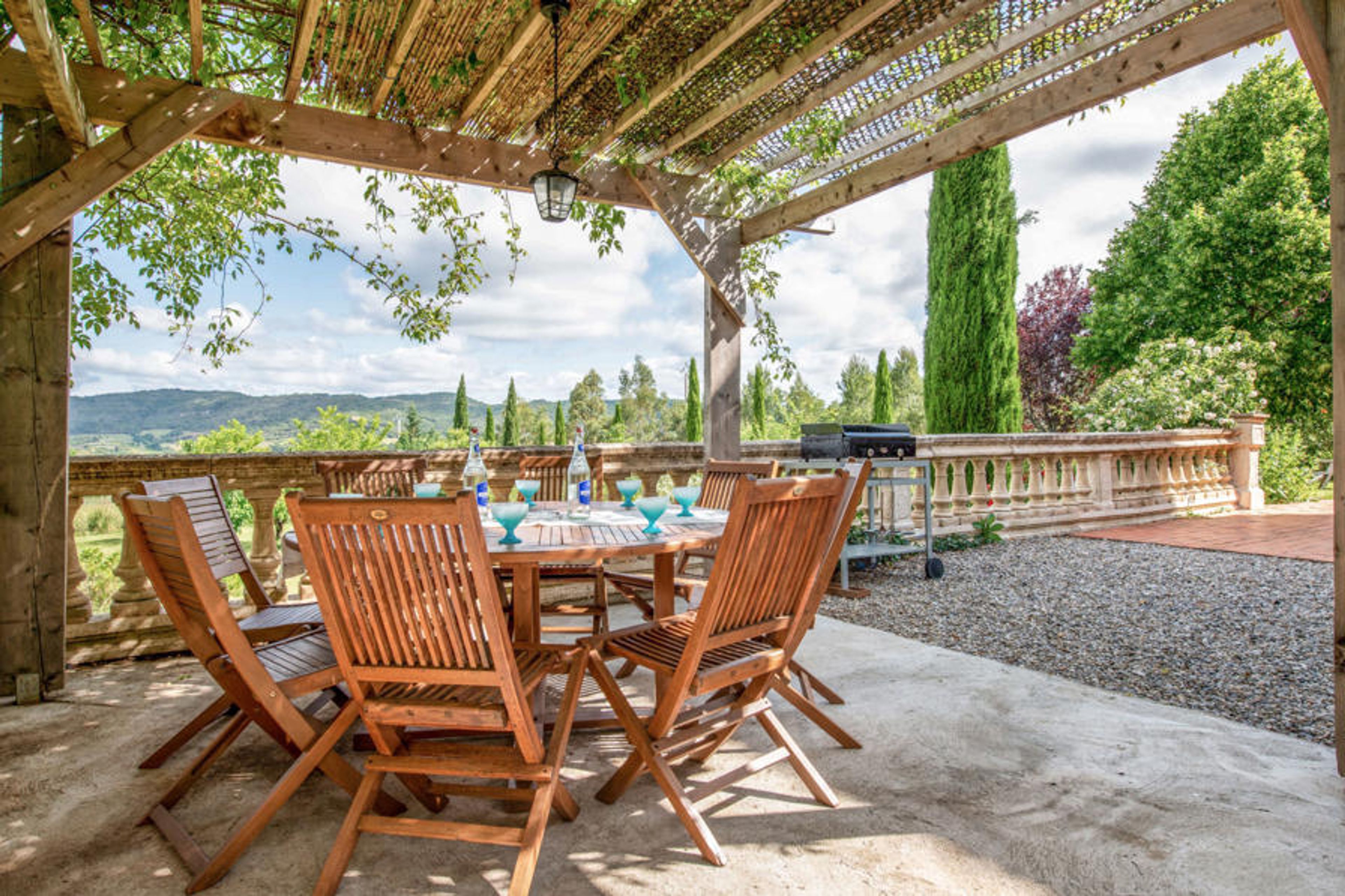 6-room house 300 m2 on 3 levels. Partly renovated in 2025, stylish furnishings: large living/dining room 120 m2 with TV and international TV channels (flat screen), DVD and air conditioning. Exit to the terrace. 1 room with 2 beds. 1 room with 1 french bed (160 cm, length 200 cm), separate WC and shower. 1 room with 1 french bed (140 cm), separate WC and shower. Open kitchen (oven, dishwasher, 4 ceramic glass hob hotplates, microwave, freezer, electric coffee machine, Capsules for coffee machine (dolce gusto) extra) with dining table. Shower/WC. Upper floor: (spiral staircase), 1 room with 1 french bed (160 cm, length 200 cm). 2nd upper floor: (spiral staircase) lounge. Electric heating. Porch 12 m2, south facing position. Terrace furniture, barbecue (portable), deck chairs (8). Marvellous panoramic view of the valley and the countryside. Facilities: washing machine, iron, hair dryer. Garage (2 cars), height 225 cm, width 237 cm. Please note: maximum 1 pet/ dog allowed. Smoke alarm. 3 wall fountains and a skylight in the living room. Alambra mosaics (Arabic type) throughout the house. The rooms located upstairs are in the tower, the living room is accessible via the double bedroom only from where we have a 180 degree view of the surrounding countryside. A plancha (gas) has been installed on the terrace near the kitchen. Please note: Air conditioning is only available in the bedrooms.
