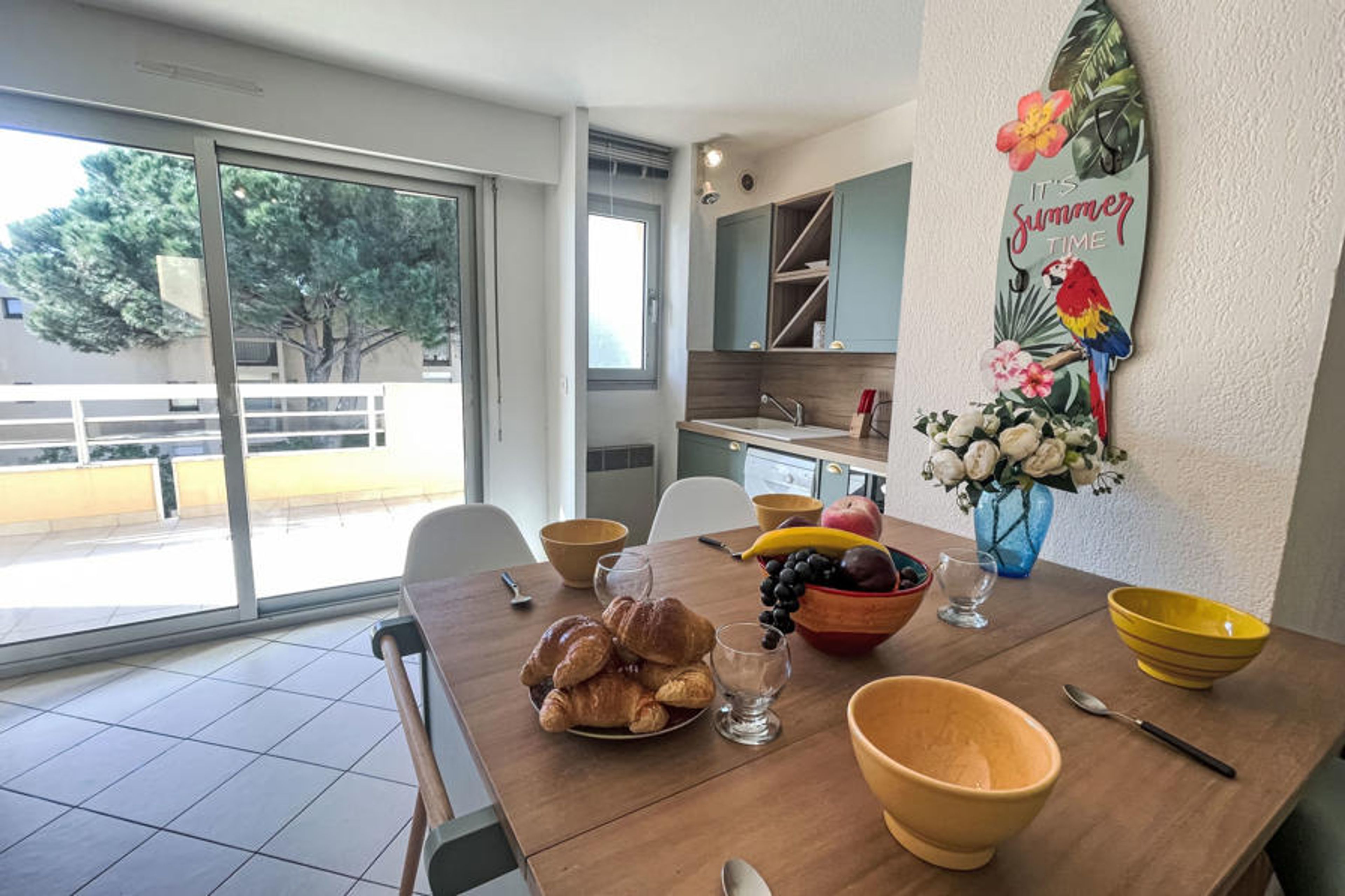 2-room apartment 35 m2 on 2nd floor. Comfortable and beautiful furnishings: living/dining room with 1 double sofabed (130 cm, length 190 cm), TV and flat screen. Exit to the terrace. 1 room with 1 french bed (140 cm, length 190 cm). Exit to the terrace. Open kitchen (4 hot plates, oven, dishwasher, toaster, kettle, electric coffee machine). Shower, sep. WC. Heating, air-conditioning. Terrace 14 m2, west facing position. Terrace furniture, deck chairs (2). View of the sea. Facilities: washing machine, iron, hair dryer. Internet (WiFi, free). Parking space n 203 (1 car). Please note: maximum 1 pet/ dog allowed. TV only FR. Smoke alarm. Offer by a private individual according to Art. 155, IV of CGI.