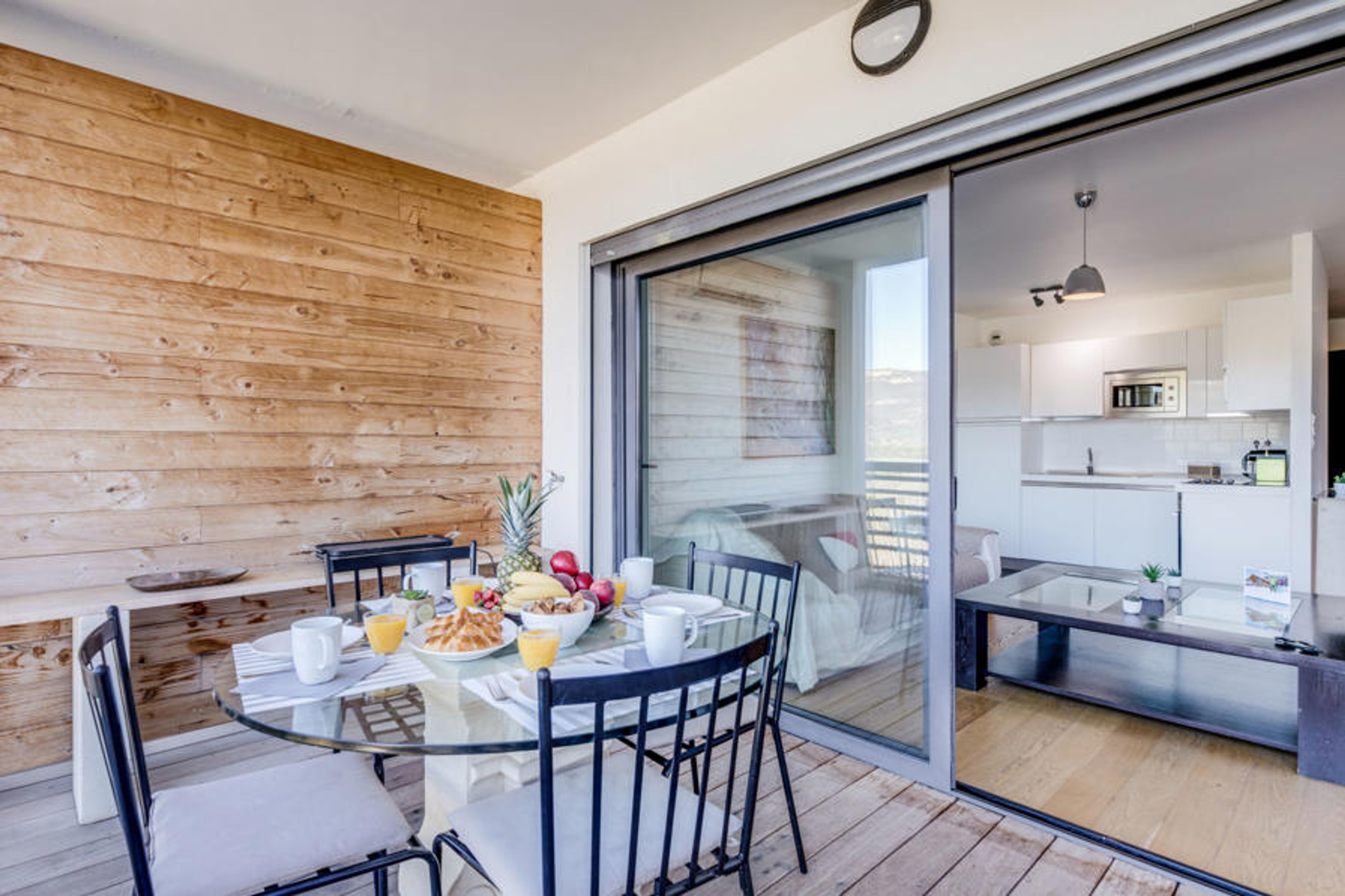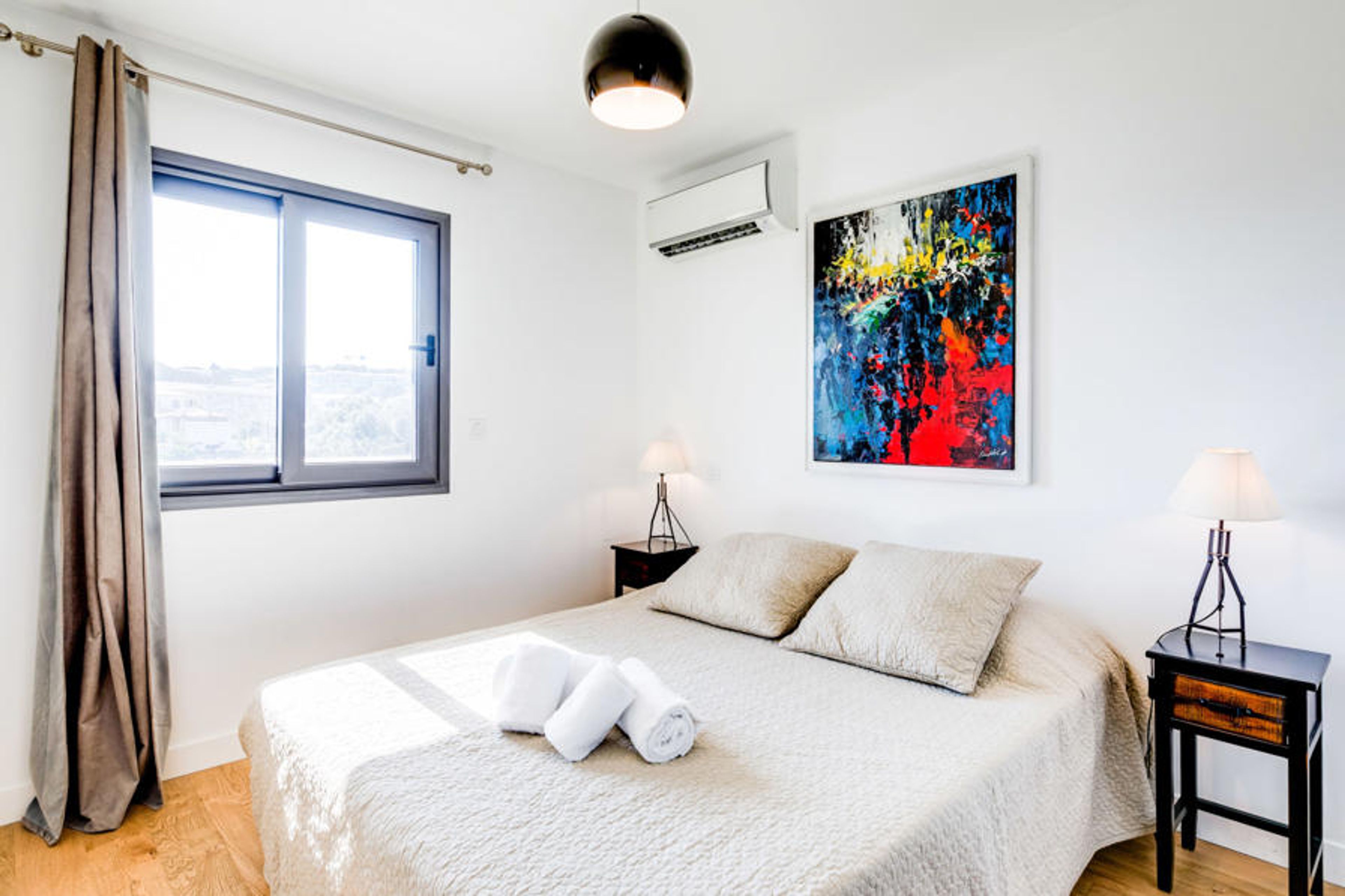 2-room apartment 57 m2 on 3rd floor. Comfortable and cosy furnishings: living/dining room with 1 double sofabed (140 cm, length 190 cm), TV (flat screen). Exit to the balcony. 1 room with 1 french bed (160 cm, length 200 cm), TV (flat screen). Open kitchen (4 hot plates, oven, dishwasher, toaster, kettle, microwave, electric coffee machine). Shower/WC, sep. WC. Electric heating, air-conditioning. Balcony 12 m2. Balcony furniture. View of the swimming pool. Facilities: washing machine. Internet (WiFi, free). Please note: non-smokers only. Smoke alarm.