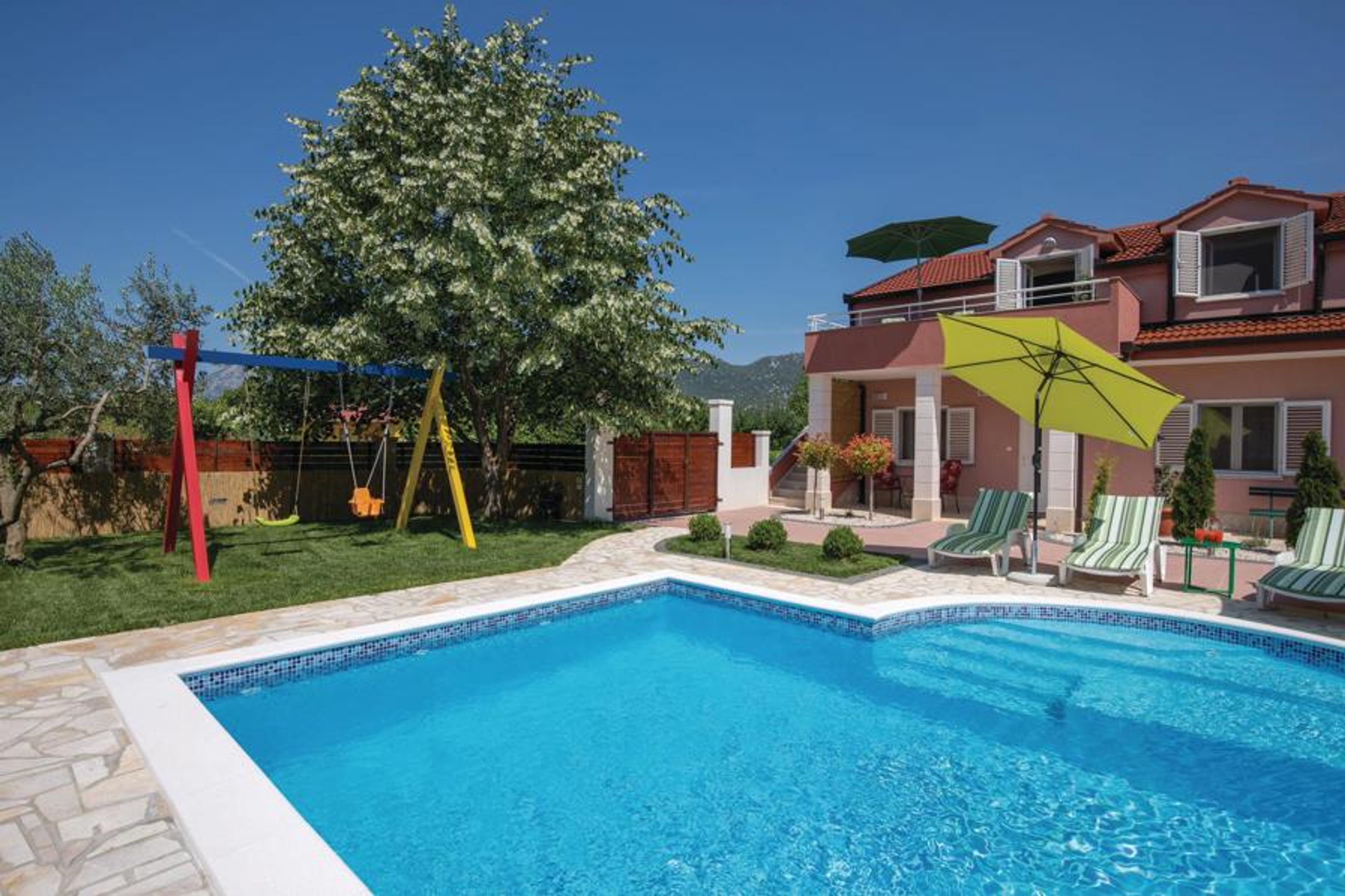 This wonderful holiday home with pool in Baina enjoys an idyllic location not far from a lake. A beautifully furnished interior provides comfort as a pleasant living ambience spread over two floors with external stairs. On the ground floor there are two bedrooms, a bathroom and a separate kitchen with barbecue and leisure room. On the first floor there is a kitchen-living room with dining area, two bedrooms and a bathroom. Outside there is a lovely pool with sunbathing area and a covered terrace. The lake is approx. 300 m away and the sandy beach is approx. 15 minutes away by car. Baina is a quiet Dalmatian village with good excursion possibilities to Dubrovnik, Korula, Mostar and Medjugorje, if you want to enrich your holiday with culture.