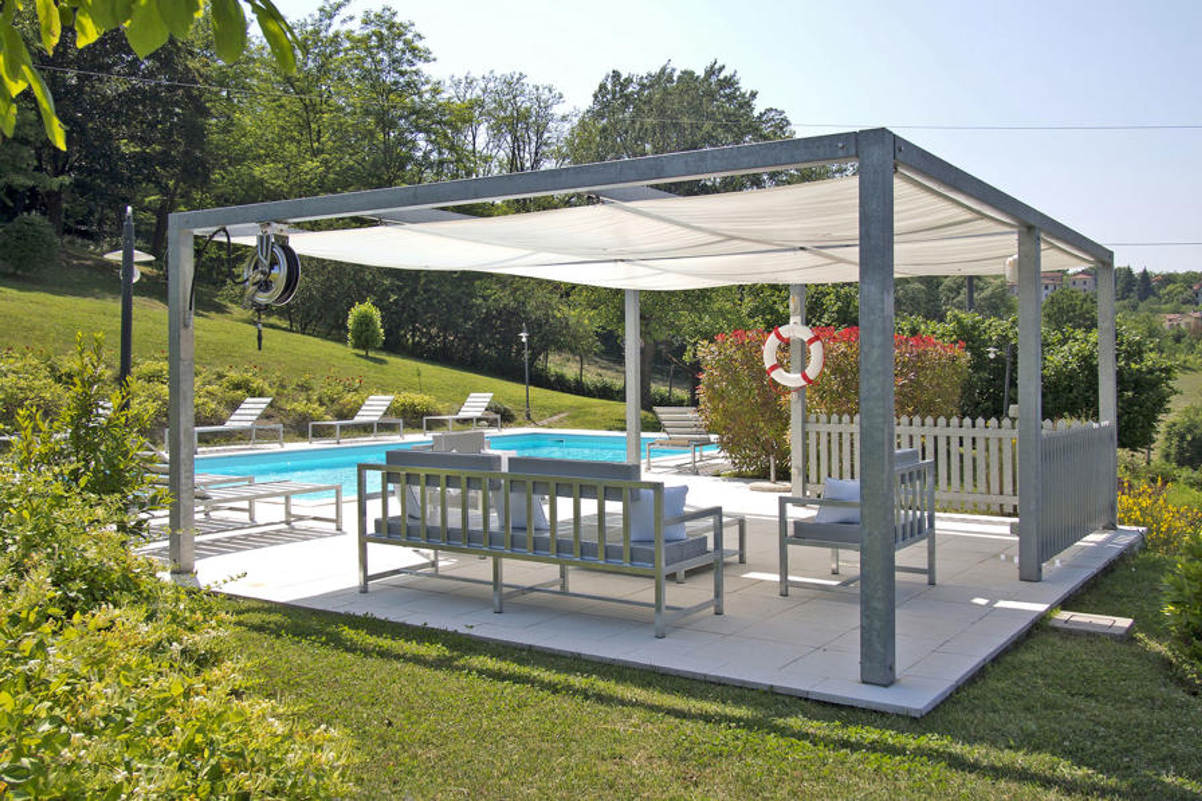 Historical manor house "Villa Sarezzano", built in 1930. 400 m from the centre of Sarezzano, 8 km from the centre of Tortona, 21 km from the centre of Alessandria, 75 km from the sea. Private: property 5'000 m2 (fenced), terraced garden with wildlife garden and trees, meadow, swimming pool (12 x 6 m, depth 110 - 130 cm, seasonal availability: 23.May. - 03.Oct.). Terrace, garden furniture, barbecue. In the house: hot tub, infrared sauna. Stepped path to the house. Parking (for 3 cars) on the premises. E-charging station. Shop 1 km, supermarket 6 km, bus stop 1.7 km, railway station "Tortona" 8 km. Golf course (18 hole) 18 km. The owner does not accept any youth groups.