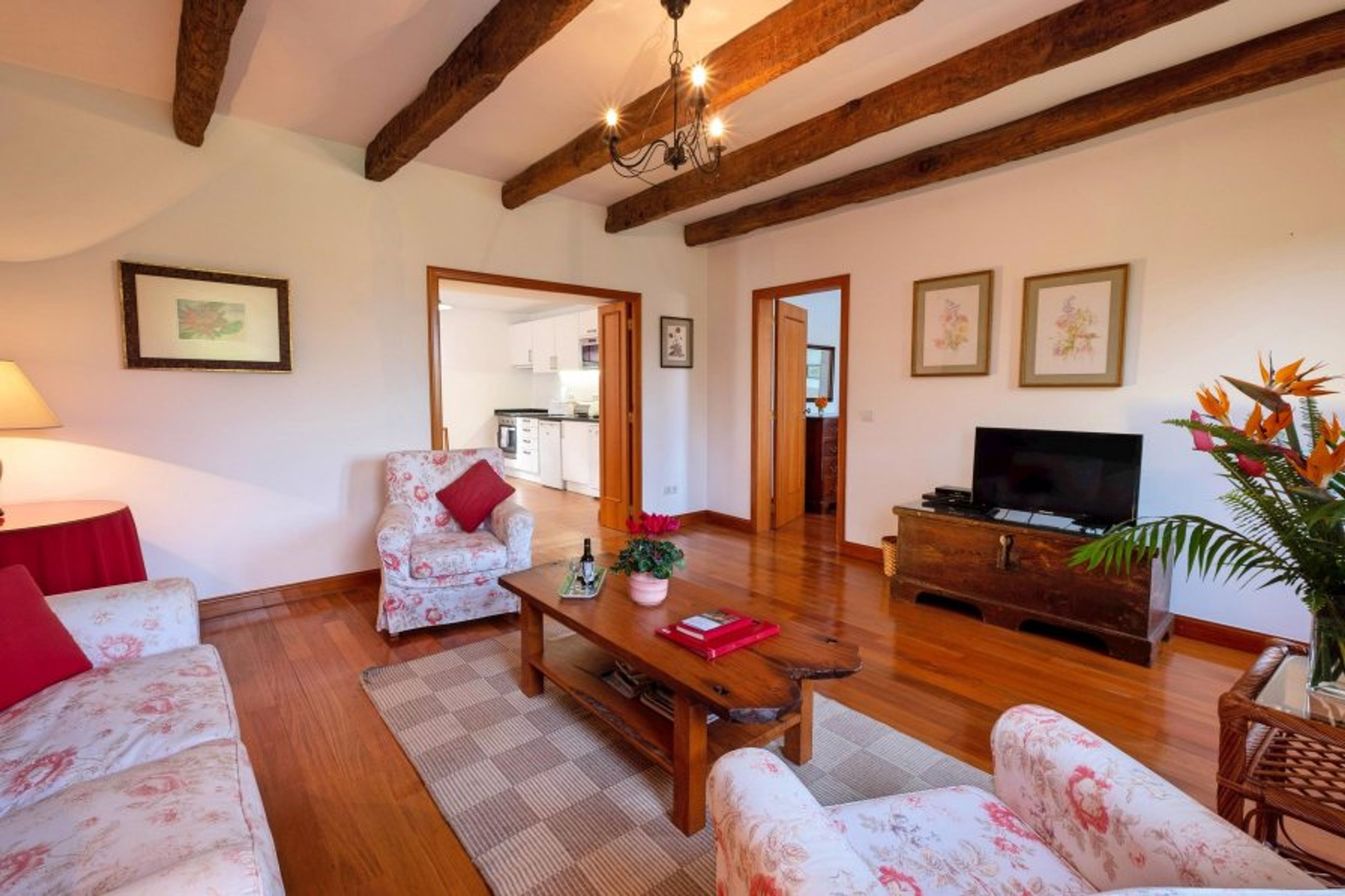 Loja da Lenha has comfortable ground floor accommodation for 2 guests. The entrance opens into a well-furnished living room which features original chestnut beams, one stone wall and a coffee table locally crafted from beams used in the Quinta. There is a sofa, 2 armchairs, TV with over 600 cable channels, including German satellite channels, broadband access and table lamps for reading. Beyond, the kitchen/diner has table/chairs for 4, an electric hob, oven, dishwasher, microwave, fridge, toaster, and kettle and plenty of serving/cooking equipment.