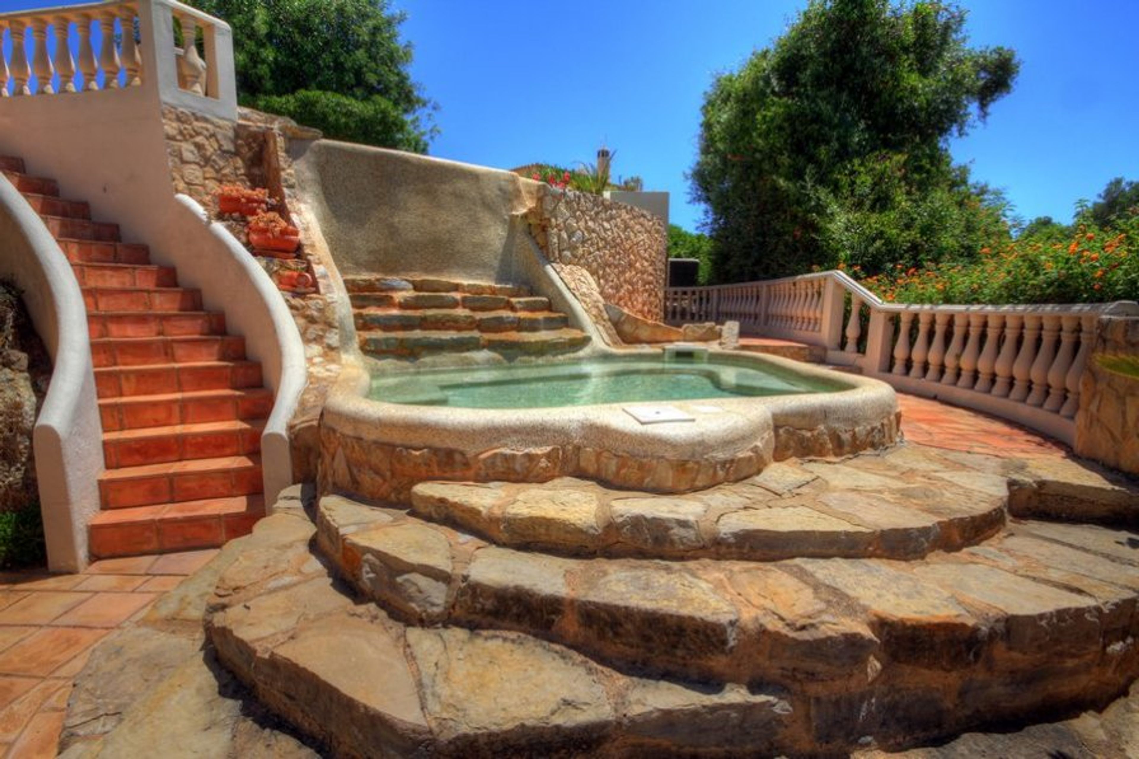 The stunning swimming pool area is big feature of the villa with a large infinity pool with a waterfall feature that runs down into a smaller pool. Each of the pools has a jacuzzi type seating area.