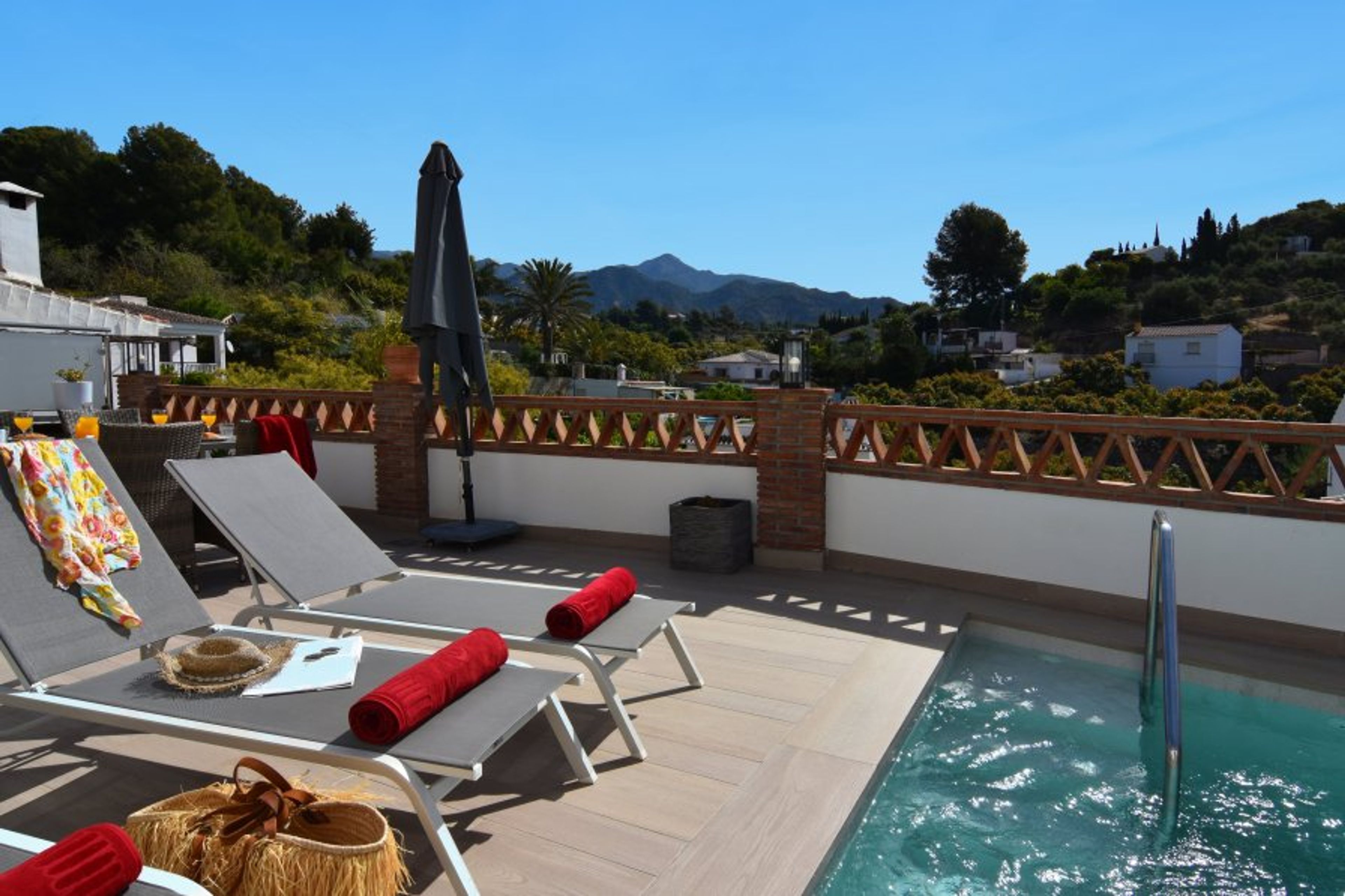 Here you will get the best of both worlds: the slow pace of the Andalusian countryside while urban life is never far away. The cottage is located in the Imaroga area, at a short distance from Nerja (3 km) and Frigiliana (3 km). The famous Burriana beach is just a 10 minute drive away. The outside area has a spacious sun terrace next to the private pool with 4 sun loungers. You will also spend a lot of time on the terrace, a very suitable place for your barbecue dinners; it is fully equipped with patio furniture. The view to the avocado fields with Nerja and the surrounding hills as a backdrop is stunning. On the first floor, a lovely sun terrace lets you see the Mediterranean.