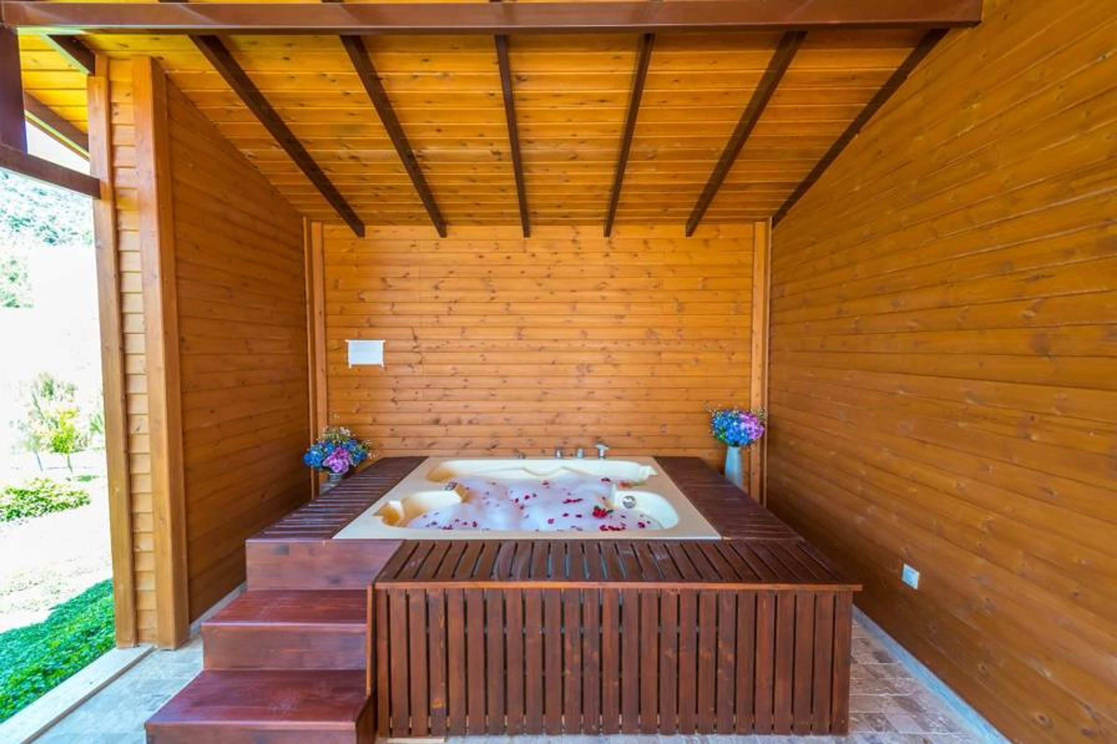 The bedroom is sleek and contemporary with whitewashed walls and natural-coloured furnishings. From the bedroom, you can step right out onto your sun lounged lined terrace where there’s a valley-edge swimming pool and al fresco dining table. Find your perfect spot in the sun or the shade, and swim right up to the water's edge to maximise your idyllic rural vistas. Roka Evi also benefits from an indoor and outdoor Jacuzzi for a serene spa-like feel – just slide in with your glass of wine.
