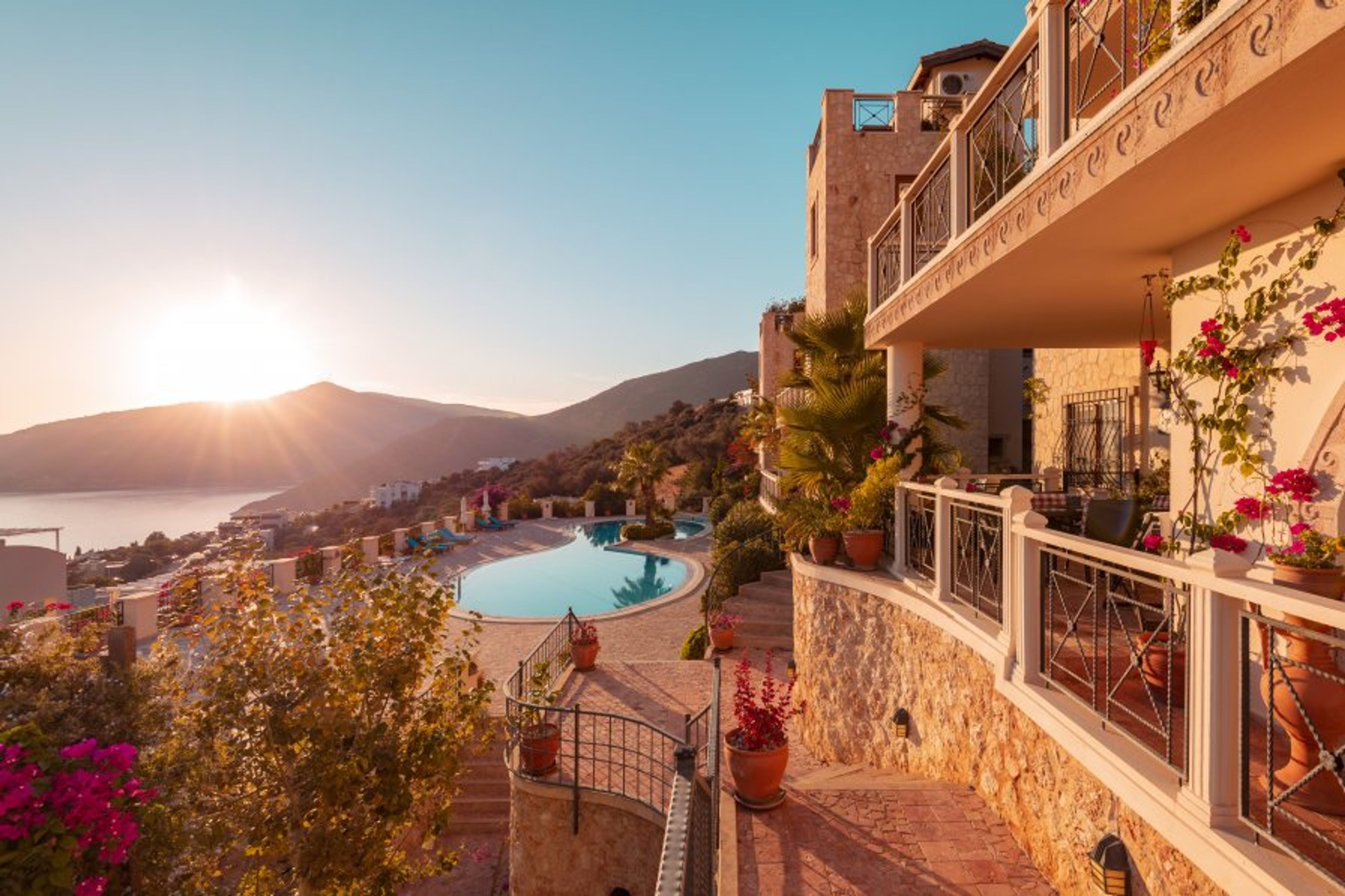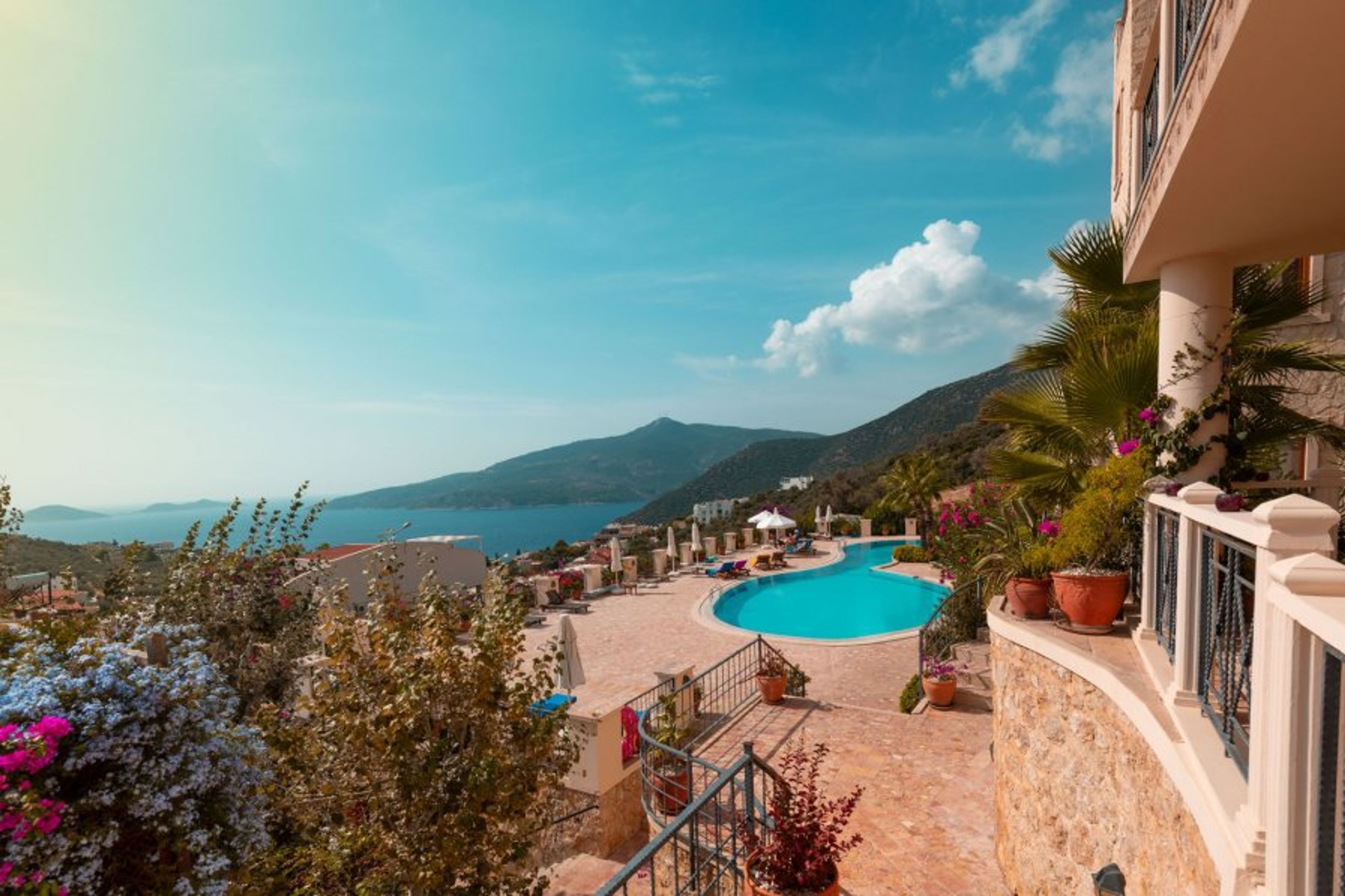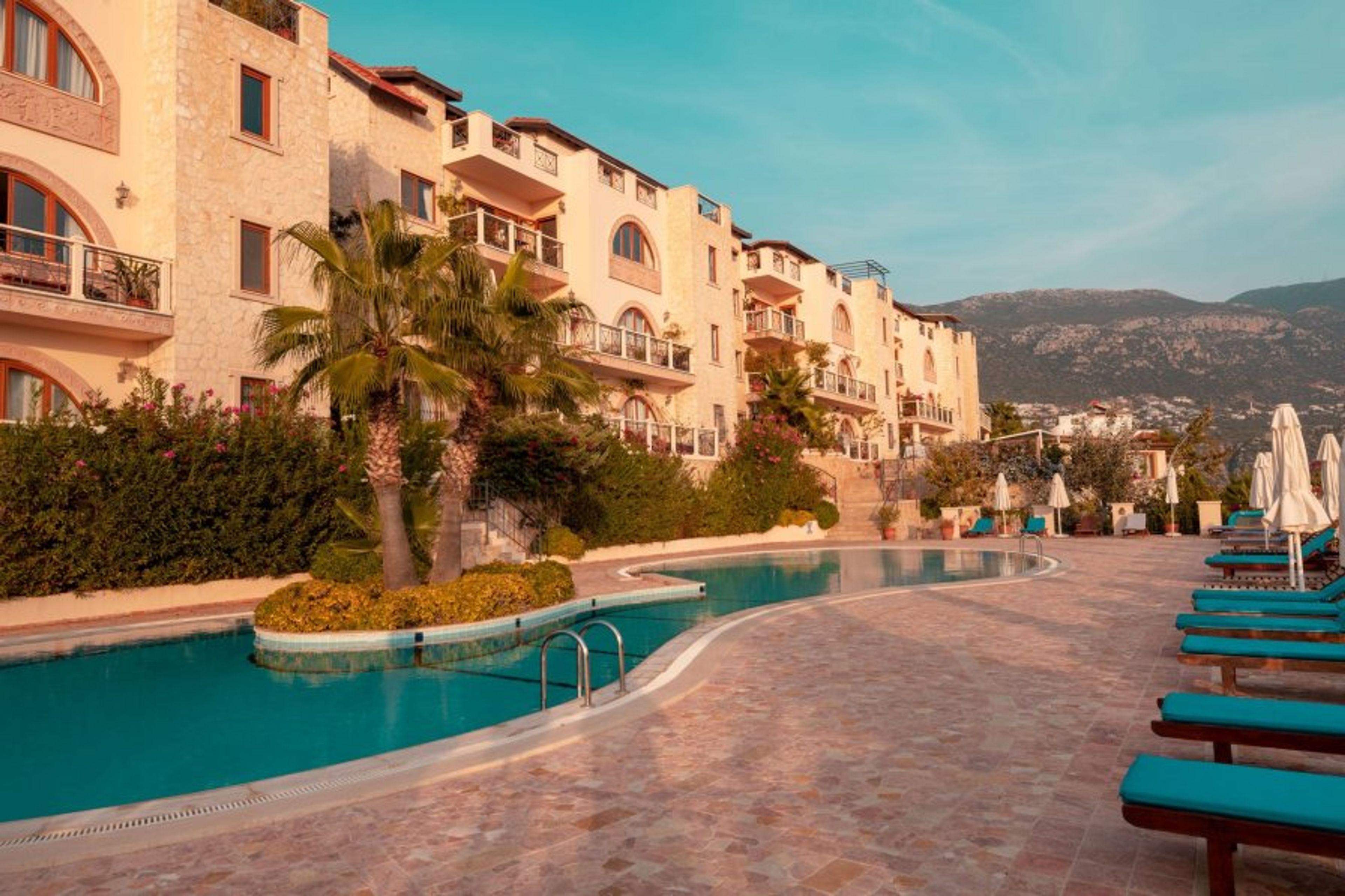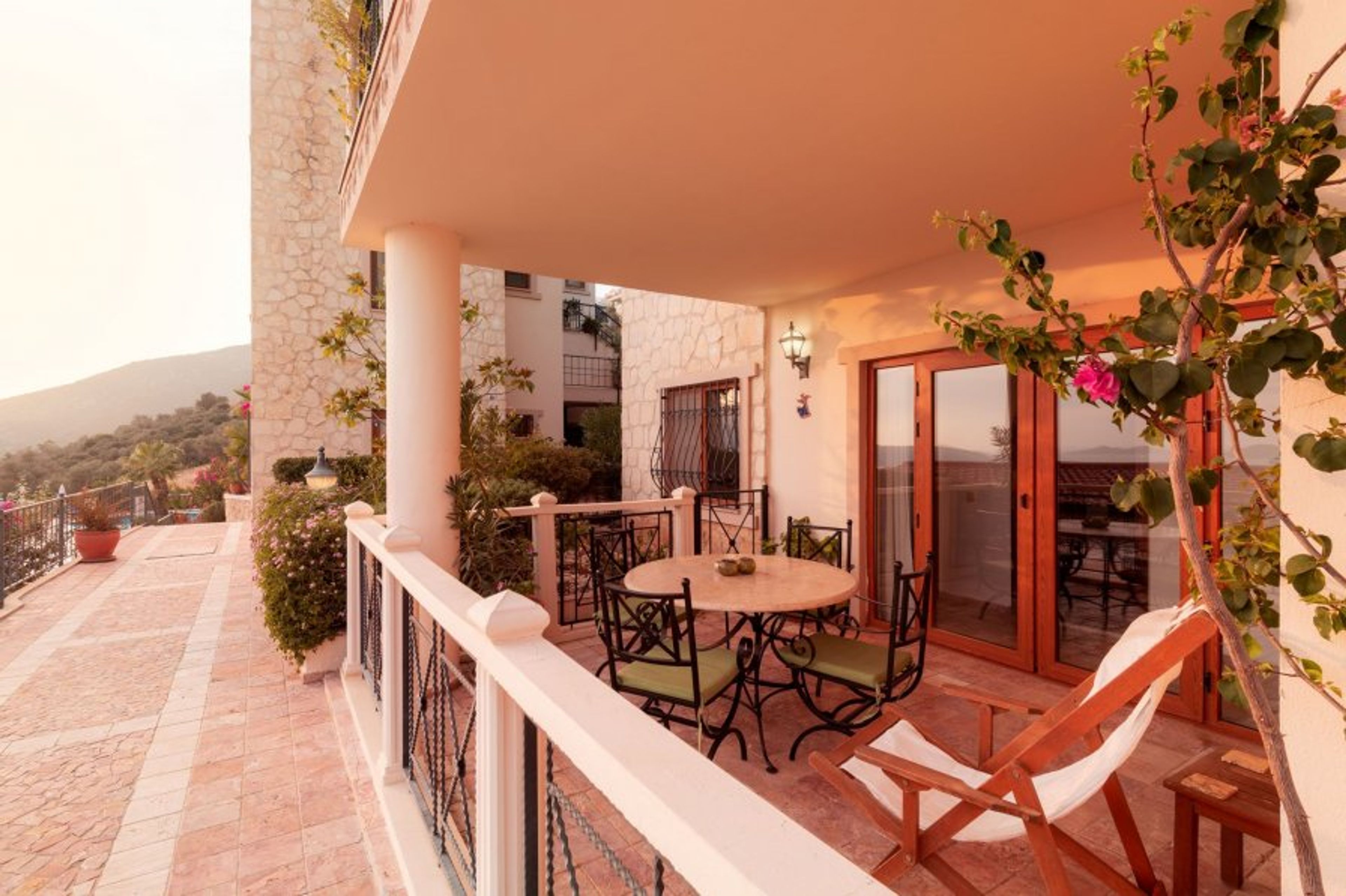 *Outside, Double patio doors to a large balcony overlooking the pool and Kalkan and Kalamar Bays. Marble-topped wrought iron table with matching chairs. The complex is surrounded by landscaped gardens with a stunning free-form, shared swimming pool. Sun loungers and umbrellas are provided.