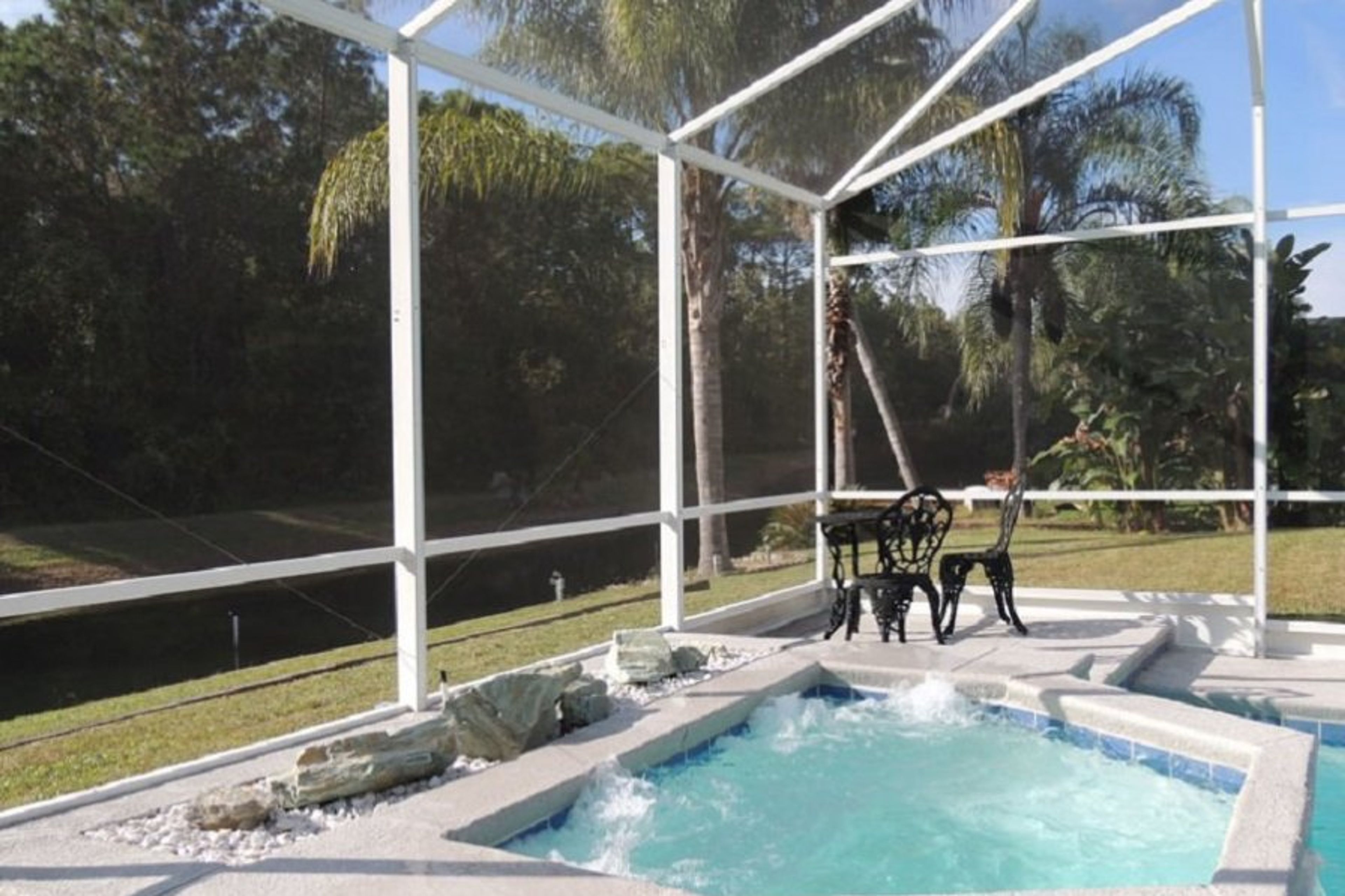To enjoy the warm Florida evenings there is external lighting in the very private pool & deck area which backs on to two small lakes and is overlooked by nobody.