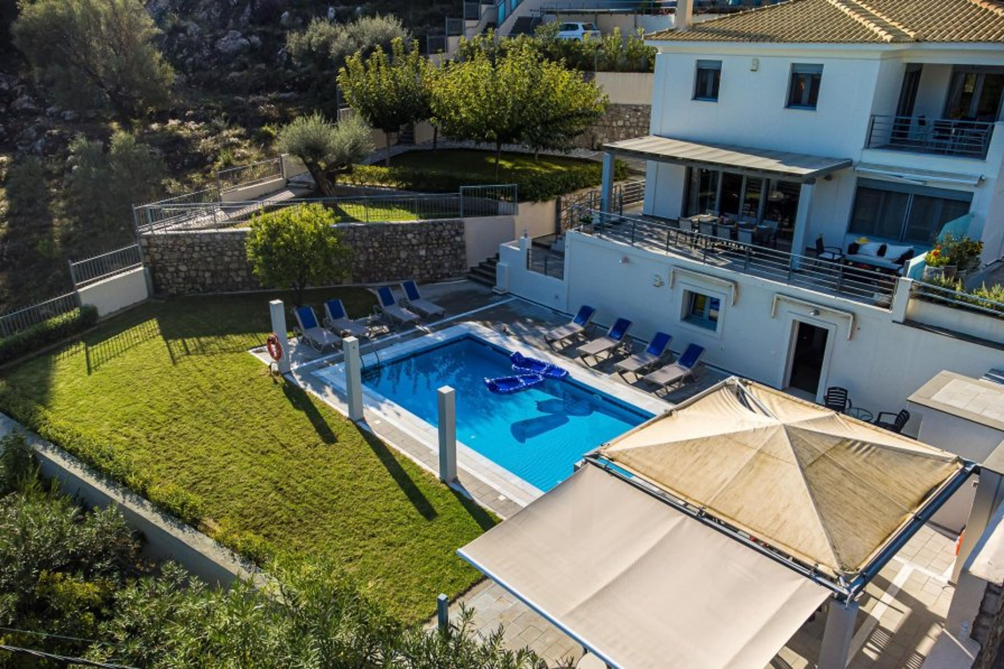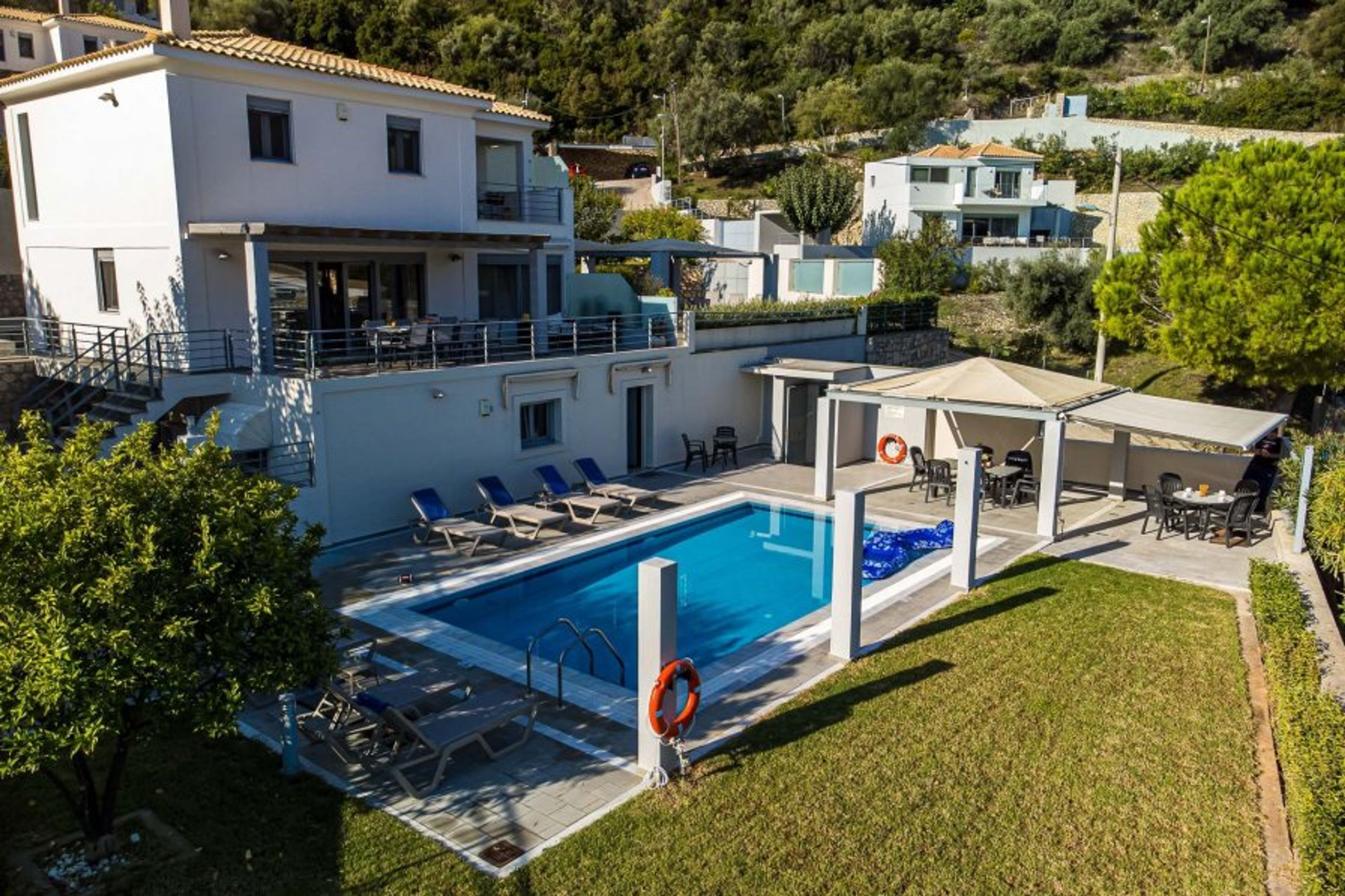 A particular advantage of the villa is the large terrace with dining table and sofas, with magnificent views of the green hills of Lefkada and the blue waters of the Ionian Sea.