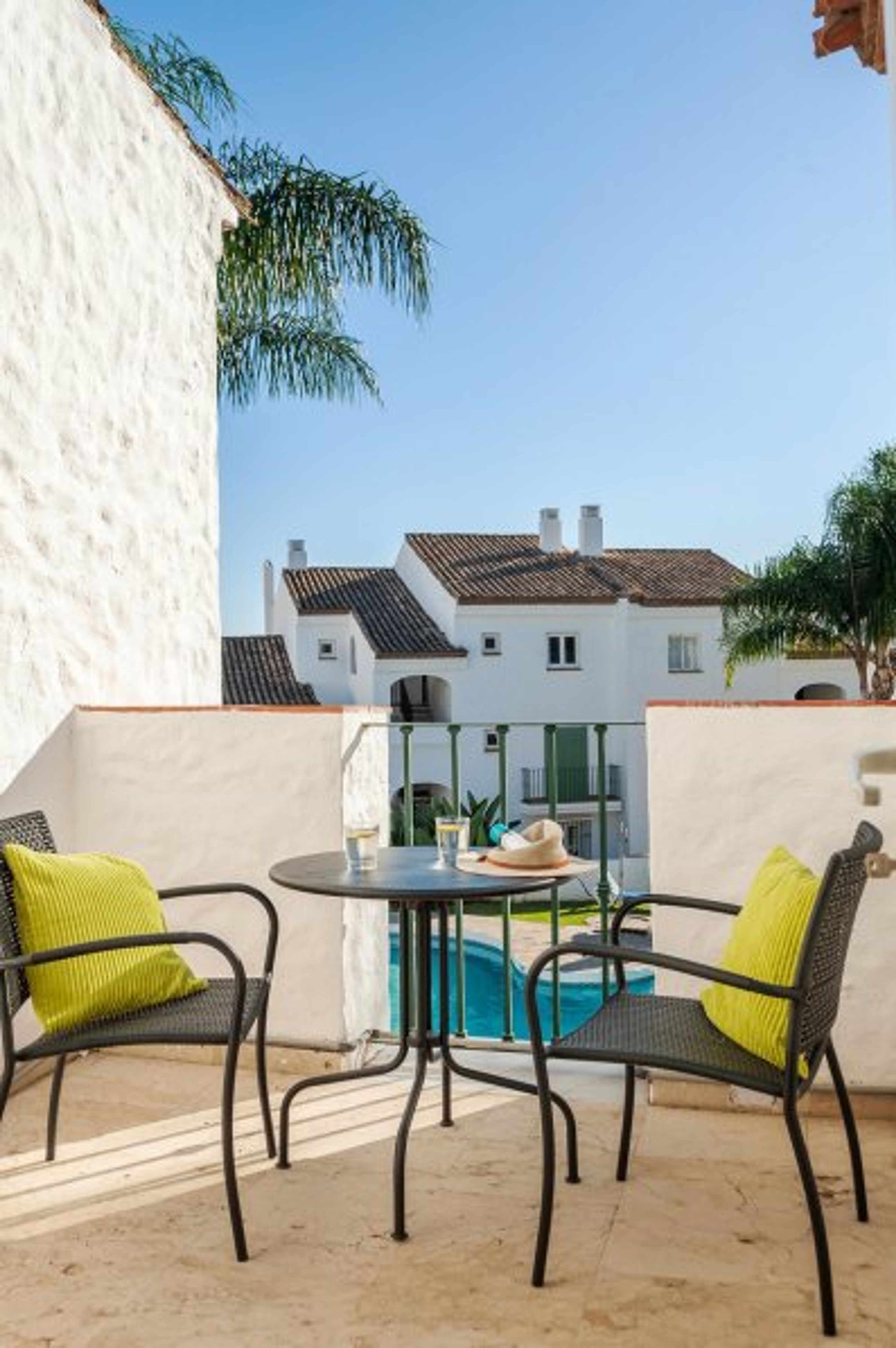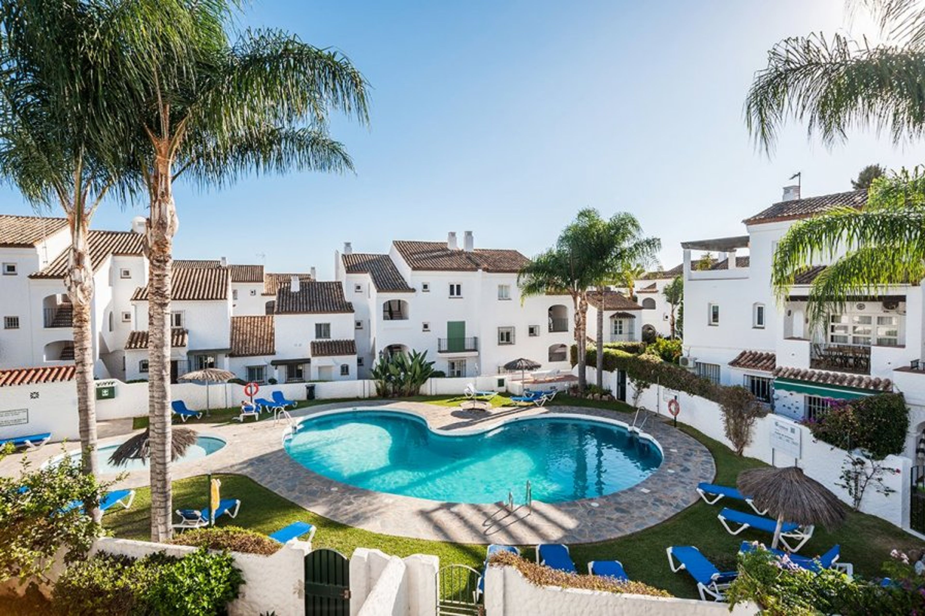 Charming two bedroom two bathroom townhouse with direct access to pool area, small private garden and full WiFi located within easy walking distance of restaurants, bars, shops and amenities.