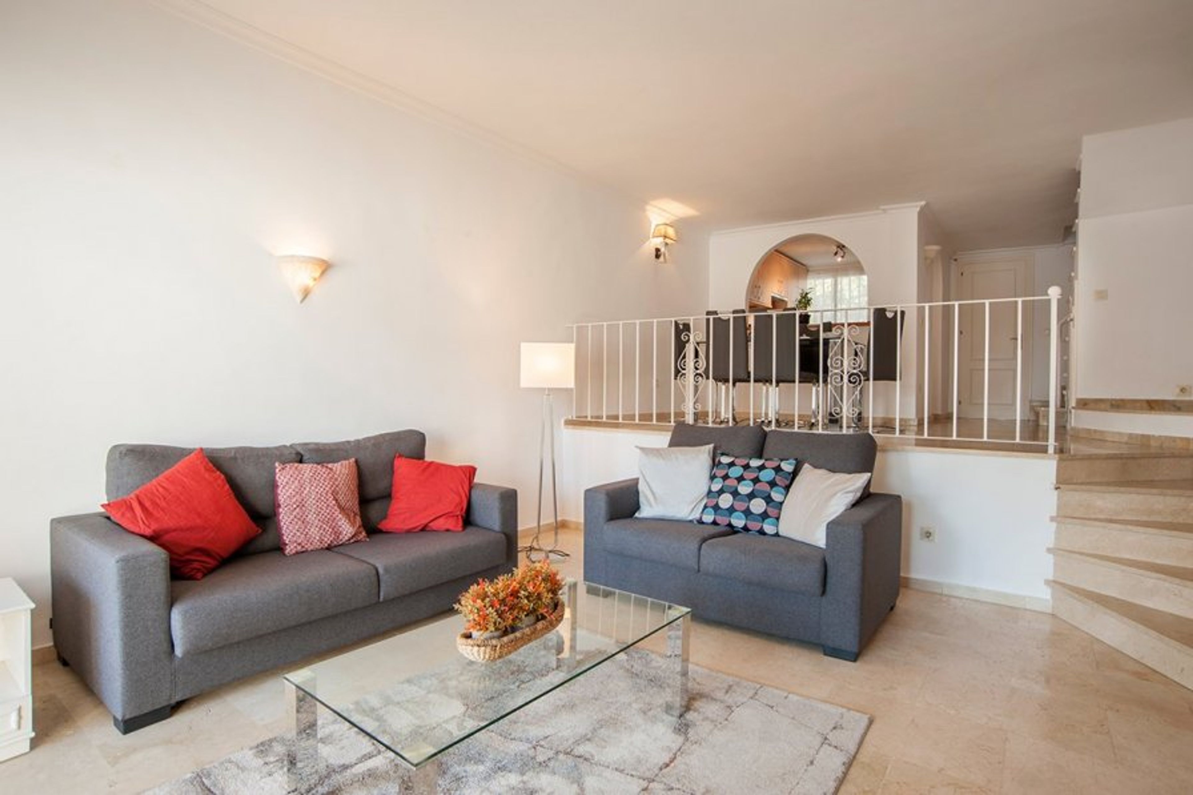 This charming two bedroom two bathroom townhouse is located on the friendly family orientated urbanisation of Benavista with all local amenities close to hand and within walking distance if you do not wish to hire a car. The lower level of the townhouse has a fully fitted modern kitchen, cloakroom, and spacious dining and lounge area. From this here you can access the covered terrace area which is furnished for outside dining. The small private garden area has direct access to the pool area which is very convenient. There is a kidney shaped pool and childrens splash pool. The upper level consists of the master bedroom with double bed, en suite shower room and small terrace overlooking the garden and pool area. Across the hallway is the twin bedroom with adjacent family bathrooom. The townhouse has recently been refurbished and furnished and has air conditioning and full WiFi service. It is located on the main bus route to Estepona, San Pedro, Puerto Banus and Marbella and taxis are readily available nearby. Within walking distance, there is a number of bars, restaurants, shops and banks all conveniently located for your holiday. The beach is just a gentle 10 minute stroll away. If you wish to go further afield, the pretty towns of Estepona and San Pedro are just a short distance away with Puerto Banus and Marbella also closeby. The property is located in between Malaga and Gibraltar airports giving you a wider choice of flights and airlines. All in all a perfect holiday getaway!