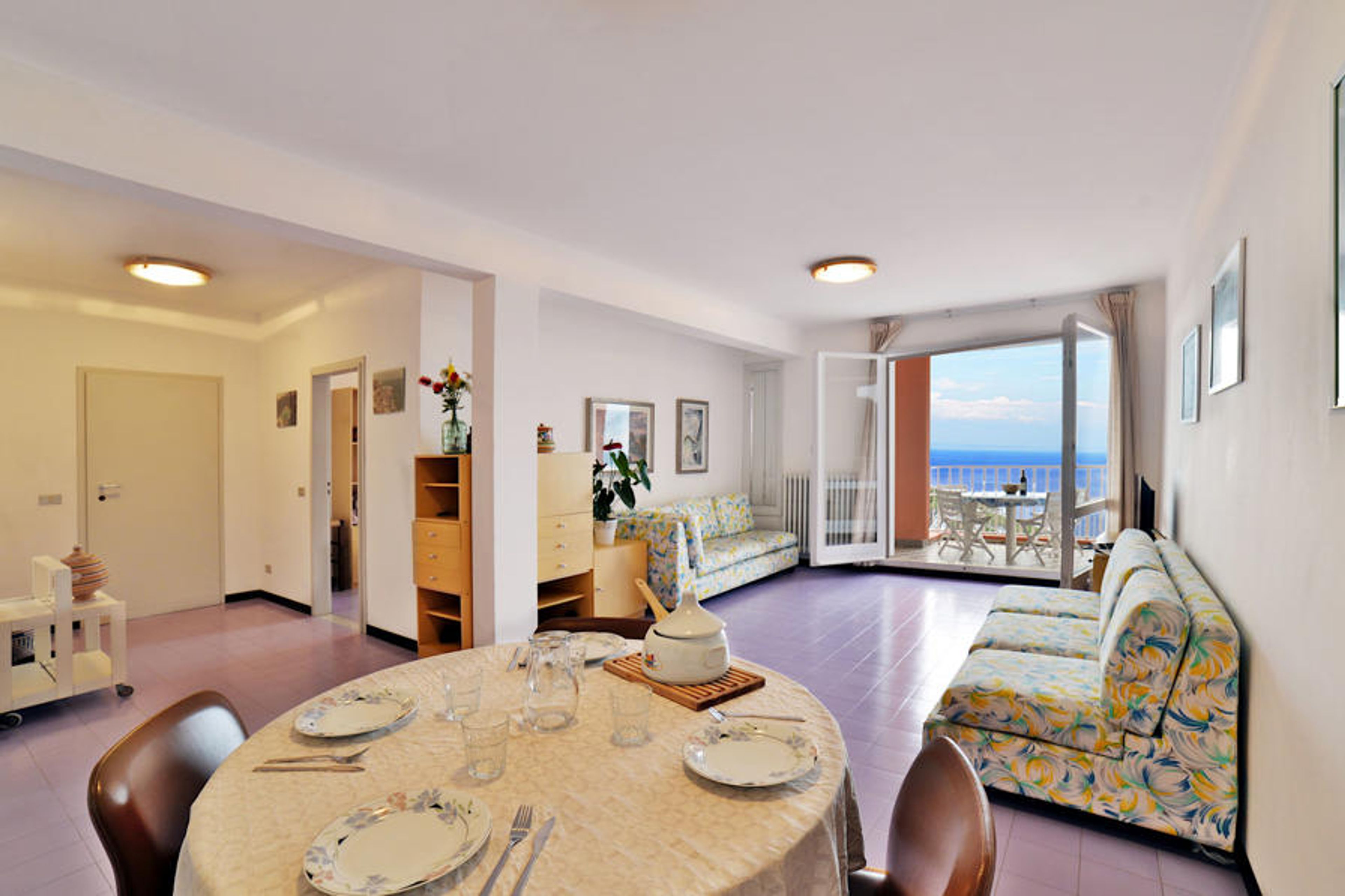 4-room apartment 100 m2 on 1st floor. Spacious and bright, comfortable furnishings: living room with dining table and TV. Exit to the terrace. 1 double bedroom with fan. Exit to the balcony. 1 room with 1 bed, 1 pull-out bed and fan. Exit to the balcony. 1 room with 2 beds and fan. Exit to the terrace. Open kitchen (mini-oven, dishwasher, 4 induction hot plates, kettle). Bathroom, shower/bidet/WC. No heating option. Balcony, terrace roofed. Terrace furniture. Marvellous view of the sea. Facilities: washing machine, baby cot for up to 2 year olds, hair dryer. Parking at 70 m. Please note: non-smoking house. No mandatory extra charges to be paid on-site. IT049021C2H6WAVJZG