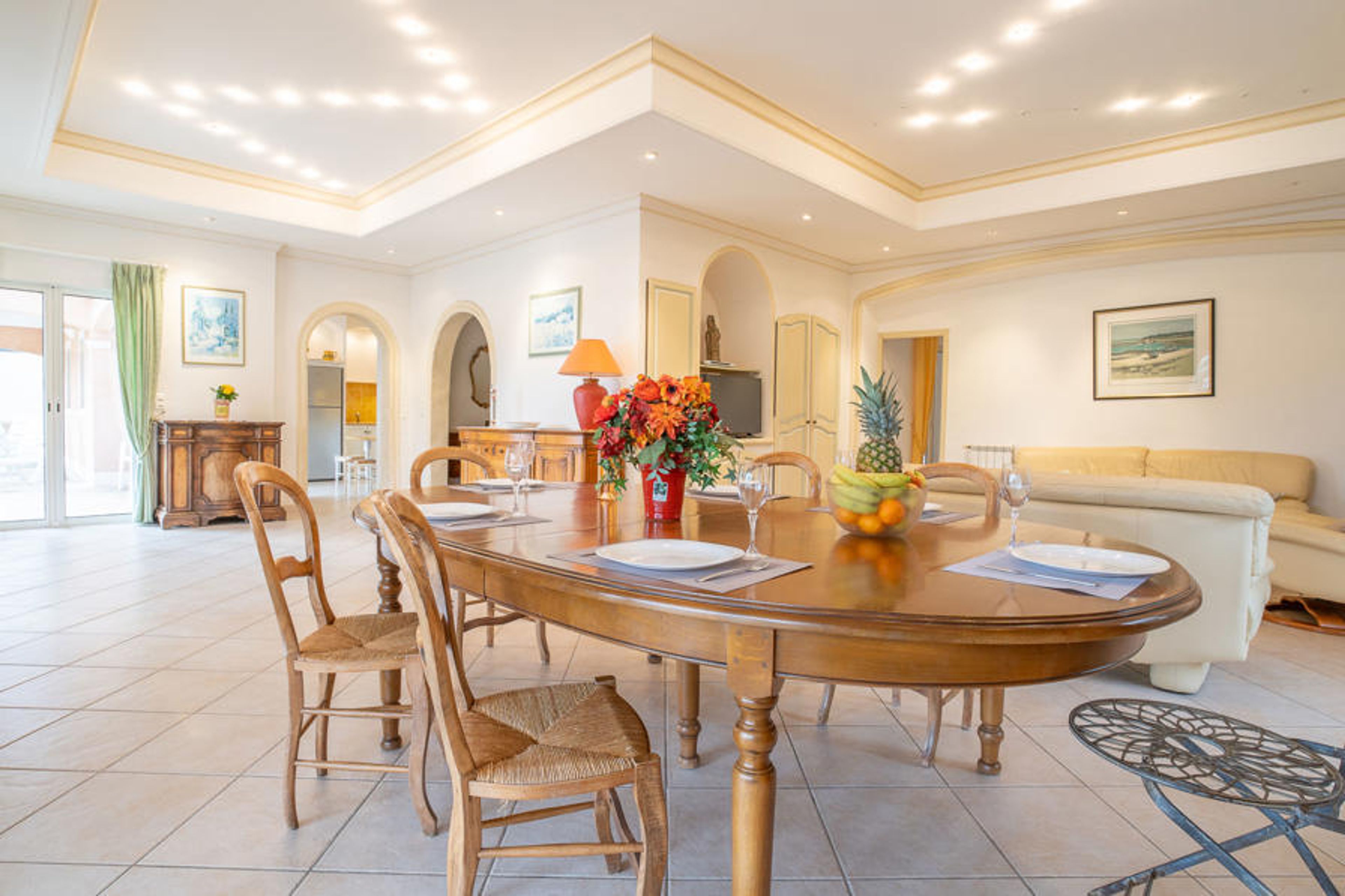 "La Pinède", 5-room house 230 m2. Bright, comfortable furnishings: living/dining room 80 m2 with open-hearth fireplace (only for decoration), dining table, satellite TV, flat screen, DVD and electric shutters. Exit to the terrace. 1 room with 1 french bed (160 cm, length 200 cm), bath/WC, digital TV, flat screen and air conditioning. 1 room with 1 french bed (140 cm, length 190 cm), 1 folding bed (80 cm, length 190 cm). Exit to the terrace. 1 room with 1 french bed (1 x 160 cm, length 200 cm). 1 room with 1 french bed (140 cm, length 190 cm). Kitchen (oven, dishwasher, 5 ceramic glass hob hotplates, microwave, freezer, electric coffee machine). Exit to the terrace. Shower, 2 sep. WC's, double hand-basin. Oil heating. Terrace 110 m2 partly roofed. Terrace furniture, deck chairs. Beautiful view of the sea. Facilities: washing machine, iron, children's high chair, baby cot. Internet (WiFi, free). Please note: non-smoking house. Smoke alarm. 831070010321D