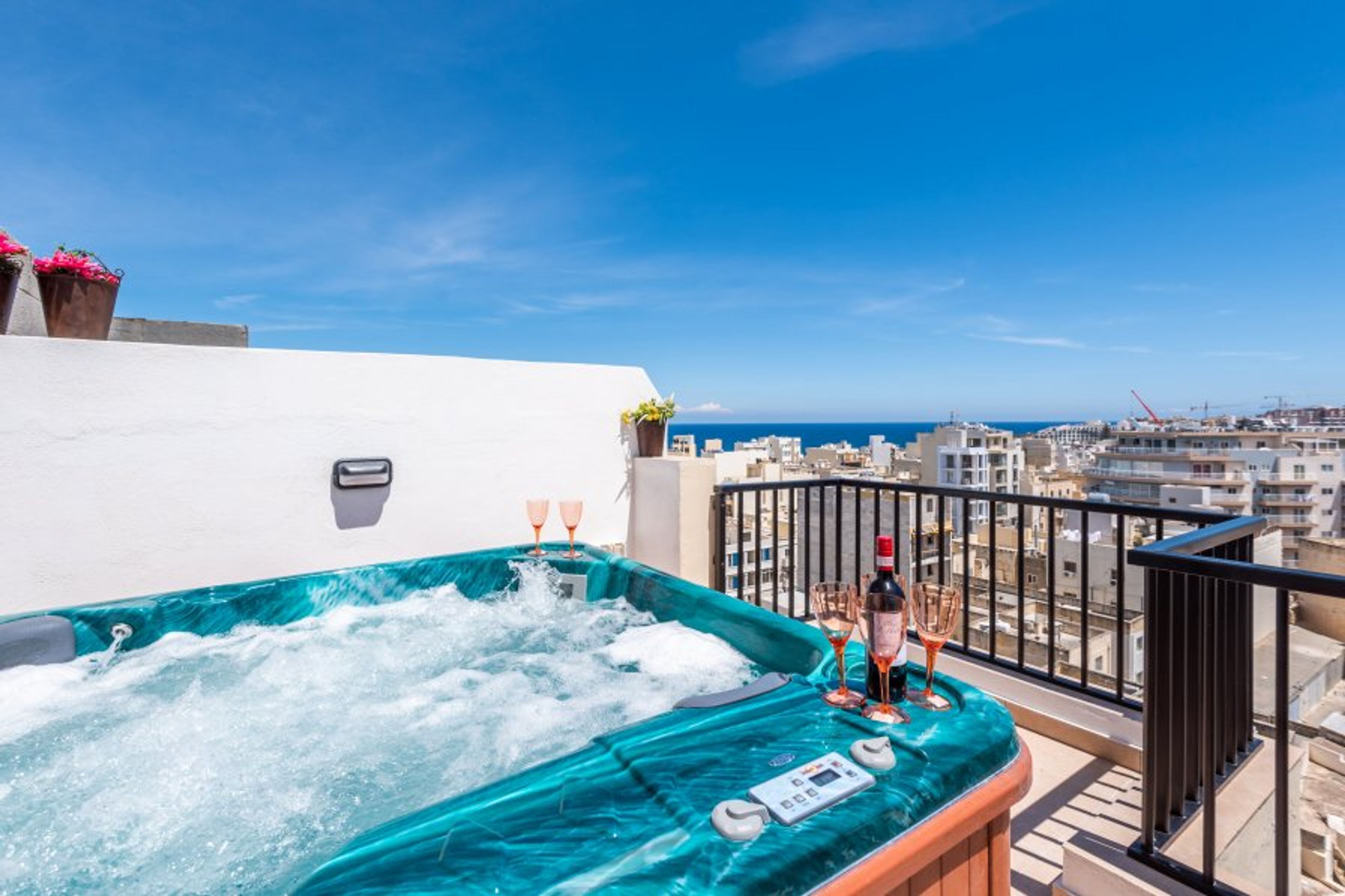 Brand new modern-finished one bedroom apartment with terrace fully equipped with BBQ, outdoor furniture, sunbeds, and hot tub / Jacuzzi. Located just 150 meters off the Bugibba promenade, in a block of self-catering holiday apartments. The apartment is fully air-conditioned (generous usage limits apply. Please check in the pricing)