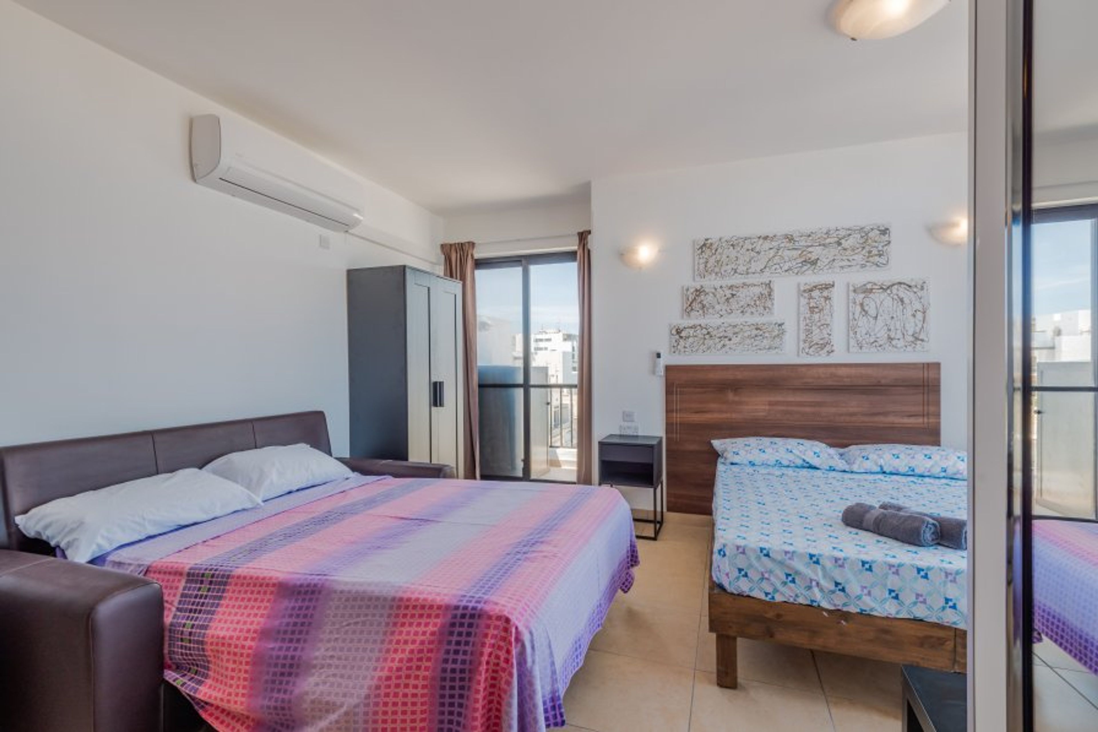 This Sea-view studio penthouse is on the 7th floor and has a lovely terrace with commanding views of most of St Paul’s Bay including St Paul’s Islands. The Terrace is equipped with a gas BBQ and garden furniture (sunbeds, chairs, and table).
