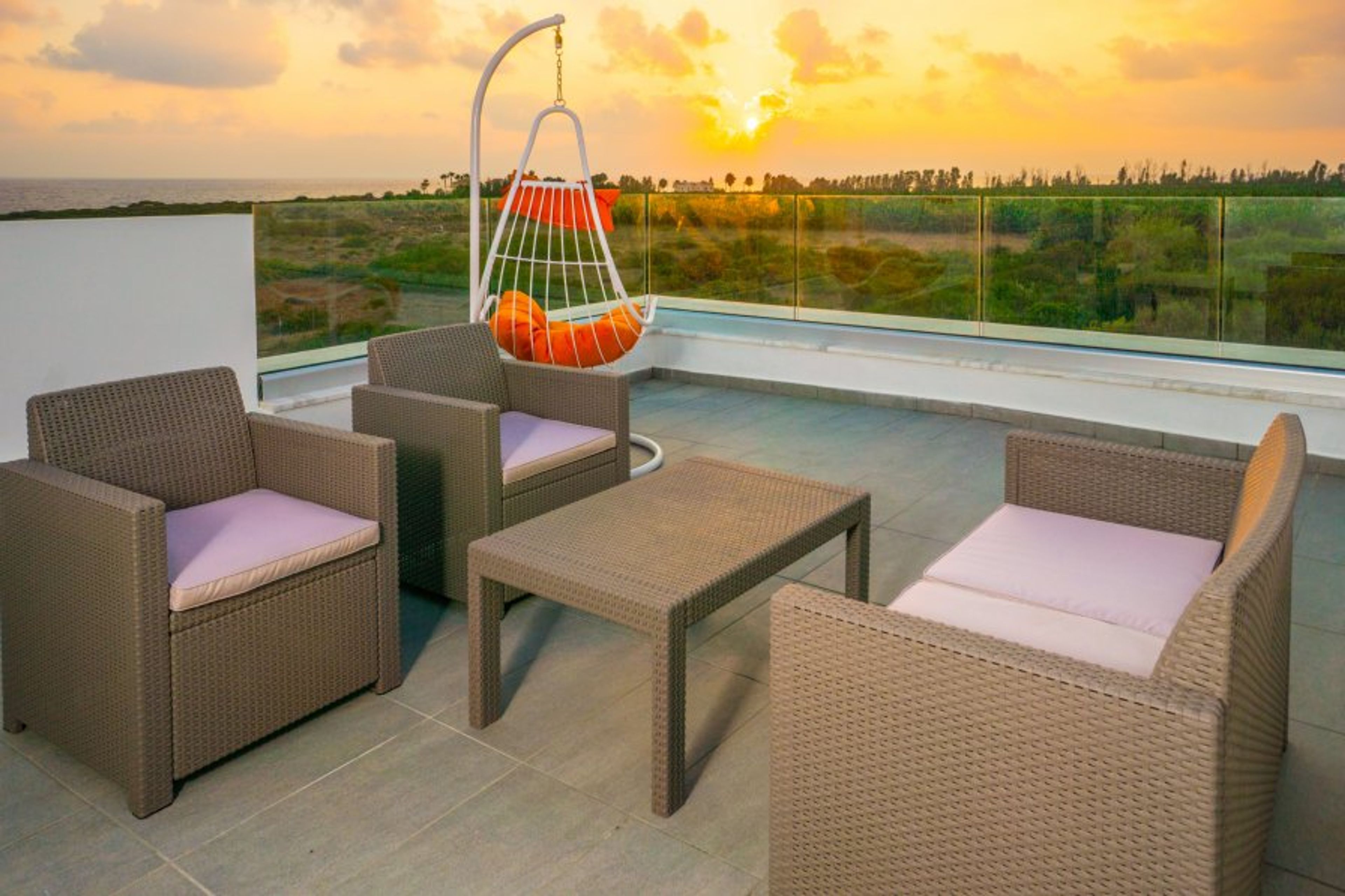 Spend mornings sipping coffee on the rooftop while gazing out over the Mediterranean. Fill your afternoons with sunshine—chill on a sunbed by the private pool, or stroll 700 meters to a blue flag beach, where your family will pass hours splashing in the surf. At night, explore buzzing resort towns or quaint villages, or gather the little ones for a movie night in the airy living space.