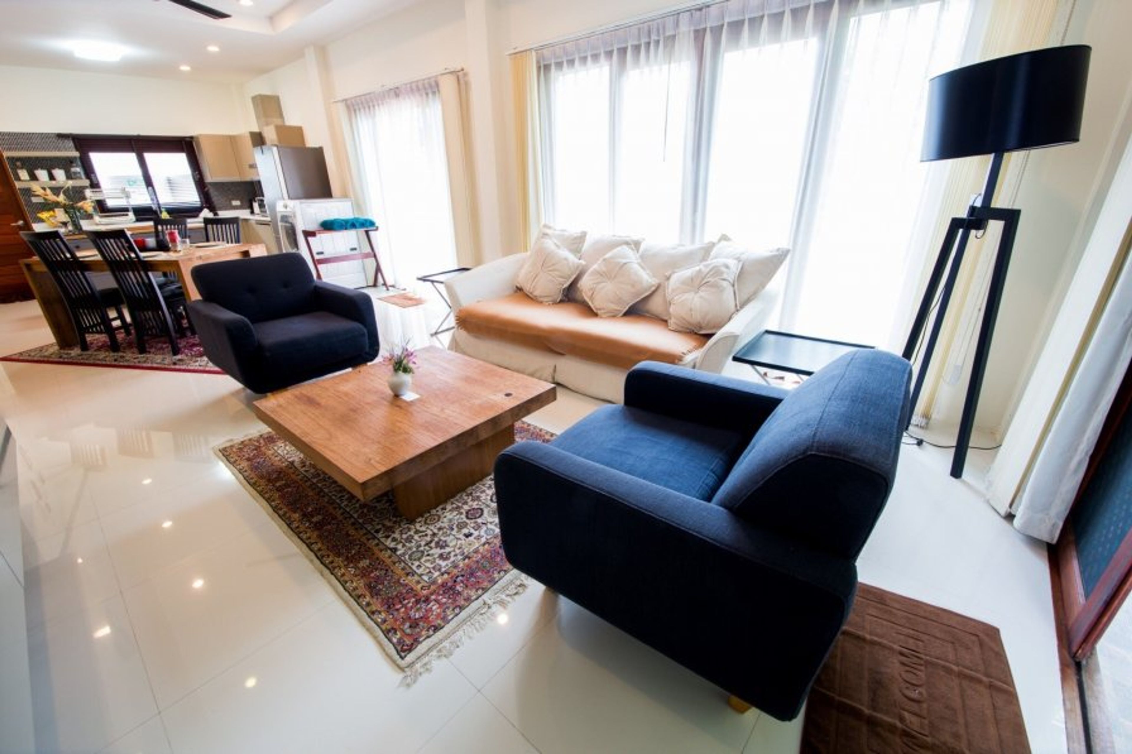 Large spacious and open plan living area with nonchalant, comfortable sofa and chairs.