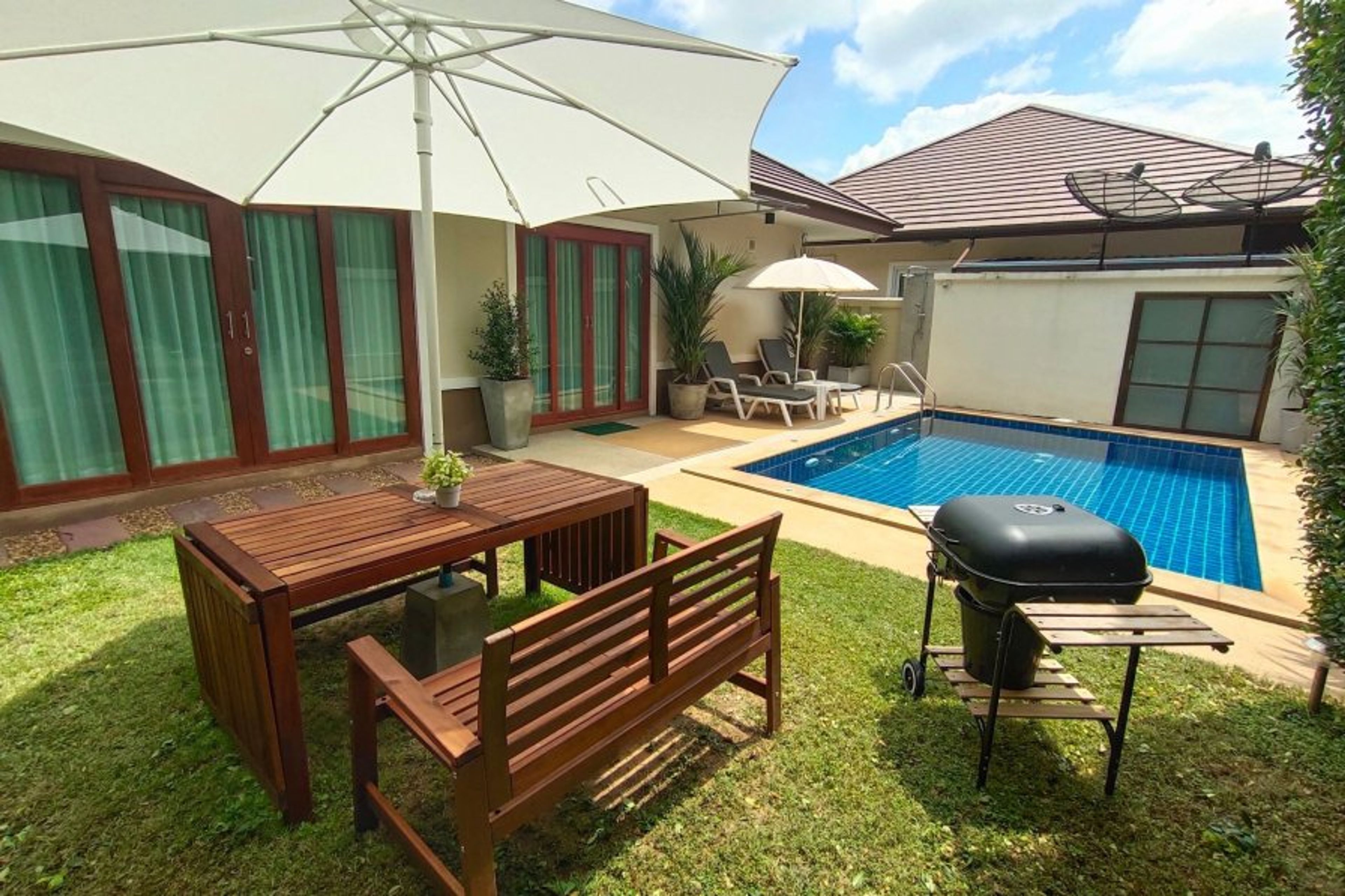 Aonang Private Pool Villa just 4.5 km away from bustling Aonang Beach. Our villa is nicely decorated with Teak tables and equipped with a modern kitchen, cuttery, barbecue grill and all room aircon