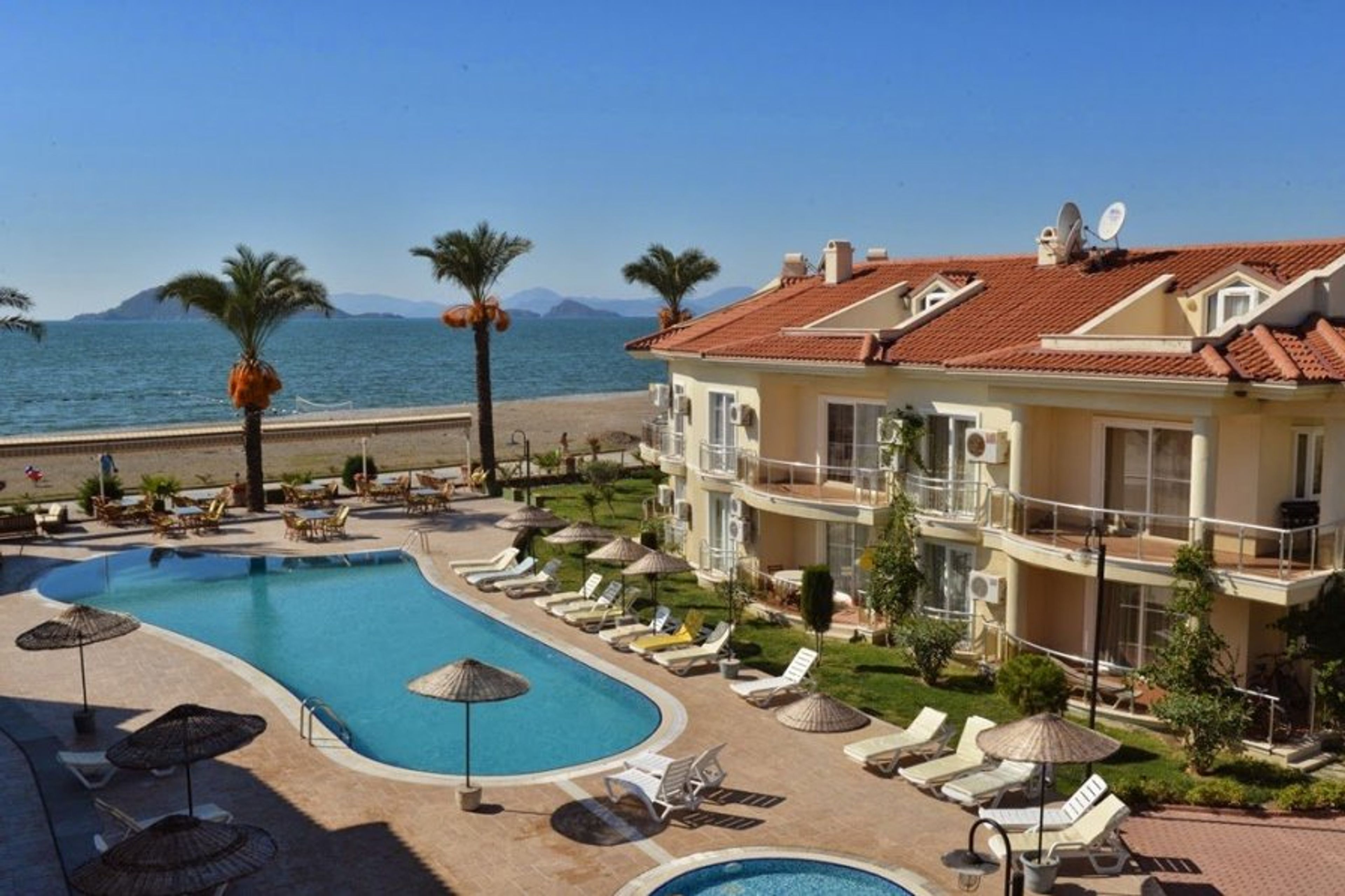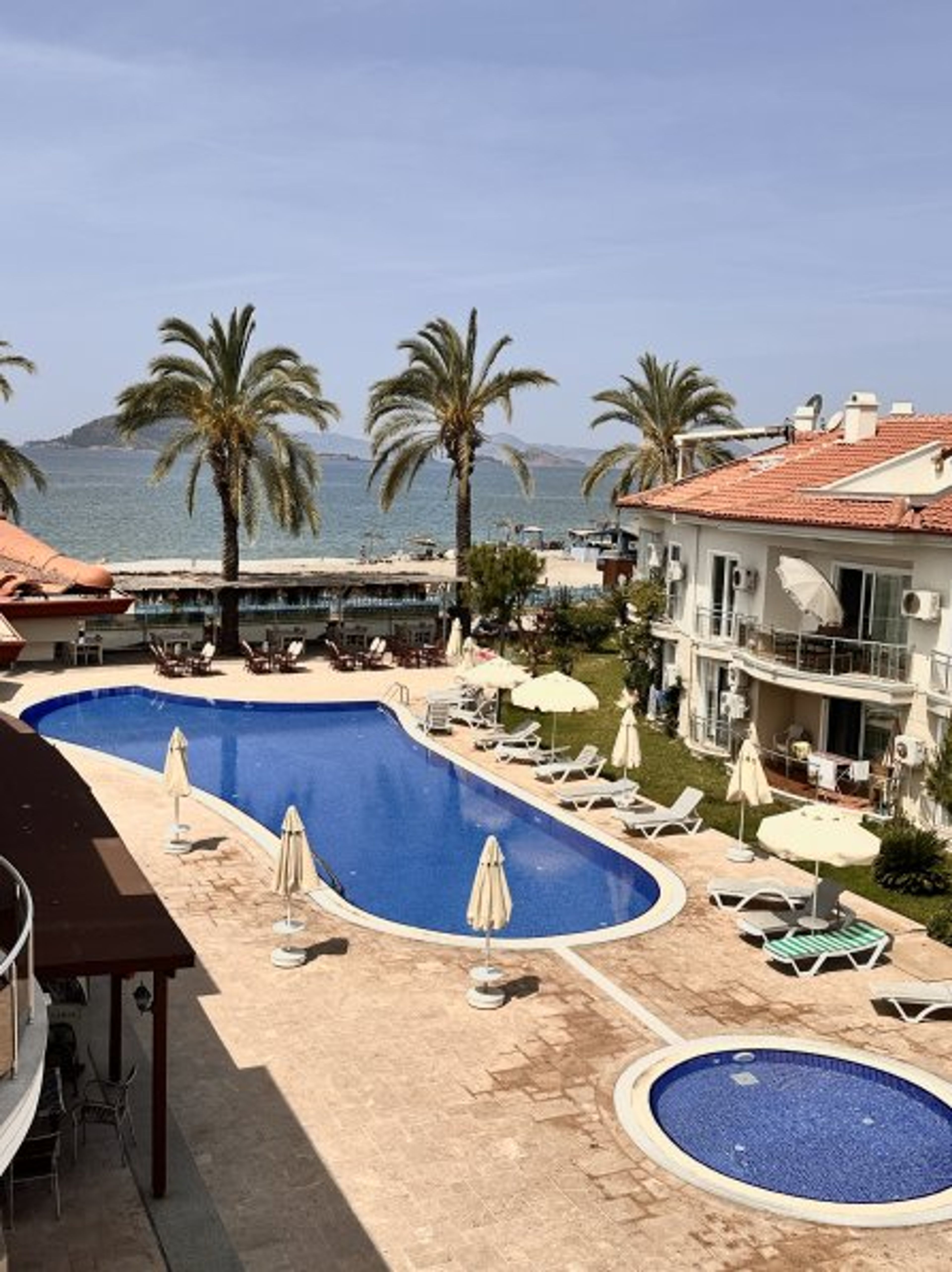 Property Features - Duplex Apartment - Communal Pools & Gardens - 3 Bedrooms - 2 Bathrooms - 2 Storeys (First Floor + Top Floor) - Sleeps up to 7 people ( 6 in bed and 1 on the sofa bed in the lounge.) Layout Of The Floors First Floor: - 1 double bedroom with French balcony and en-suite - 1 twin bedroom - 1 bathroom Open plan kitchen, lounge and dining area, private terrace with pool and garden views. Top Floor: - 1 double bedroom with en-suite - Attic terrace Bed Linens and Towels All bed linens and towels are provided in all our apartments and villas. Balcony, Terrace and Pool Equipment - Dining table & chairs - Appropriate number of sunbeds and umbrellas - Built-in BBQ on the balcony Nearest Beach Sunset Beach Club has its own beach in front of the complex. Services Included in Rentals - Air conditioning, Electricity, Water and Gas - Welcoming and key handling by our representative no matter what time you arrive, including early morning - Written and verbal information pack - Bed linens and towels available in the house - Cleaning and tidying before arrival - Mid stay cleaning, including change of bed linens and towels (for stays longer than 7 days) - Your rep is available at 24 hours, telephone number is provided - Grocery pack of food & beverage - 24 hours security in the complex Extra Services - Private Airport Transfers - Car Rental - Baby Cot - High Chair Facilities - Dish Washer - Washing Machine - Oven - Free Internet - Kettle - Iron - Iron Board - TV - Electronic Safe Box - Air Conditioning - Boiler - Hair Dryer - Refrigerator - DVD Player - Oven - Toaster - Cooking Pots & Utensils - Set Of Dishes & Cutlery Calis is a laid back, tranquil seaside resort with many restaurants, bars, cafes and shops. Calis centre is only a short stroll away from SUNSET BEACH CLUB and just outside the complex is a bus stop providing excellent transport facilities for visiting the nearby town of Fethiye and the surrounding areas of outstanding natural beauty. SUNSET BEACH CLUB holiday complex of Villas and Apartments comprises of 277 properties carefully positioned and divided up by beautiful gardens, refreshment areas, private and shared swimming pools. There are 33 luxury villas - each with a private swimming pool. SUNSET BEACH CLUB villas and apartments were built and completed between the years of 2008 and 2012 and is rated first class. The holiday resort complex of villas and apartments was meticulously designed to be built in planned stages to assure highest standards and to take into account the delicate surroundings and proximity to the sea. SUNSET BEACH CLUB holiday resort of Villas and Apartments currently has onsite staff working around the clock to manage, maintain, secure and service the complex. There are always friendly, professional English and Russian speaking employees on hand to answer any questions and available to assist in any emergency. Within the boundaries of the complex of Villas and Apartments are 7 swimming pools and 3 children's pools, a Spa centre with Turkish Bath. The highly trained staffs maintain the hygiene and cleanliness of these areas meticulously, regularly checking, monitoring and documenting the required PH levels. Facilities available on the complex of SUNSET BEACH CLUB villas and apartments are: - Private beach & sun loungers - Snacks and drinks bars - A la carte restaurant - 7 large outdoor swimming pools - 3 children’s swimming pools - Fitness centre & Sauna - Shop - 24 hour security -Allocated parking area The SUNSET BEACH CLUB holiday resort of villas and apartments is walking distance to the shops and Markets. The centre of Calis town is 10 minutes walking distance. You can find lots of bars, restaurants and Cafes on Calis Centre.