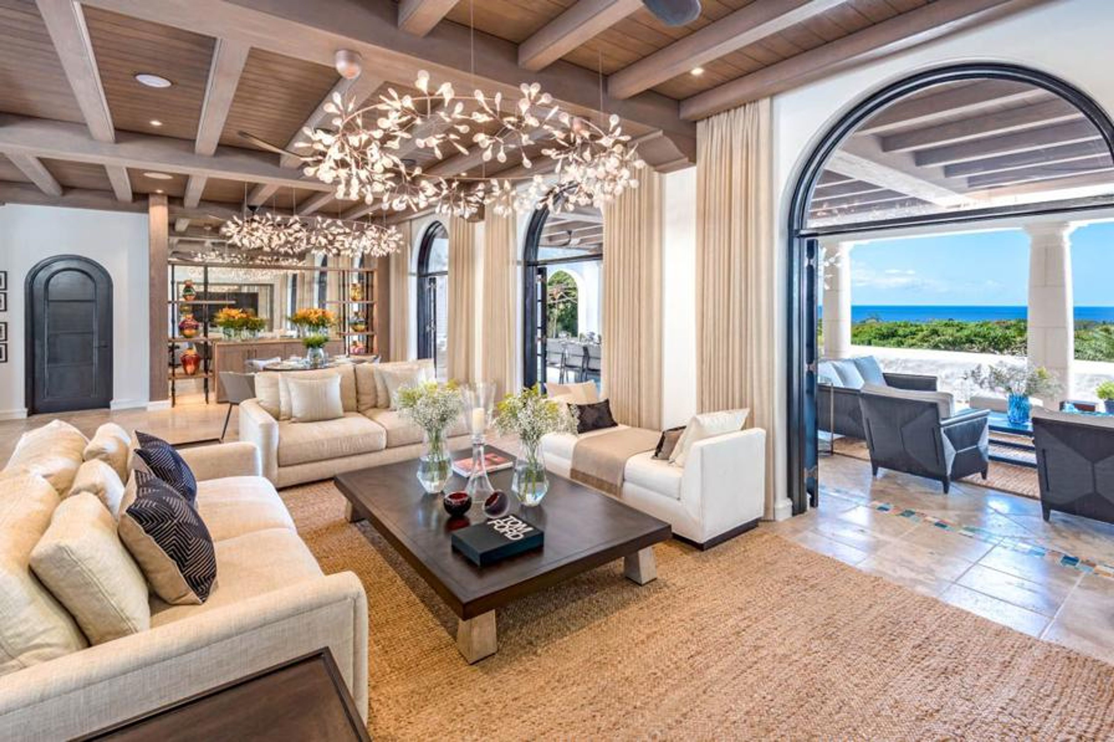 Between the main house and the east wing is a freeform swimming pool adjoining an inviting covered patio furnished with deep sofas, board games and a bar.