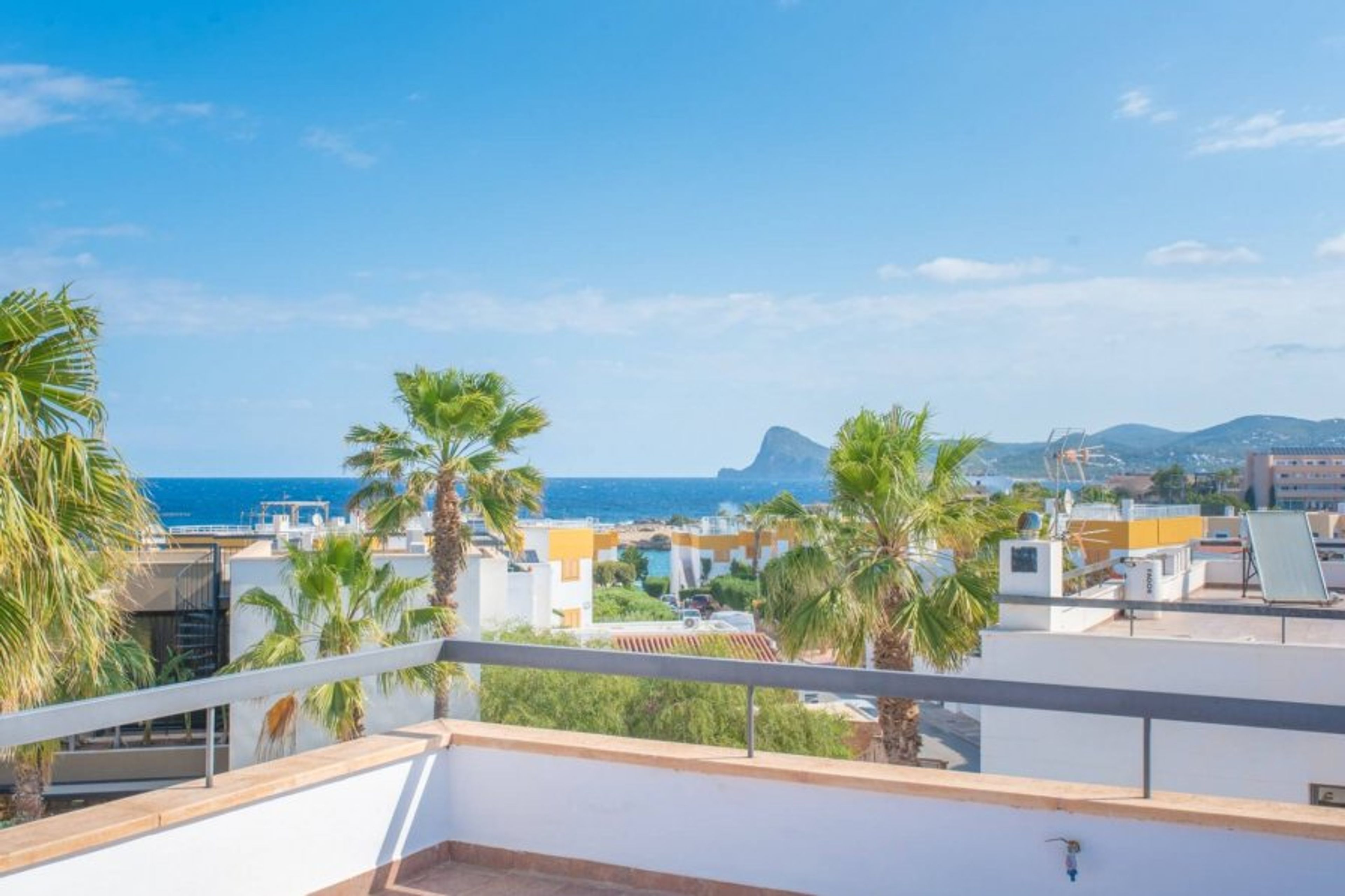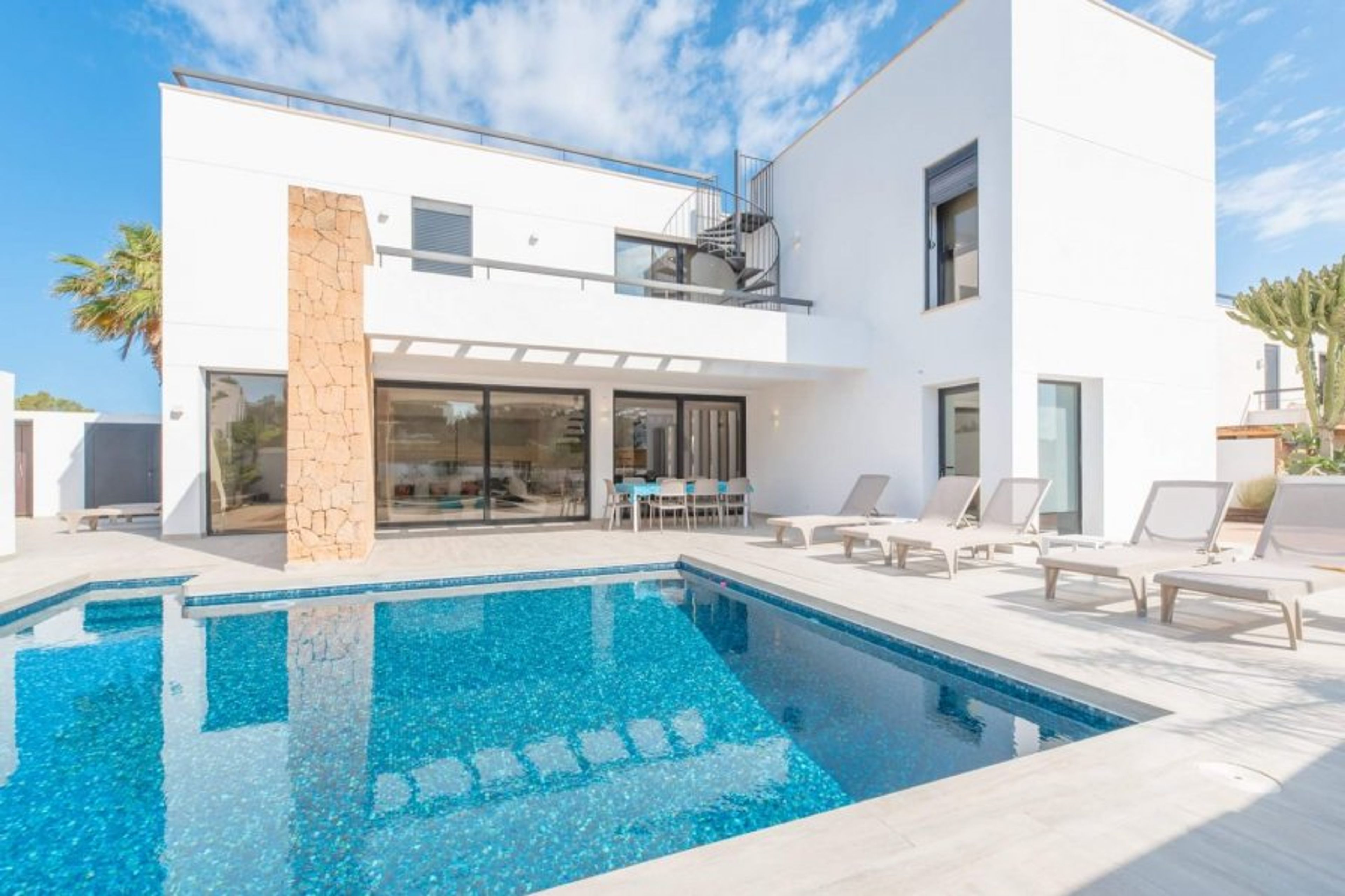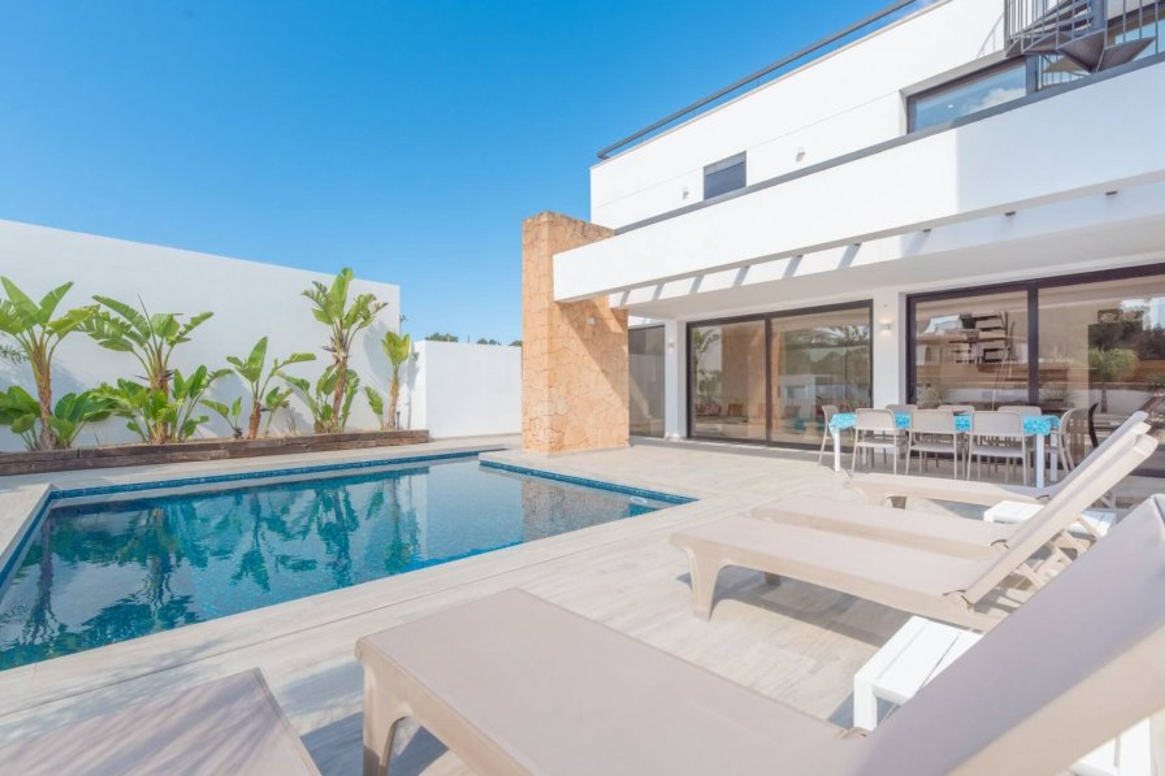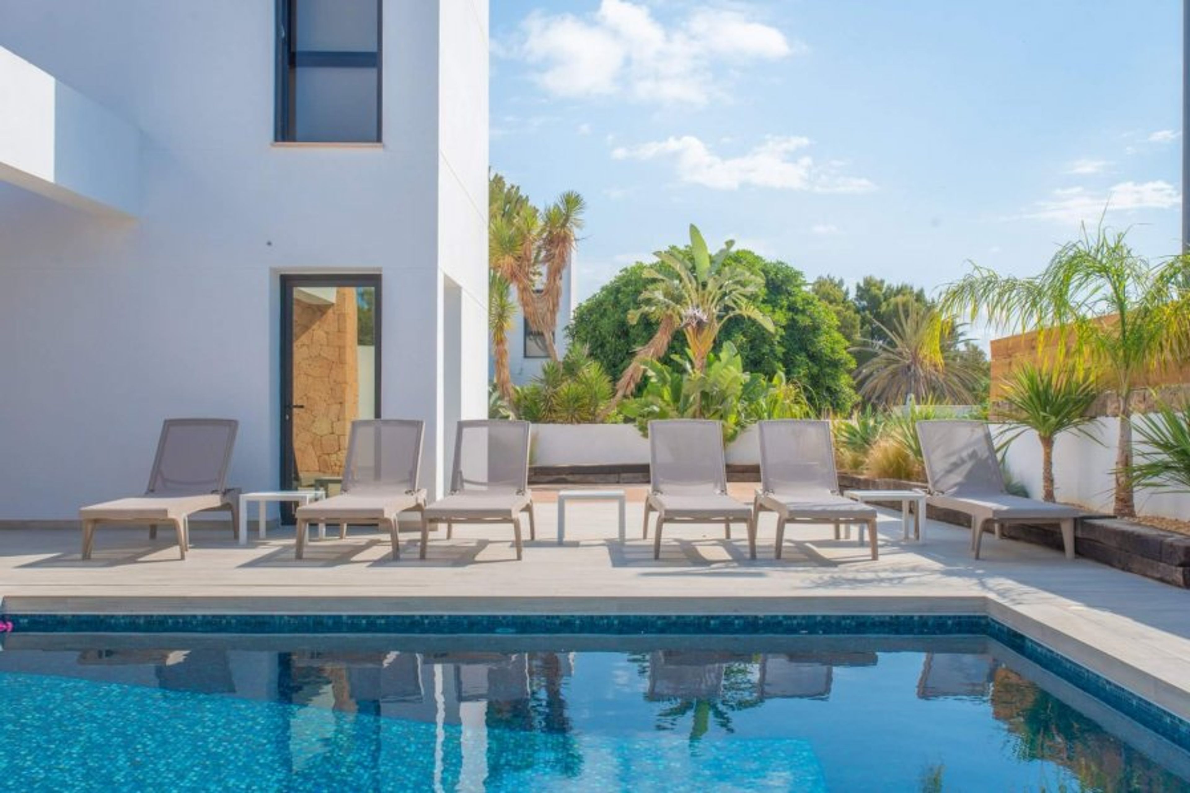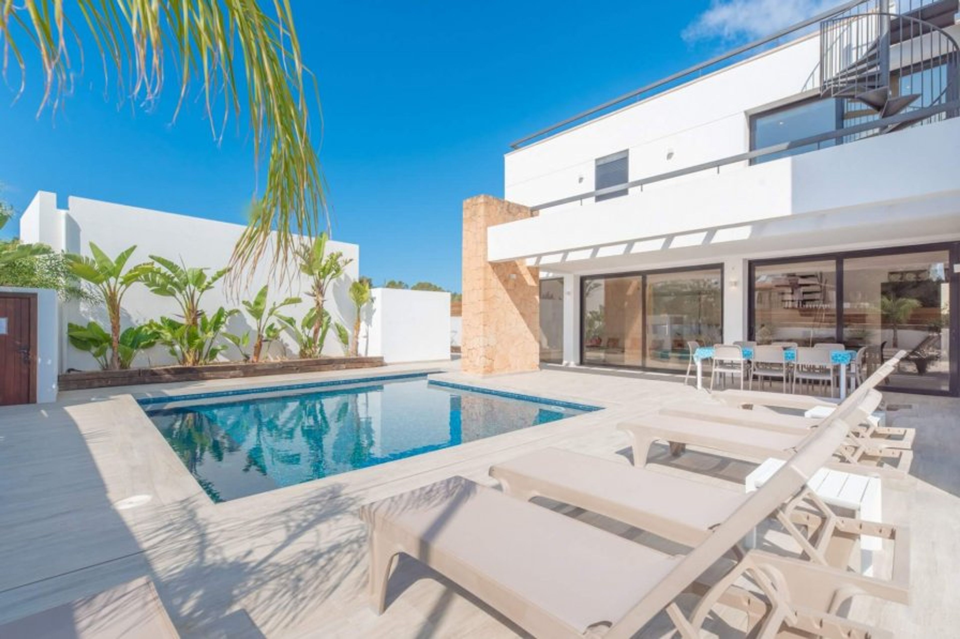 Modern villa a few meters from the beach of Port des Torrent, built on two floors, with a private pool. Managed by iHouseibiza agency, best price on our site. It has 4 bedrooms, three with a double bed and one with two single beds, it has 3 bathrooms, one of them en suite with a bathtub. The lower floor has a large and comfortable living room, with a fully equipped American kitchen, which opens through large windows to the pool area. The house has air conditioning and wifi. We have access to the Port des Torrent beach by walking about 5 minutes, where we can enjoy the sunset; In this cove we have 3 restaurants and a beach club. A few km away are the beautiful coves of C Bassa and c. Conta, the city of San Antonio and San José. The airport is about 20 minutes away. Mediterranean breakfast available every morning at the Eat is Life restaurant on the beach