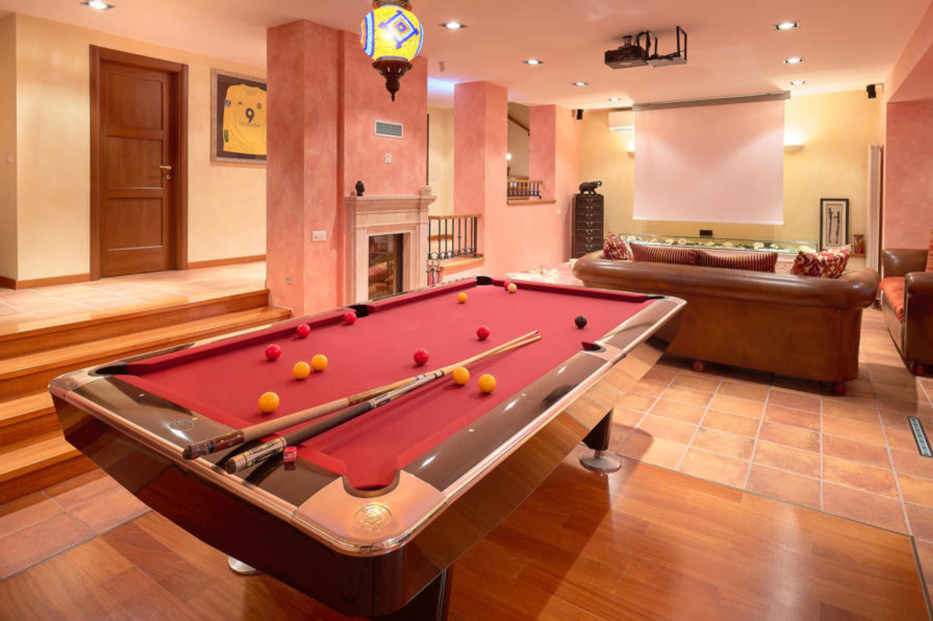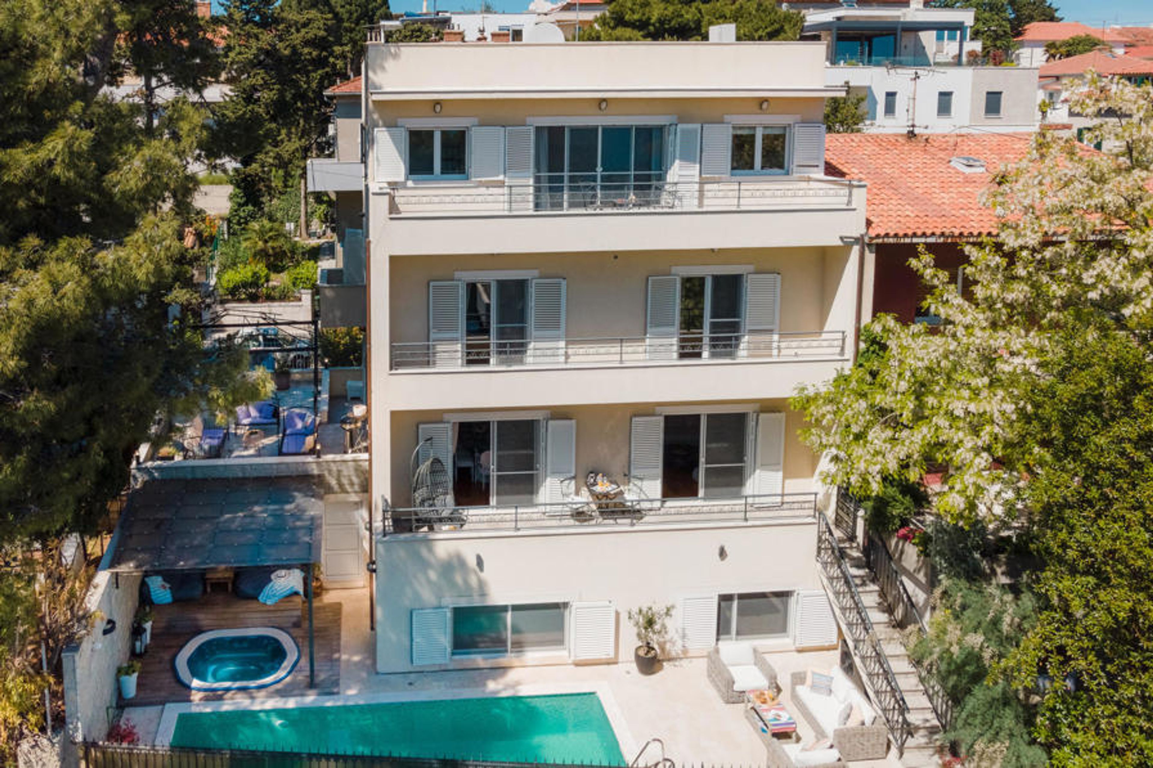 Would you like to spend your holiday in one of the most beautiful parts of Split? Here you are less than a five-minute walk from the most famous city beach in Croatia: Bacvice beach! This beautiful villa extends over the wine cellar, the ground floor with an activity room with projector and three more floors with a cloakroom on the top floor. The holiday home is modern and furnished with tasteful designer furniture. There are several different terraces with an outdoor pool and whirlpool on the ground floor. The old town centre is approx. 1.2 km away and can be easily reached on foot.