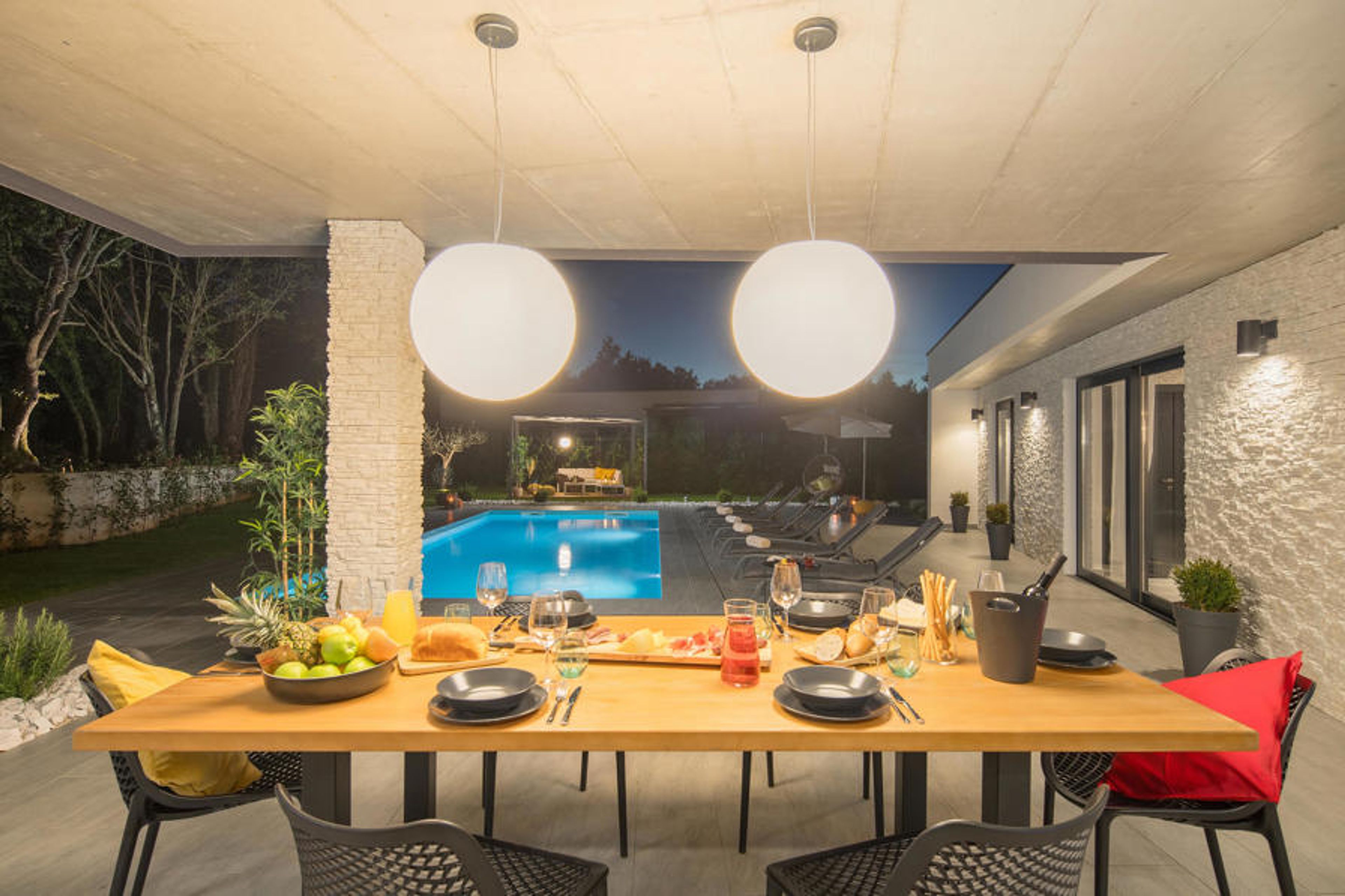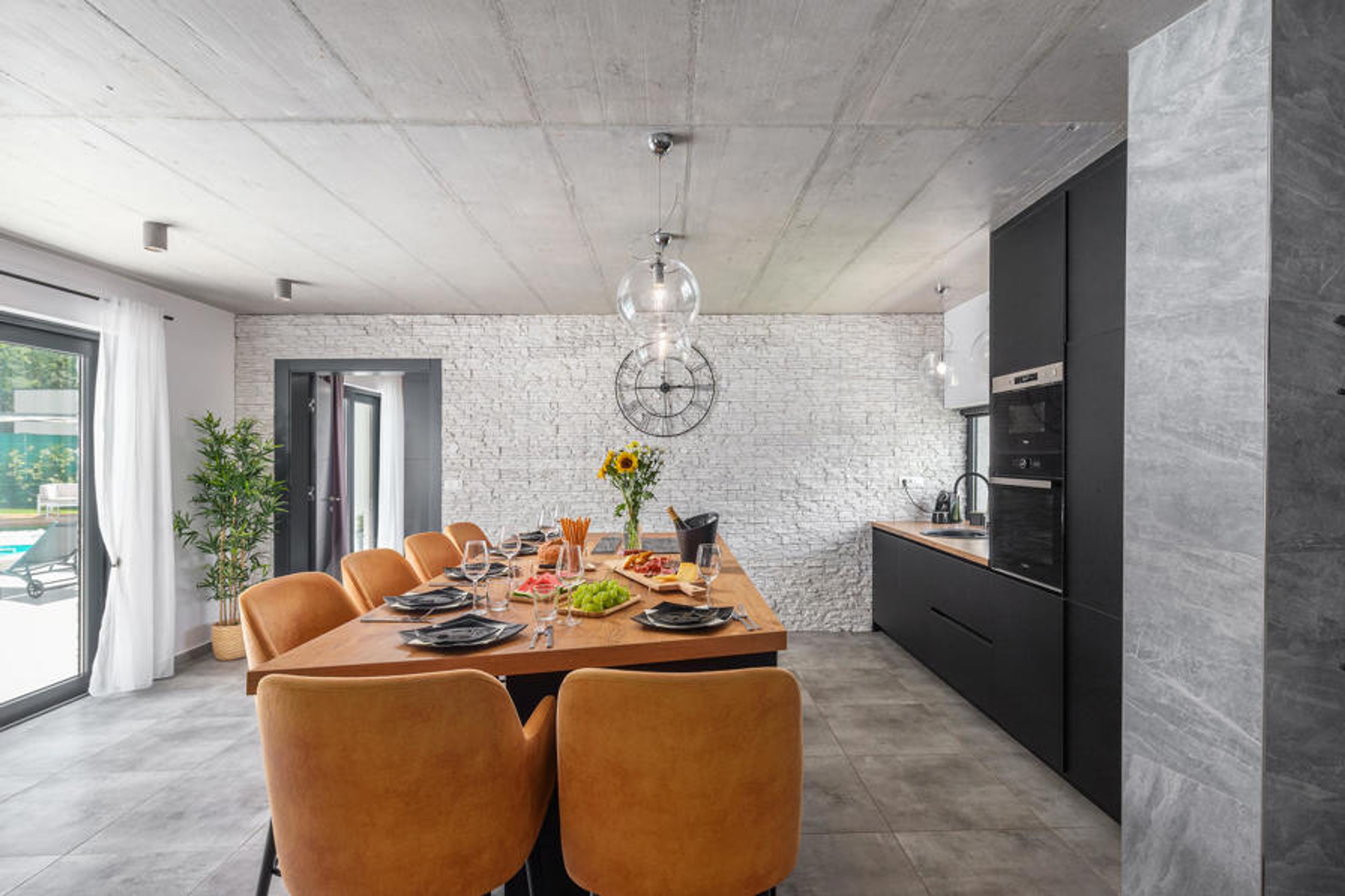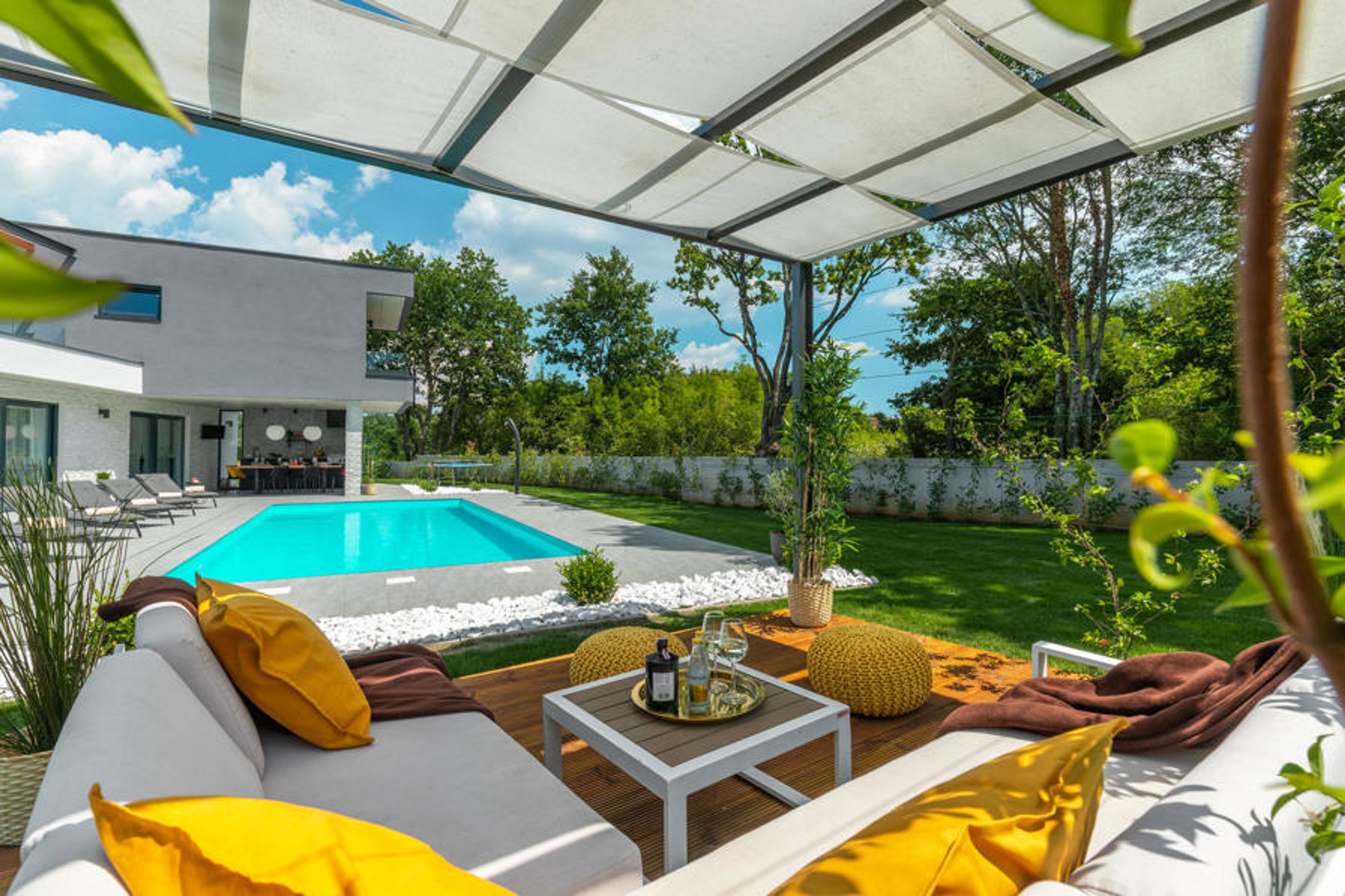 The house impresses with quality and functionality, while the elegant appearance brings that certain something to the fore. Here you will live in the interior of Istria, surrounded by greenery on an approximately 1,000 m² fenced plot, which offers peace and privacy. The interior extends over the first floor and the second floor. The open spaces consist of a large living room with kitchen and dining area, which skillfully reflects modern elements. Each bedroom has its own bathroom, along with air conditioning and television.