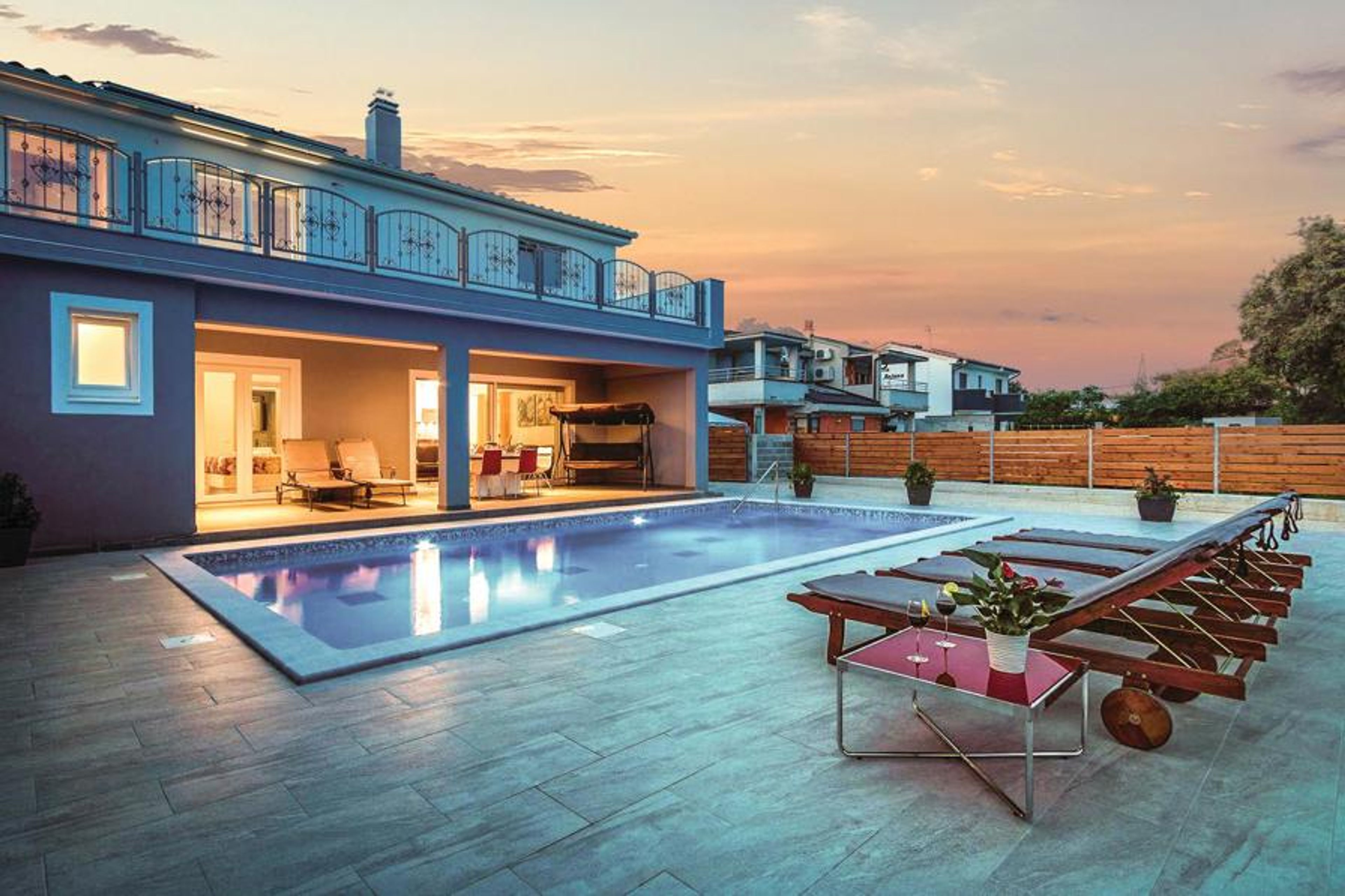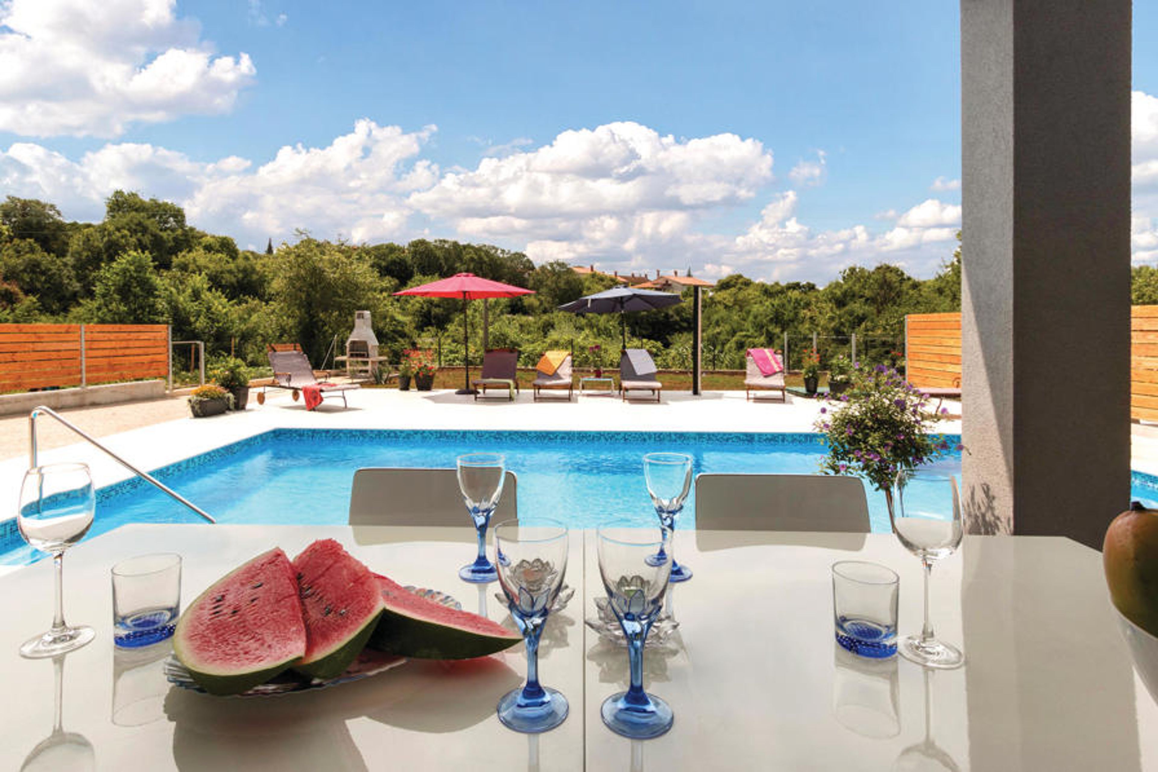 This bright and modern furnished semi-detached house is the ideal setting for a relaxing vacation in Stinjan, not far from Pula. The elegant accommodation with three bedrooms is located on the first floor. The surroundings are green and natural. In the courtyard next to the very well equipped semi-detached house is the spacious outdoor pool, which offers you the most beautiful moments, and the terrace with sun loungers. In Stinjan you will find rocky coast and pebble beaches. A few kilometers north you will find Fazana with more beautiful beaches and an excursion boat that will take you to the National Park Kornati. Pula is the largest city in Istria with restaurants, cafes, stores and numerous cultural and historical attractions.