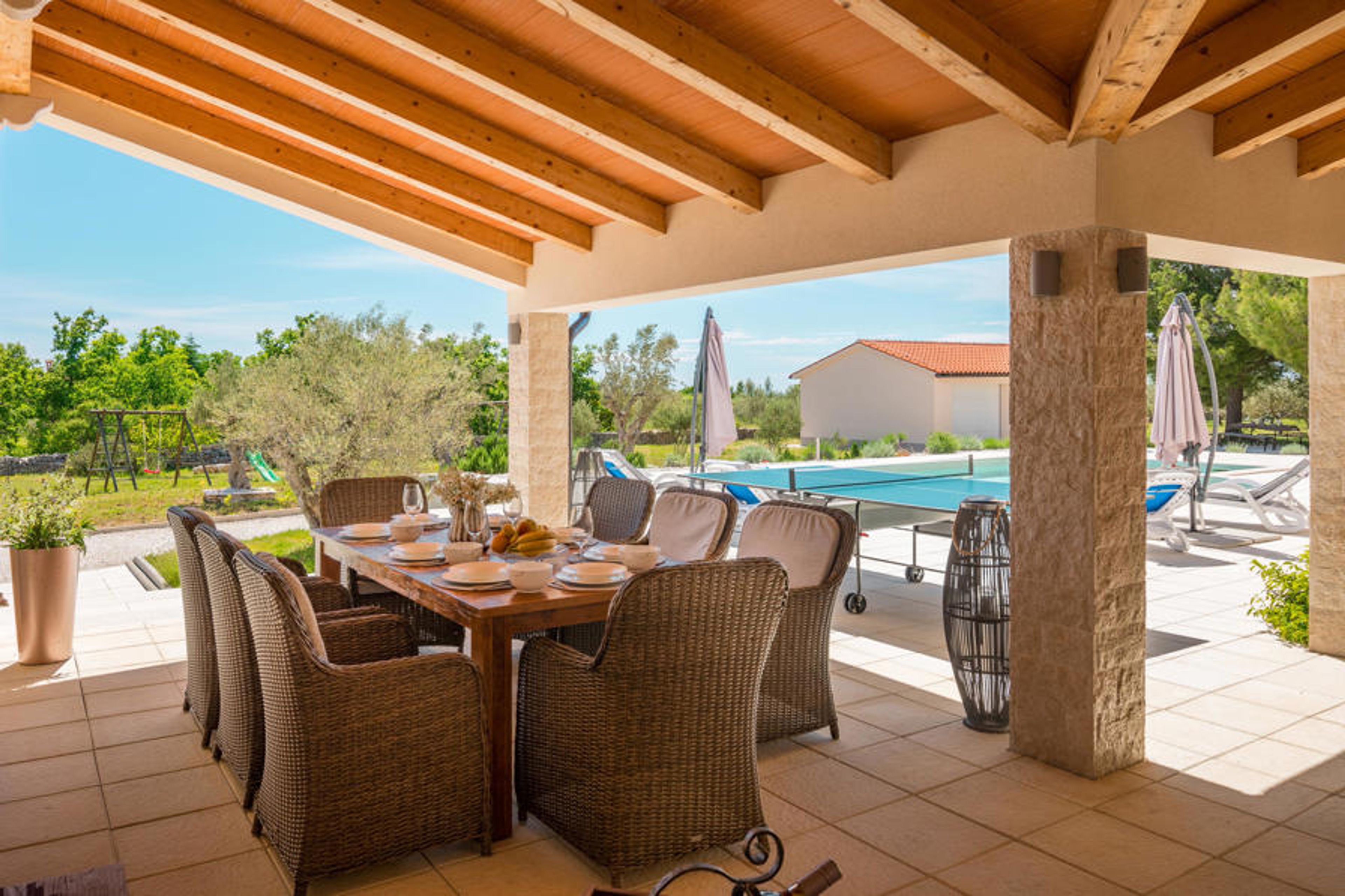 This luxurious holiday home with pool is located in a small Istrian village next to Vodnjan, not far from Pula, the largest city in Istria. The house is situated on a fenced plot with a beautiful olive grove and offers many leisure activities. Every detail in the house has been lovingly planned to maximise comfort and ensure a pleasant stay. There are four bedrooms, three of which have en-suite bathrooms. For your physical wellness there is a fitness room, sauna and massage chair. You can spend convivial hours in the Istrian konoba. Enjoy the many covered terraces and the sun deck by the pool as well as the Mediterranean garden with aromatic herbs and plants.